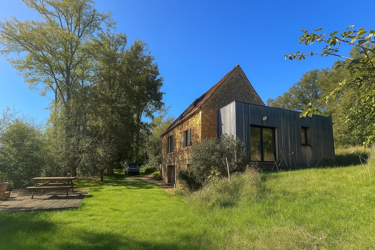 La maison de 117 m² habitables allie avec élégance le charme de l’ancien et une extension contemporaine en bois, créant une atmosphère chaleureuse et lumineuse.
