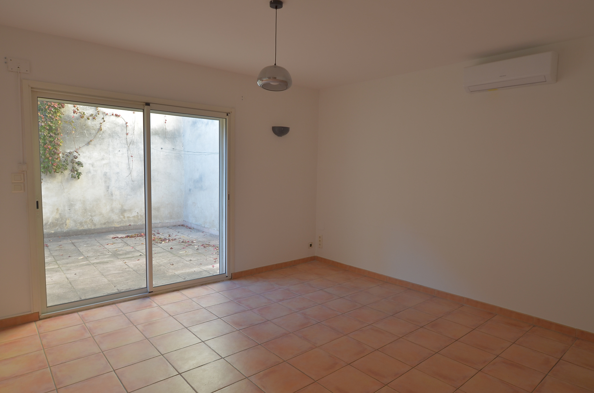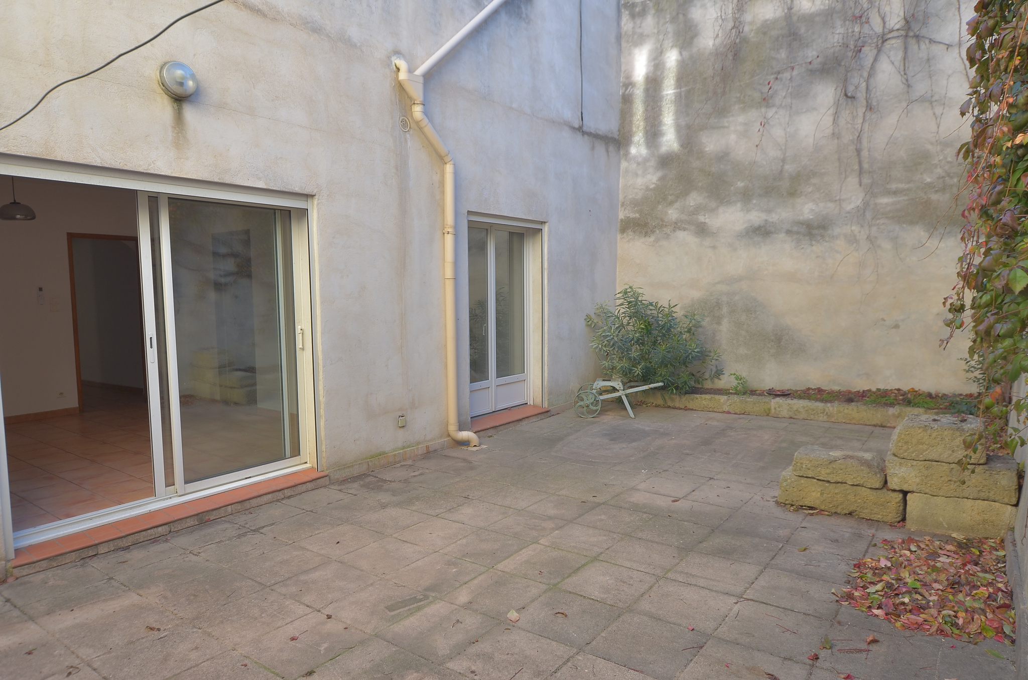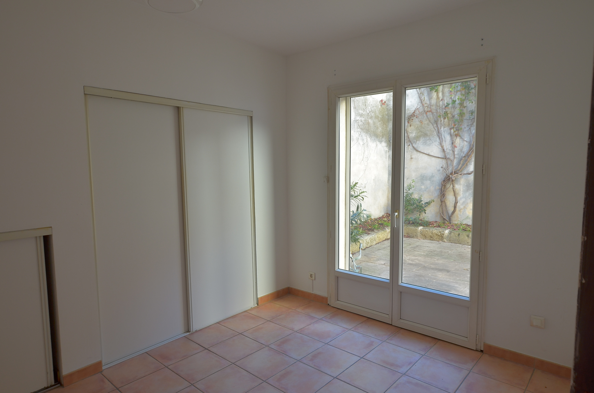 Appartement de type P2 en rez de chaussée 53 m2 en centre ville de Vauvert, grande cour intérieure privative, cuisine semi aménagée, avec un placard et un cagibi. une pièce à vivre et une chambre donnant sur la cour.