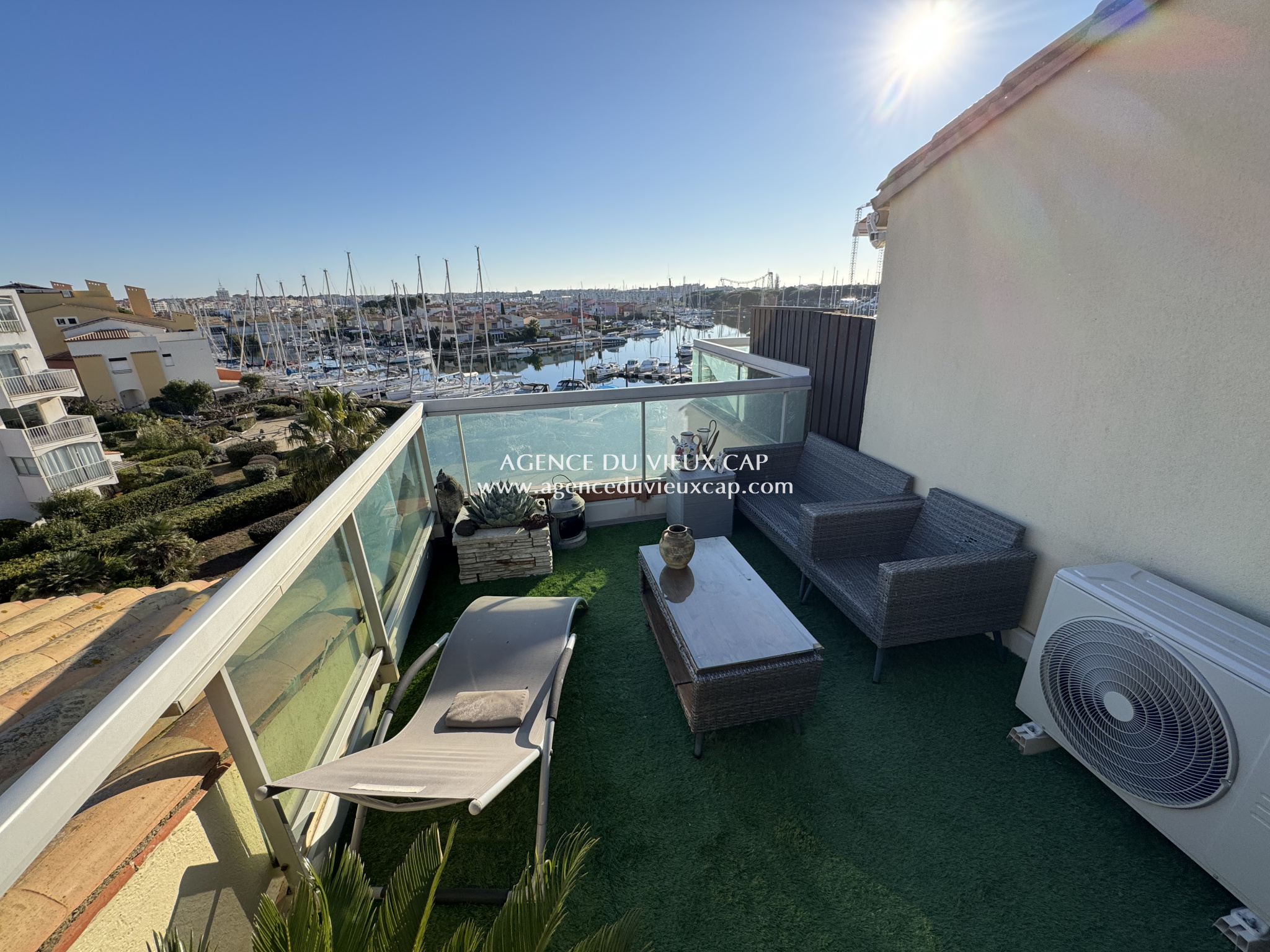 (EN DELEGATION) VENTE CAP D'AGDE DANS LE SECTEUR MALFATO T2 DUPLEX ENTIEREMENT RENOVE AVEC GOUT - VUE SUR PORT + PARKING. Situé au 3ème étage sans ascenseur, d'une surface de 46.78 m2 loi carrez, il dispose d'une entrée avec une ancienne cabine modifiée en buanderie, une salle d'eau avec douche et lavabo, un WC indépendant, un beau séjour avec une cuisine ouverte entièrement équipée, une première terrasse de 5.25 m2 avec belle vue sur le port ; A l'étage une grande chambre avec un coin détente d'une surface de 14,47 m2 et une deuxième grande terrasse de 12,41 m2 avec vue sur le port. Climatisation réversible. Entièrement rénové ! Bien d'exception ! Bien soumis au statut juridique de la copropriété. Montant annuel quote-part du budget prévisionnel vendeur : 1392.00 EUR - Prix : 228 000 EUR TTC (Honoraires d'agence à la charge du vendeur). Consulter notre barème d'honoraires : www.agenceduvieuxcap.com/honoraires.html Les informations sur les risques auxquels ce bien est exposé sont disponibles sur le site Géorisques