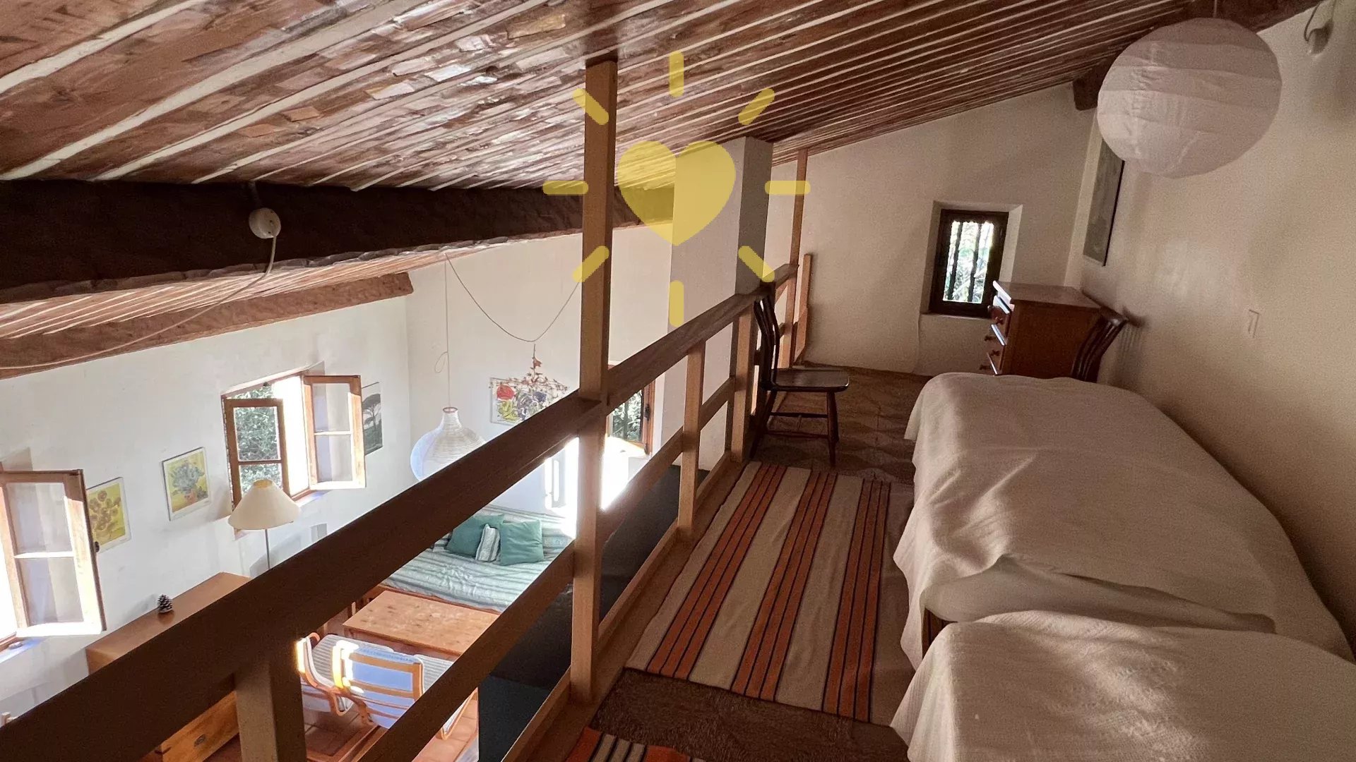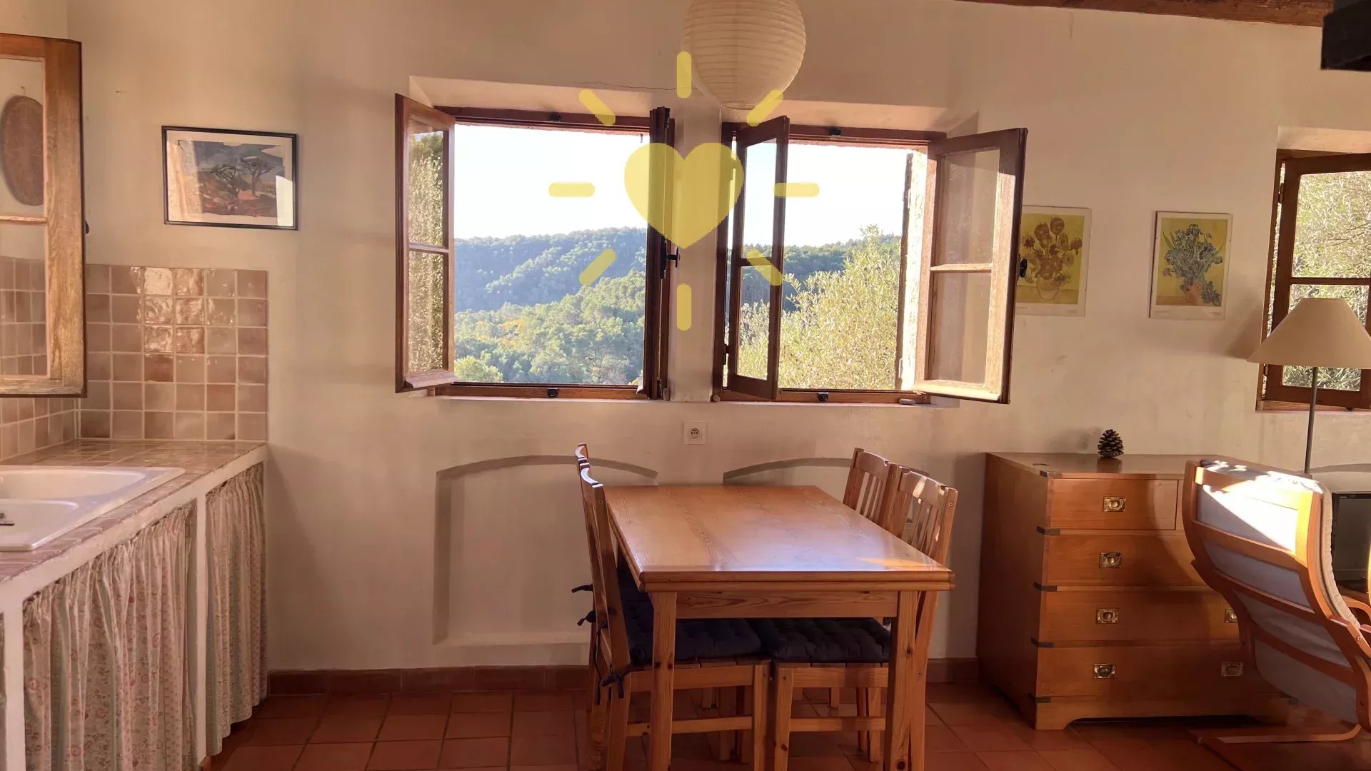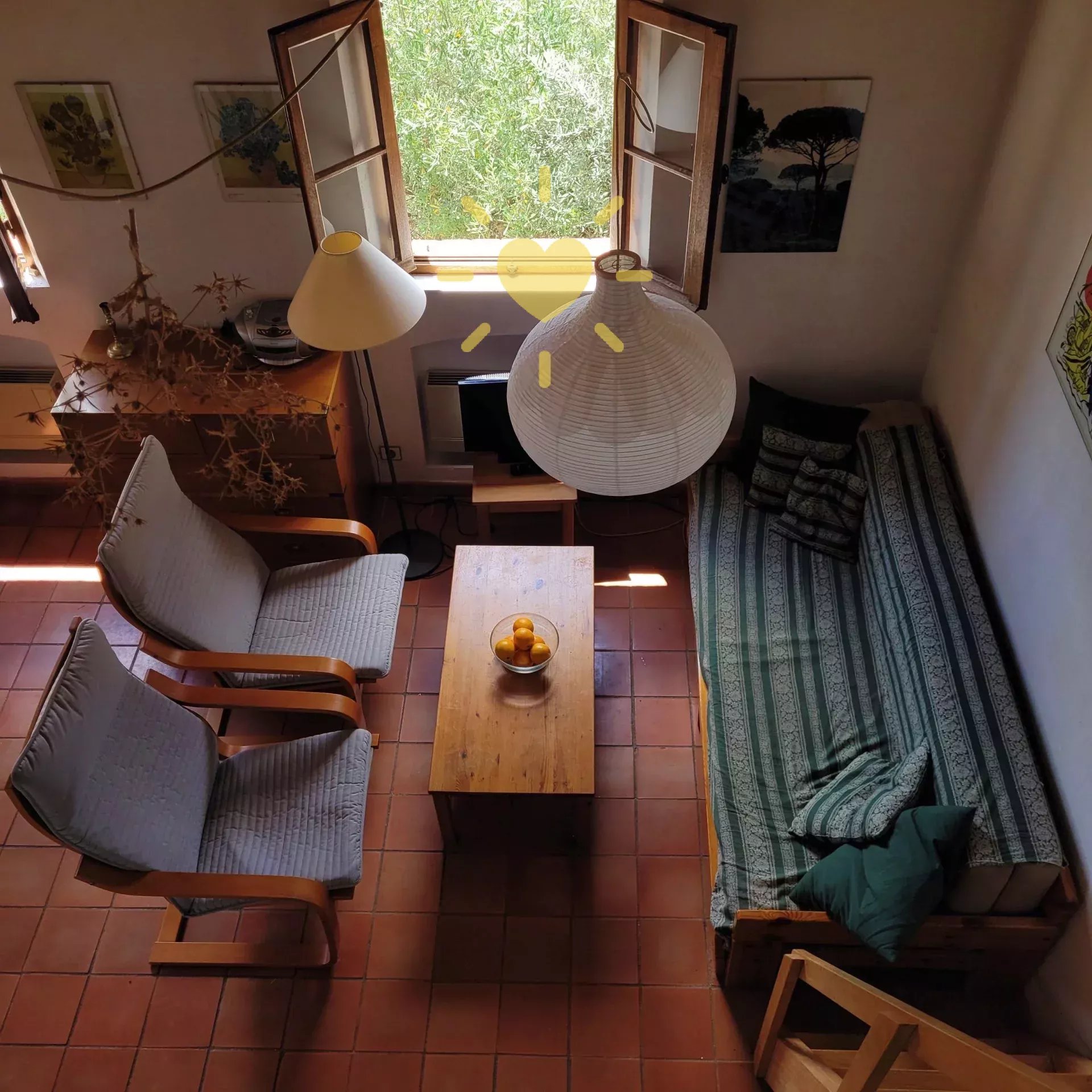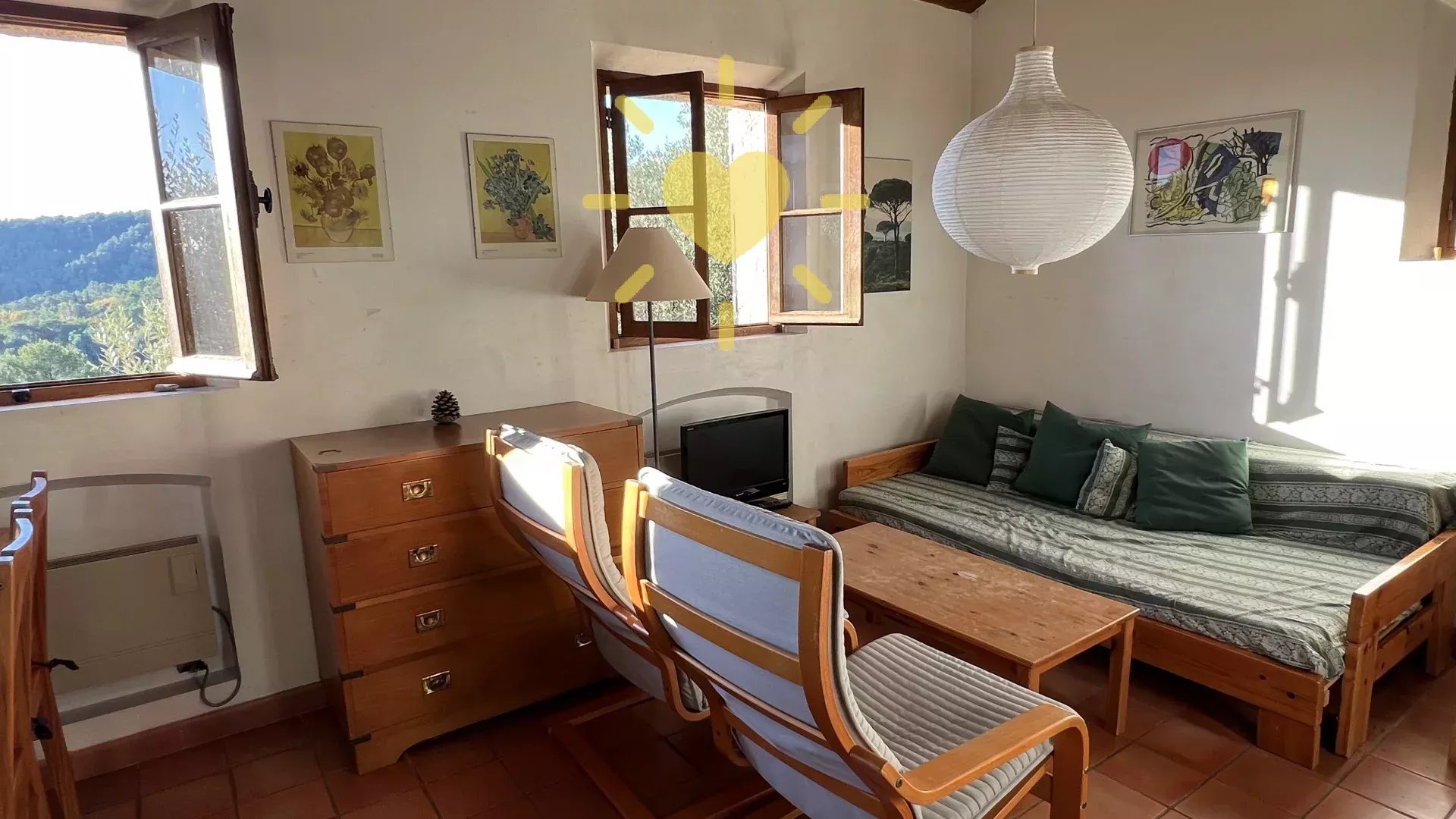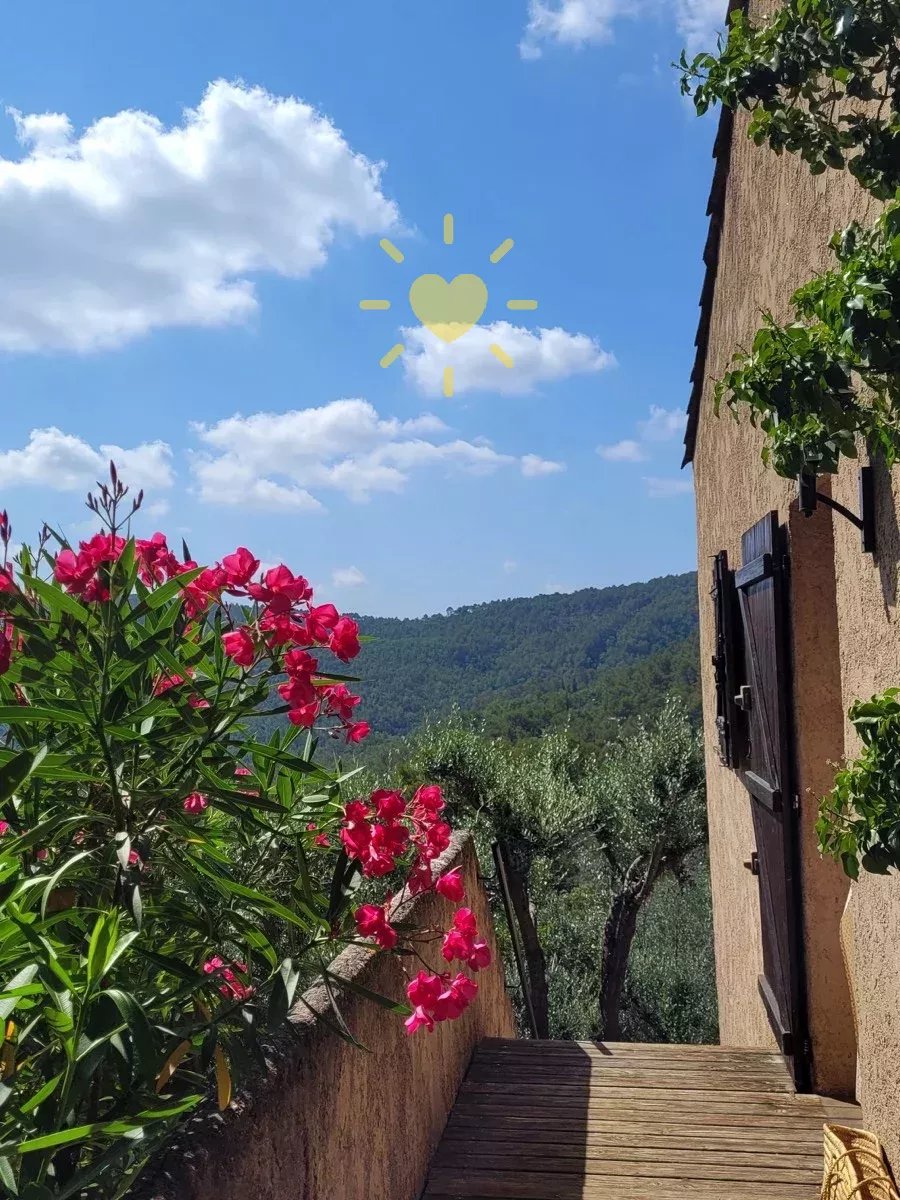 Sur un terrain de 2 200 m2, villa de 65 m2 habitable, au milieu des oliviers et comprenant : Rez-de-chaussée : entrée, séjour avec cheminée et cuisine, espace bureau, mezzanine. Rez-de-jardin : chambre, salle d'eau avec WC, débarras. Très jolie vue sur la campagne, exposition Sud. Surface totale : 77 m2.