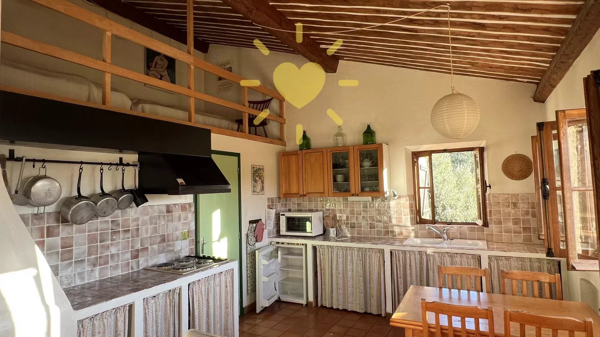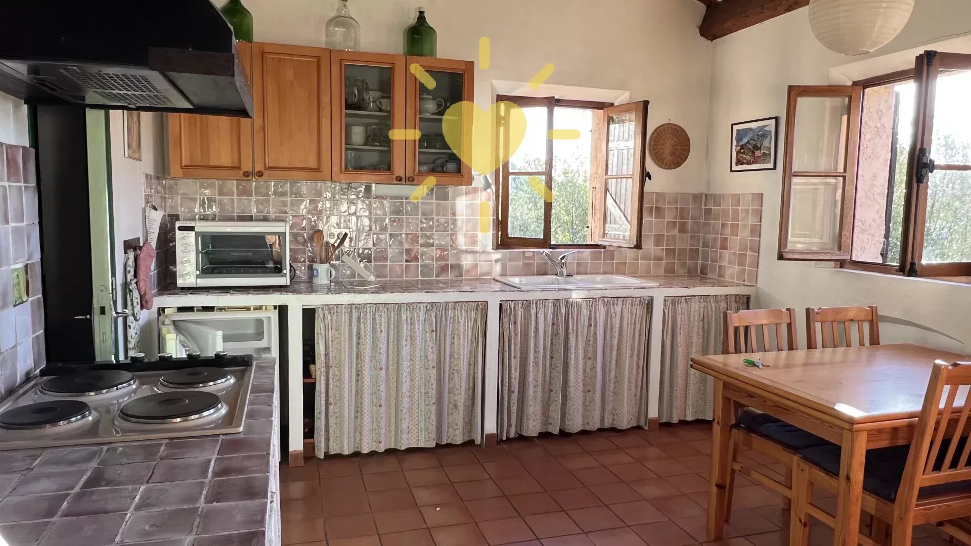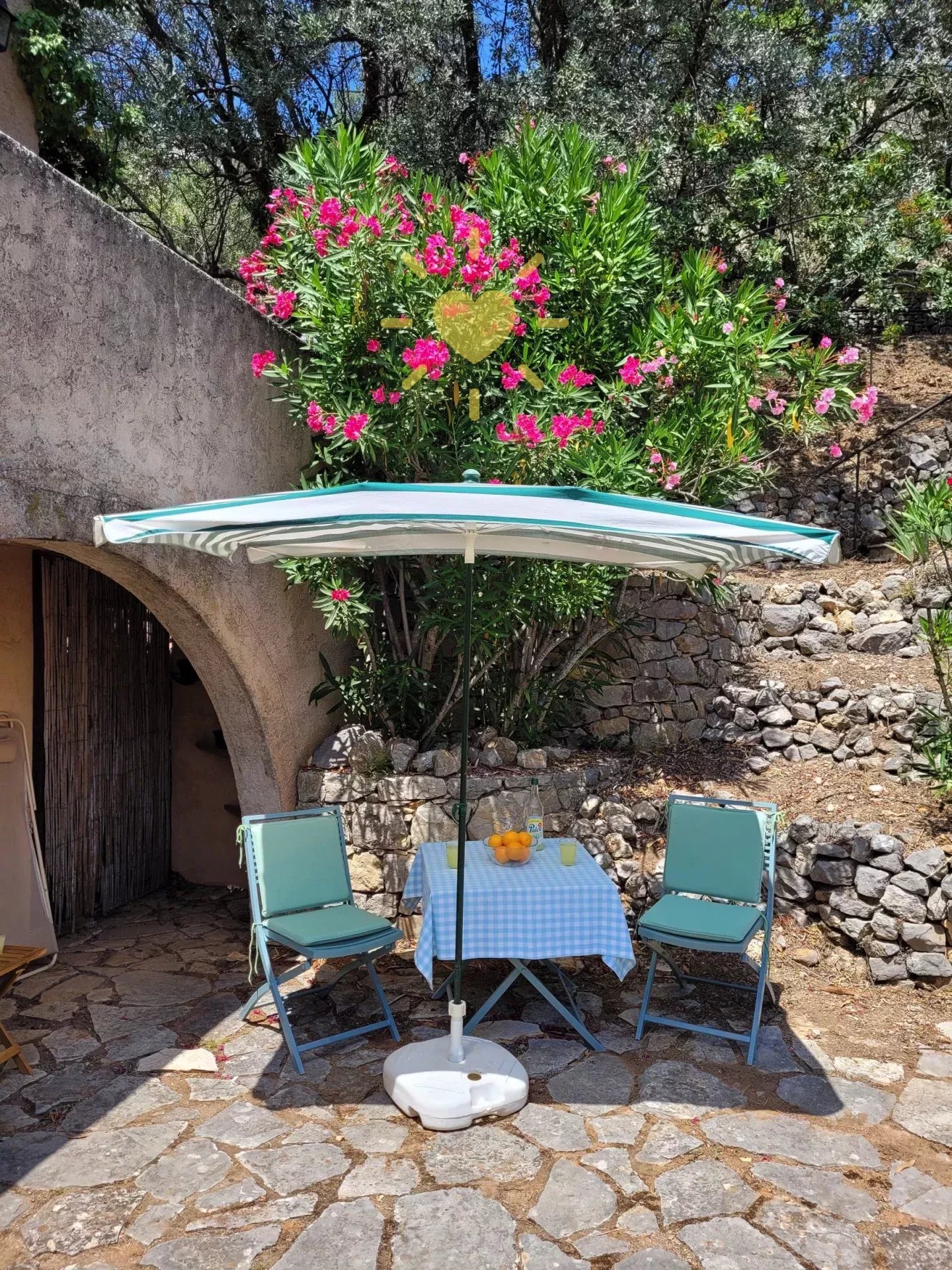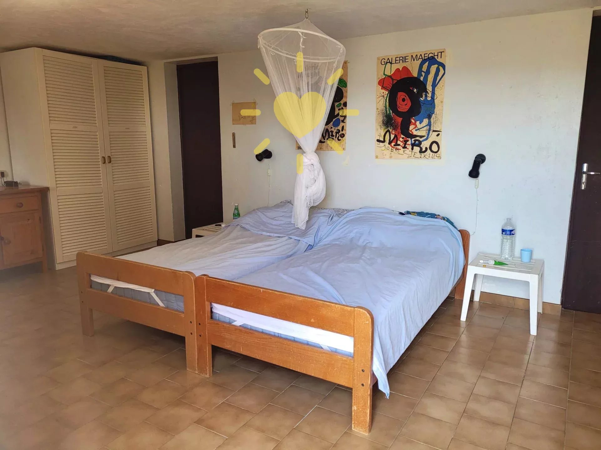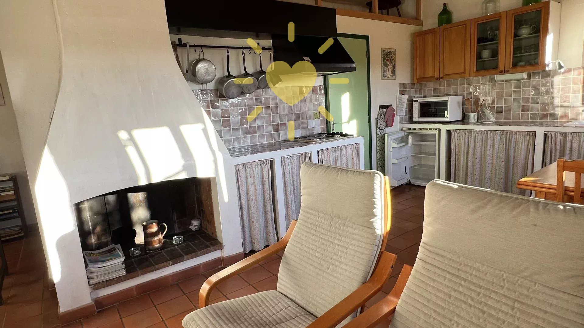 Sur un terrain de 2 200 m2, villa de 65 m2 habitable, au milieu des oliviers et comprenant : Rez-de-chaussée : entrée, séjour avec cheminée et cuisine, espace bureau, mezzanine. Rez-de-jardin : chambre, salle d'eau avec WC, débarras. Très jolie vue sur la campagne, exposition Sud. Surface totale : 77 m2.