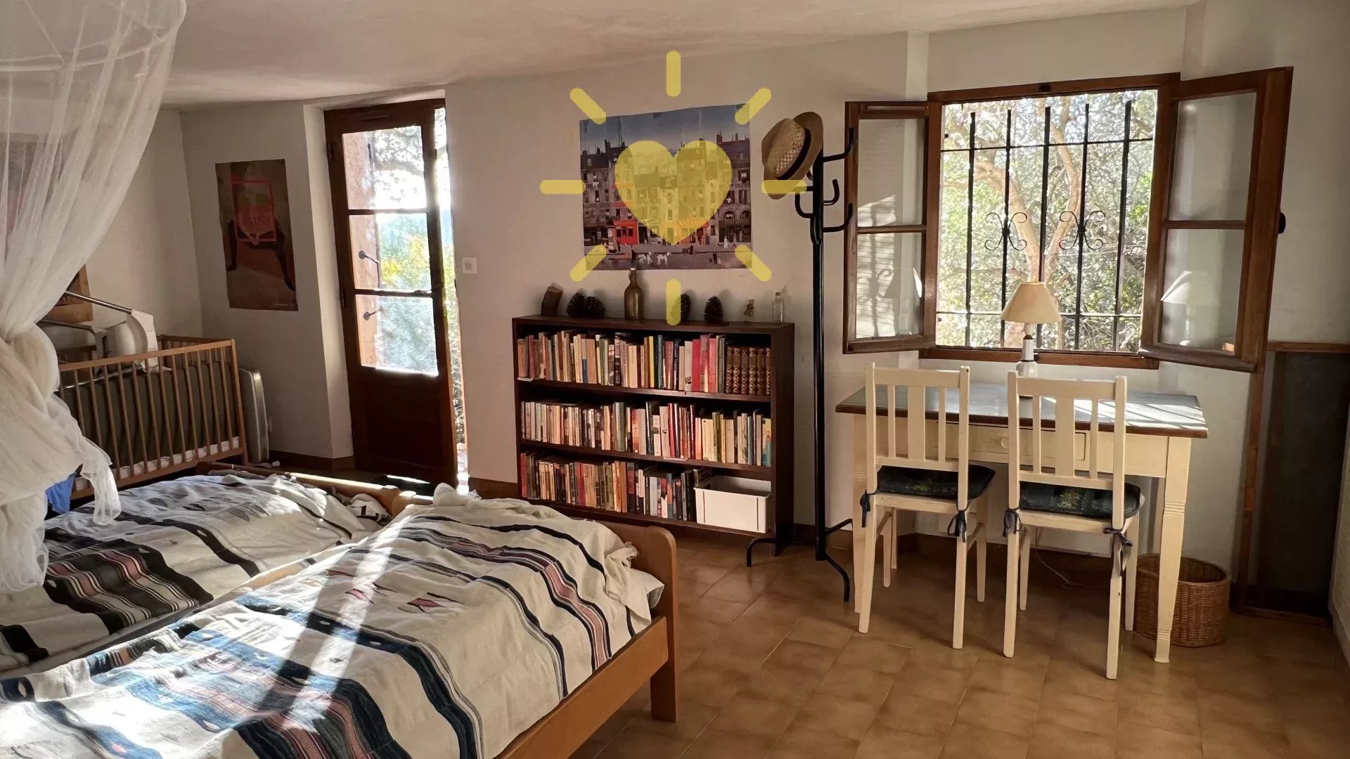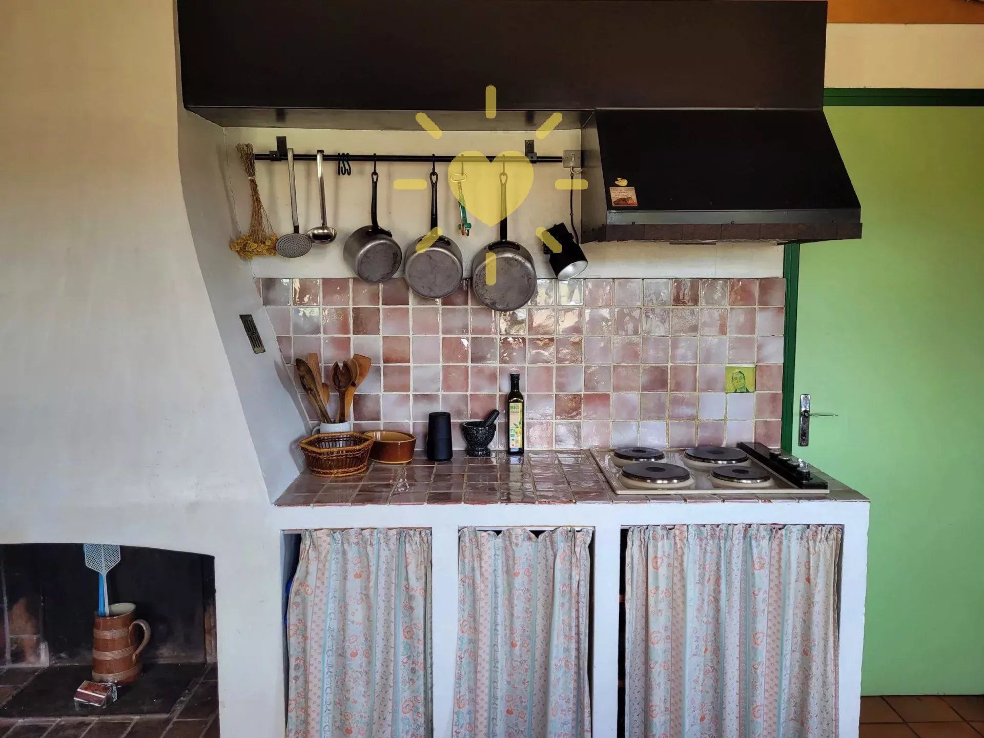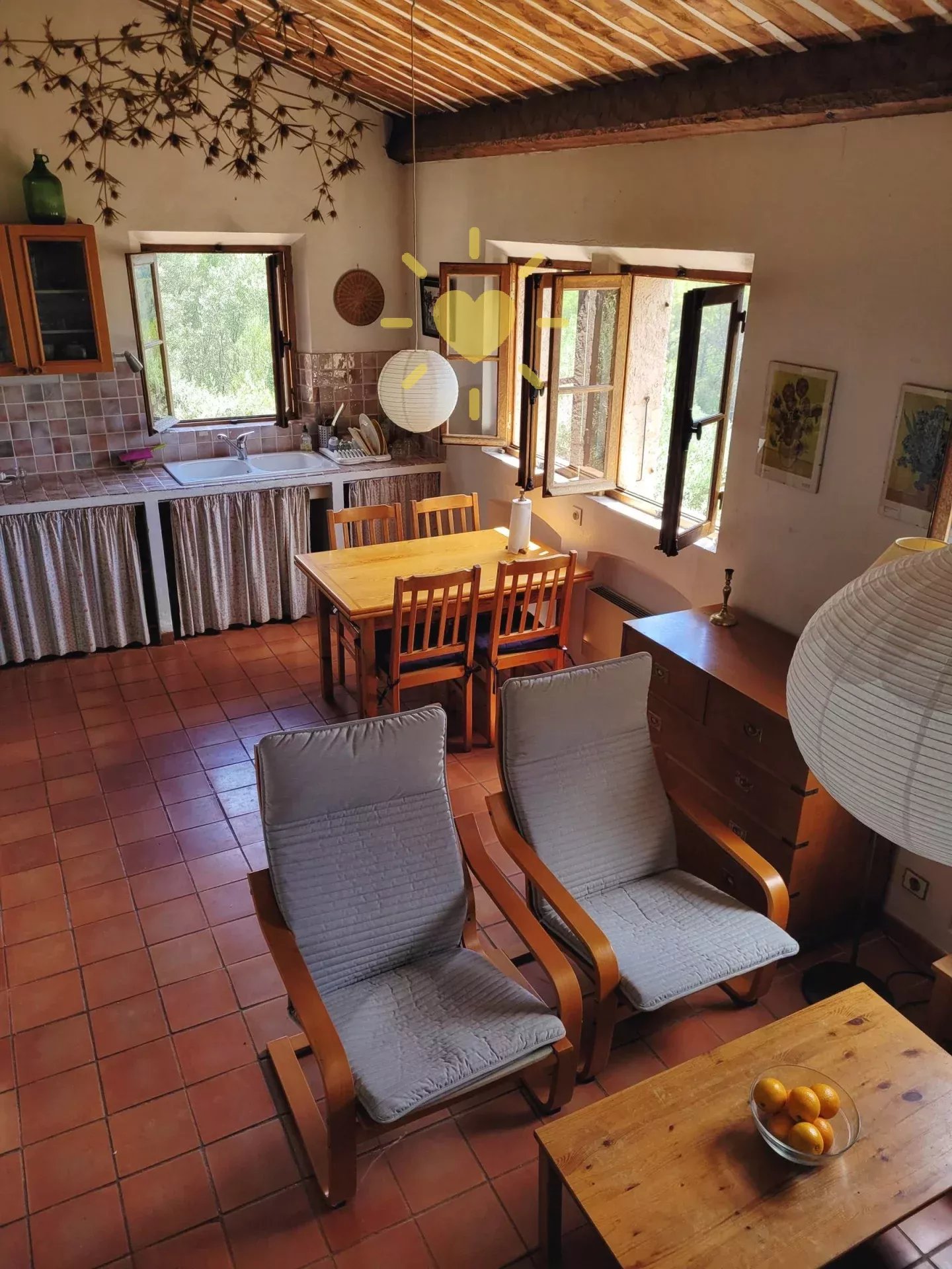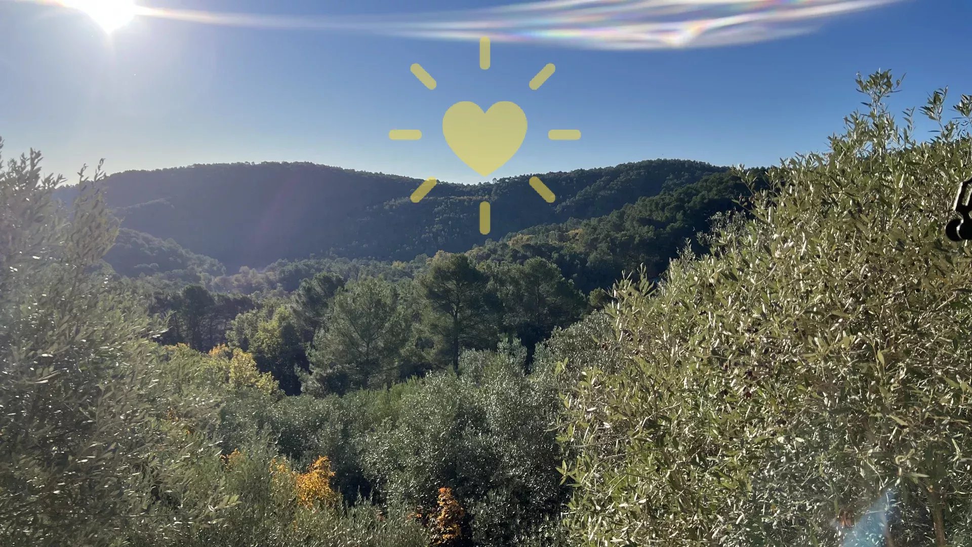 Sur un terrain de 2 200 m2, villa de 65 m2 habitable, au milieu des oliviers et comprenant : Rez-de-chaussée : entrée, séjour avec cheminée et cuisine, espace bureau, mezzanine. Rez-de-jardin : chambre, salle d'eau avec WC, débarras. Très jolie vue sur la campagne, exposition Sud. Surface totale : 77 m2.