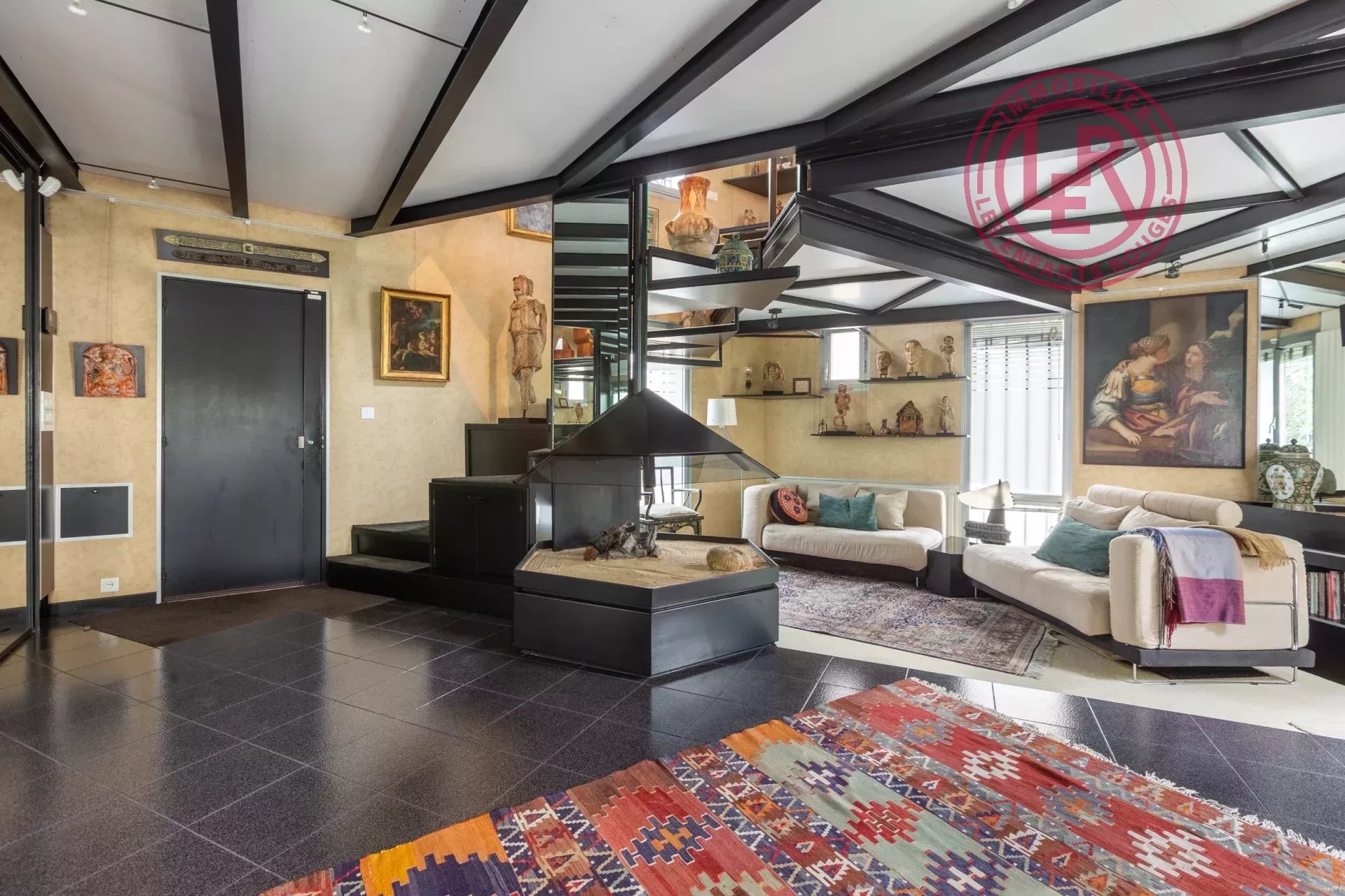 Au rez-de-chaussée, un vaste salon avec cheminée centrale moderne (bois et gaz) s’ouvre sur un jardin japonais zen intérieur, apportant sérénité et harmonie.