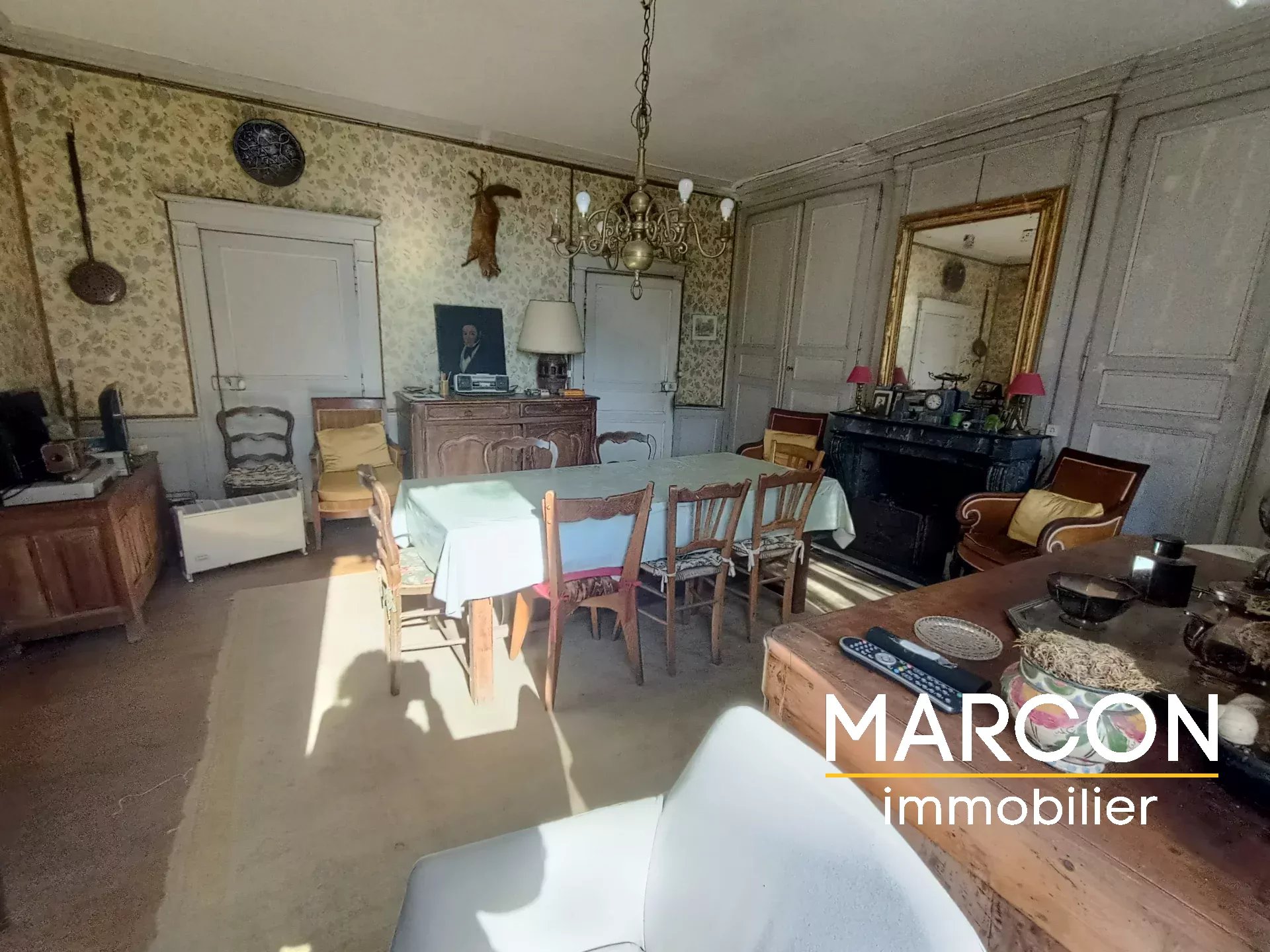 En rez de chaussée: Une entrée qui dessert un salon avec grande cheminée, une grande salle à manger avec cheminée en marbre adjacente une grande cuisine avec cheminée, une arrière cuisine, une salle d'eau, un wc, un cellier et un débarras.