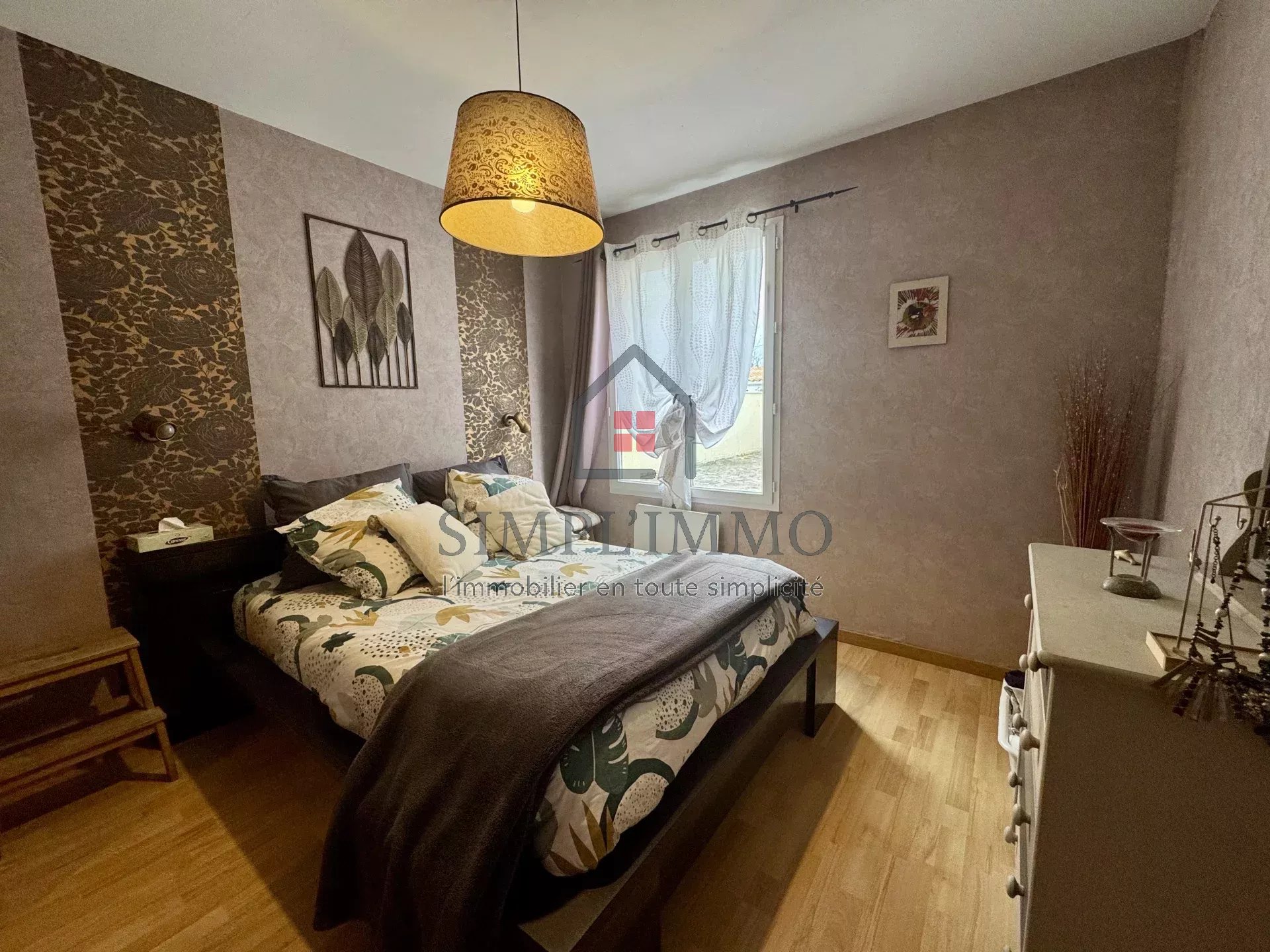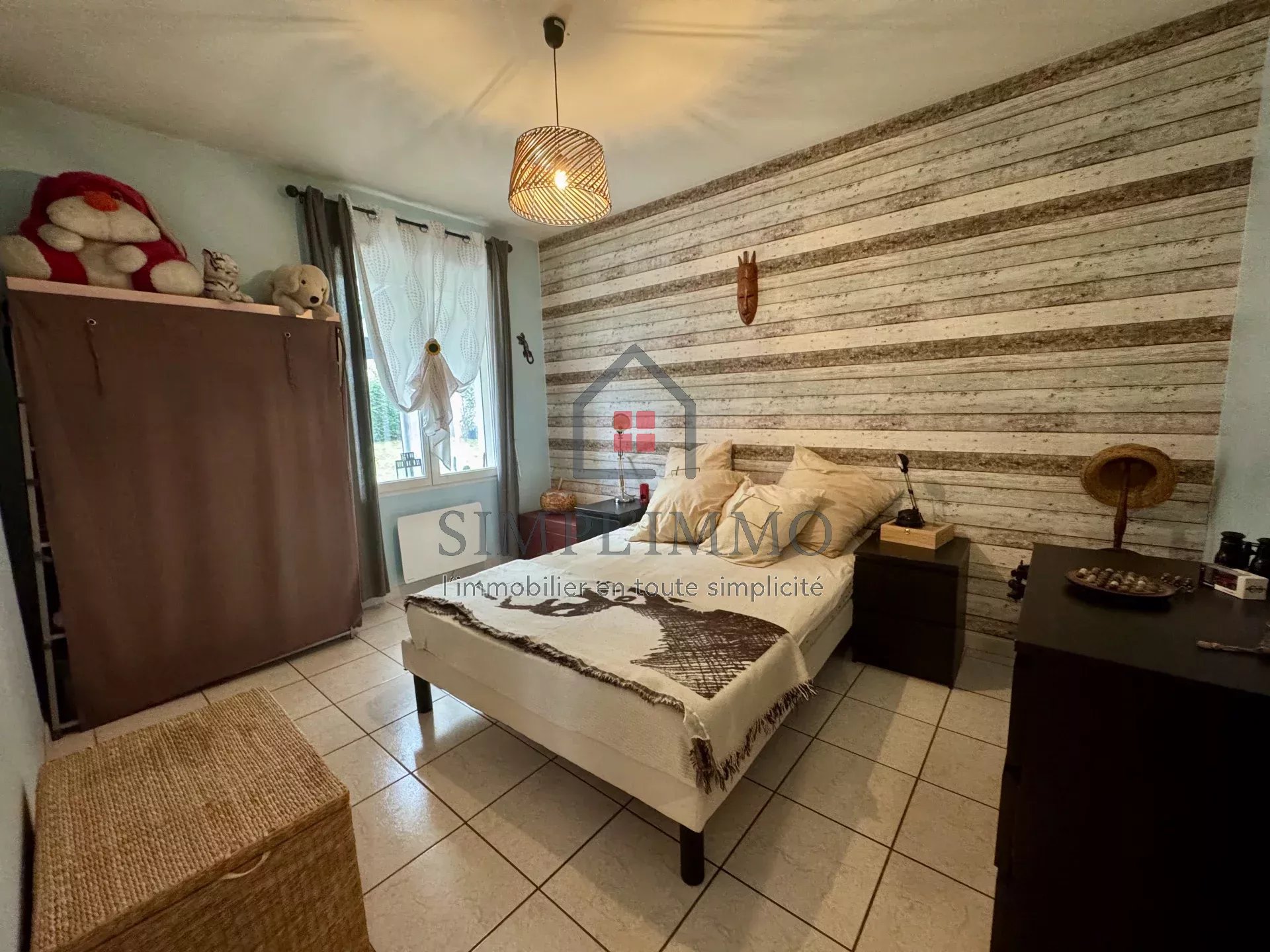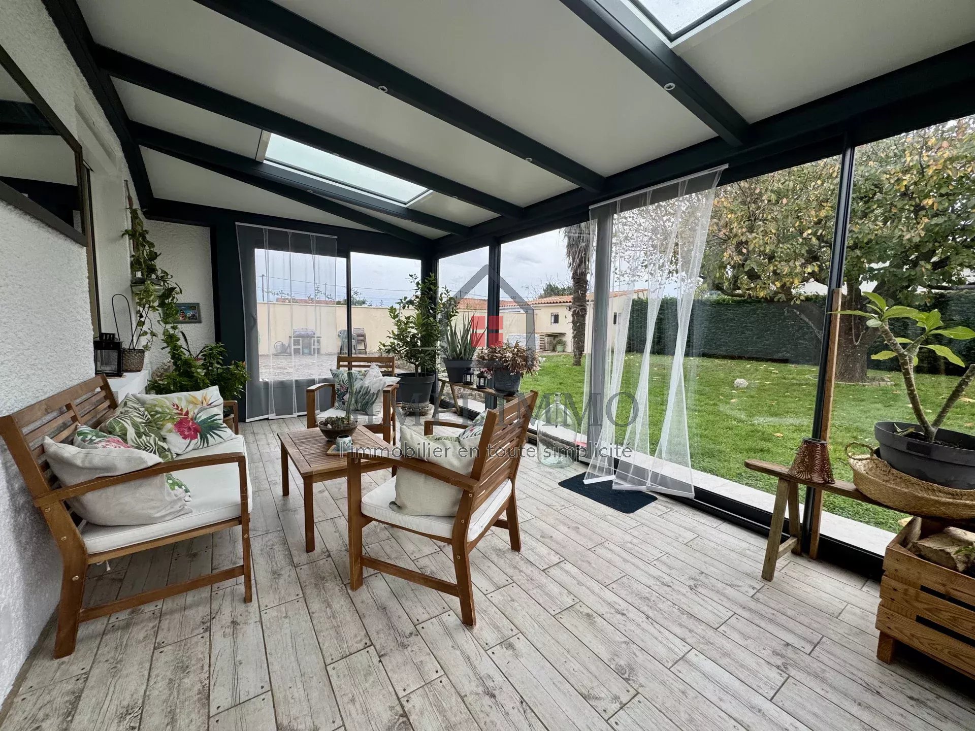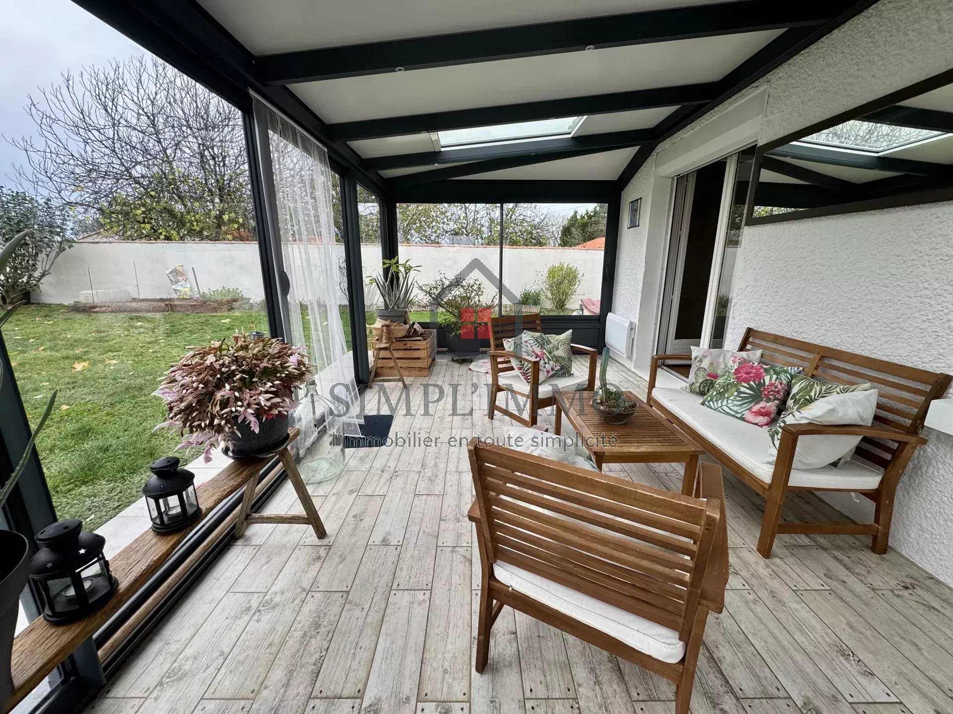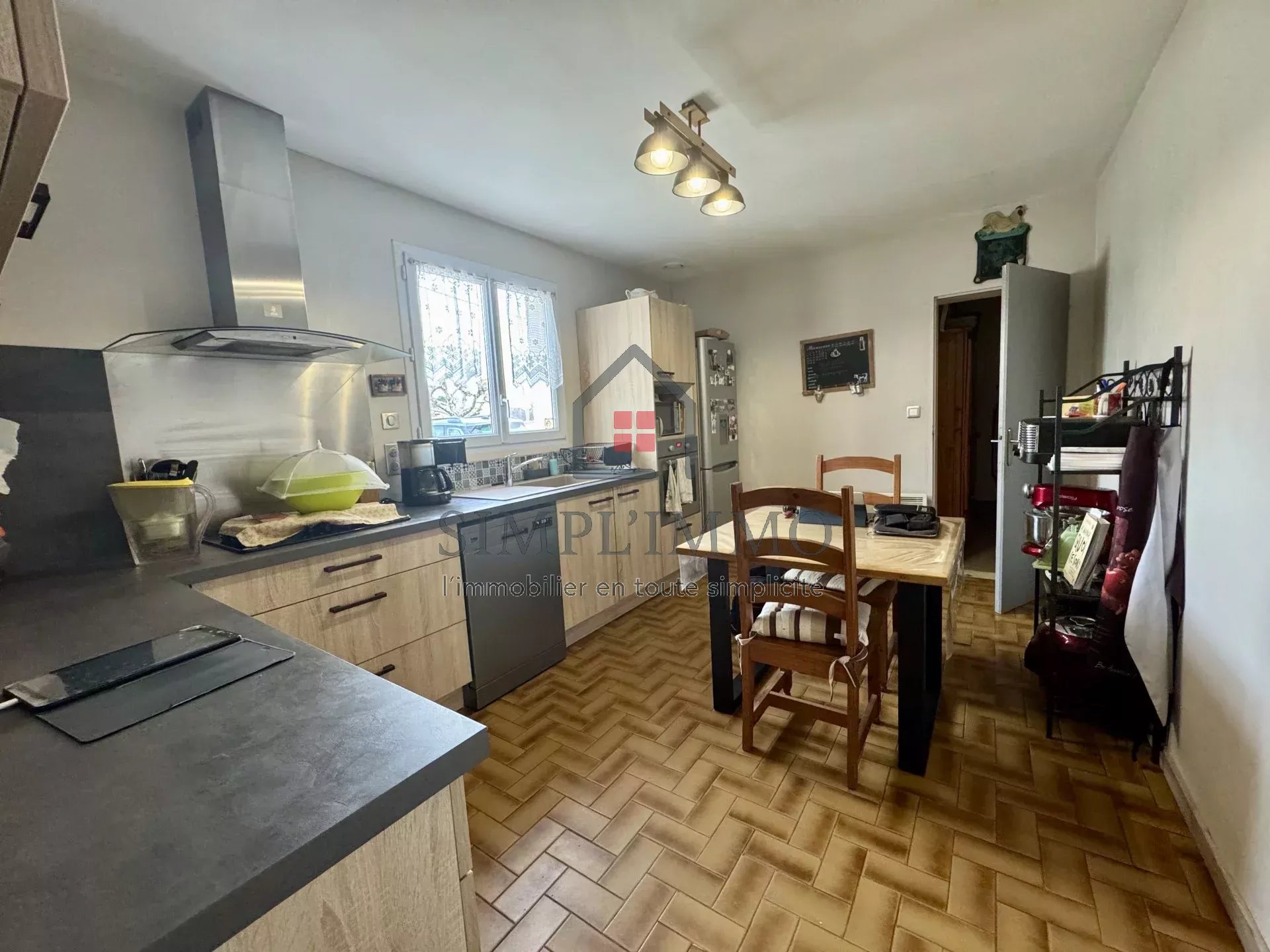 Cette maison, édifiée dans les années 80 et rénovée avec goût, se compose d’une entrée donnant sur une grande cuisine aménagée et équipée, d’un salon-séjour avec cheminée insert, d’une belle véranda chauffée, ainsi que d’un dégagement desservant trois chambres, un WC et une salle de douche.