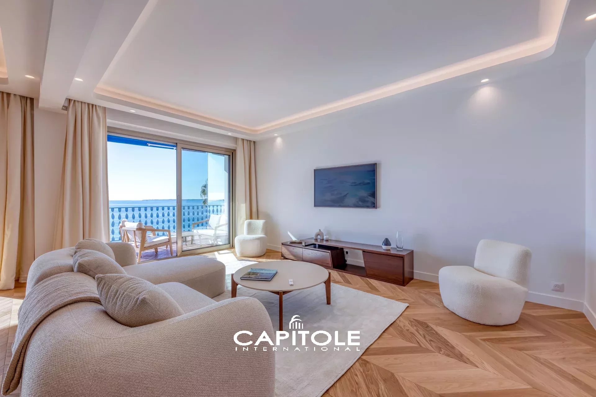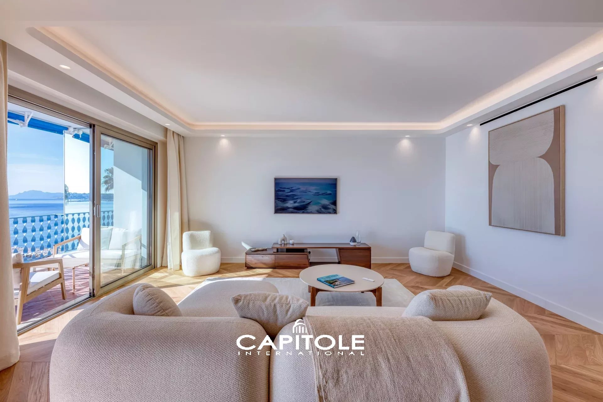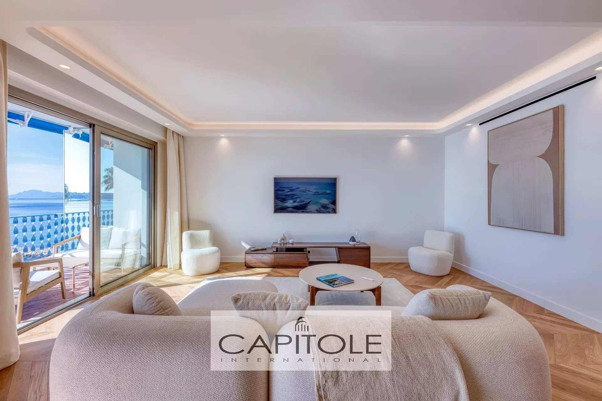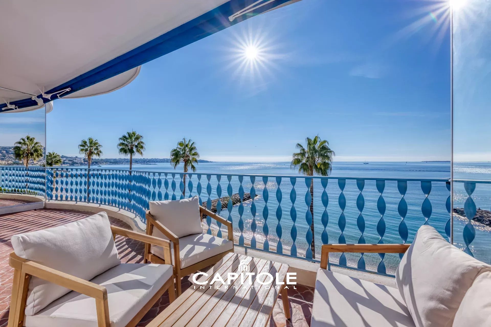 Vue mer panoramique à couper le souffle depuis ce spacieux 3 pièces traversant de 81 m² agrémenté d'une profonde terrasse sur la mer, les Îles de Lérins, le Cap d'Antibes et l'Estérel.
