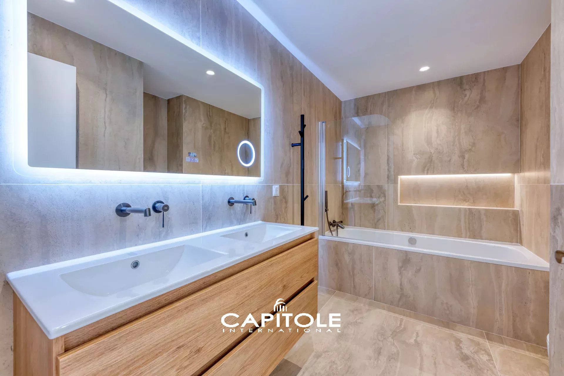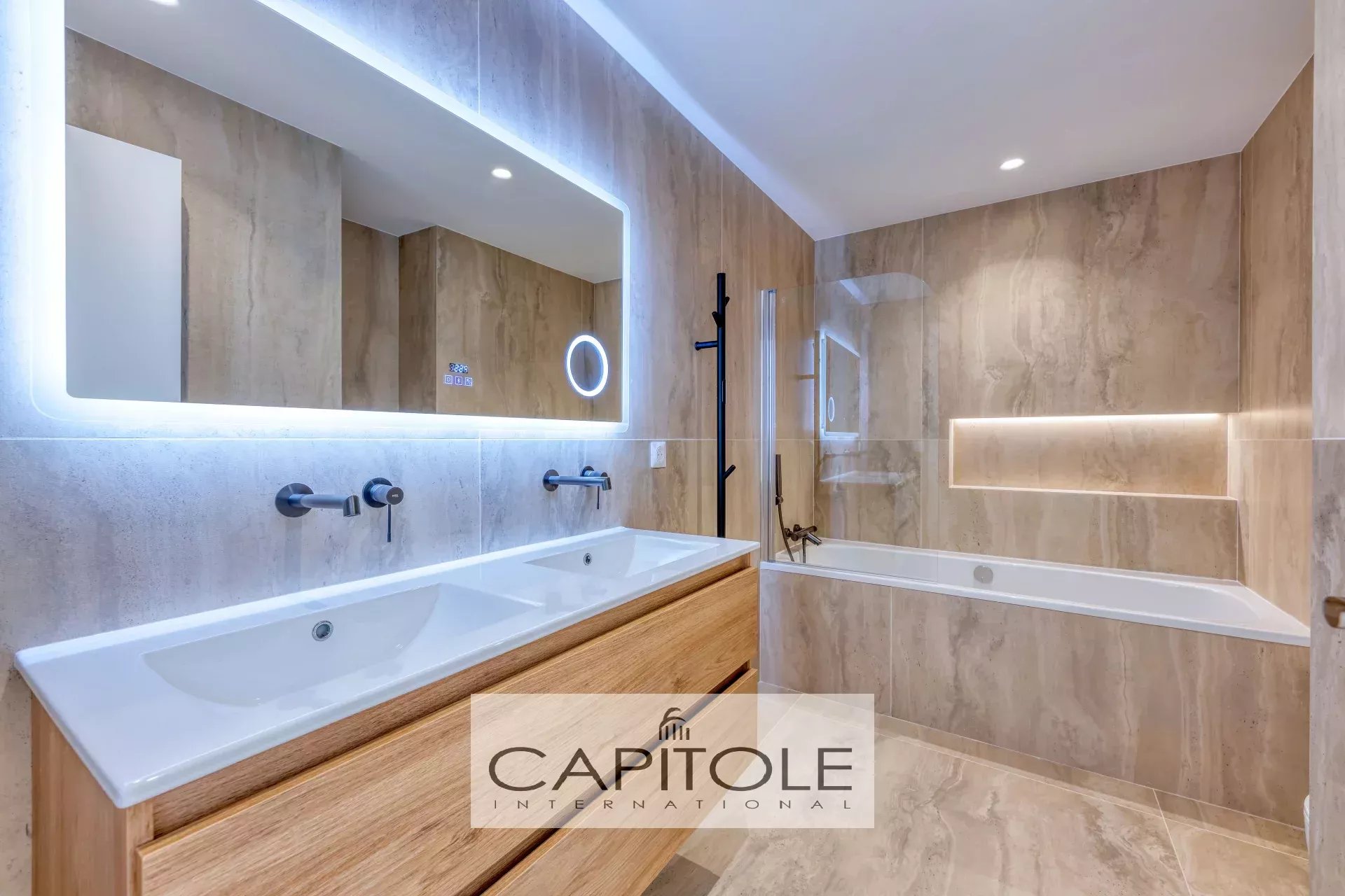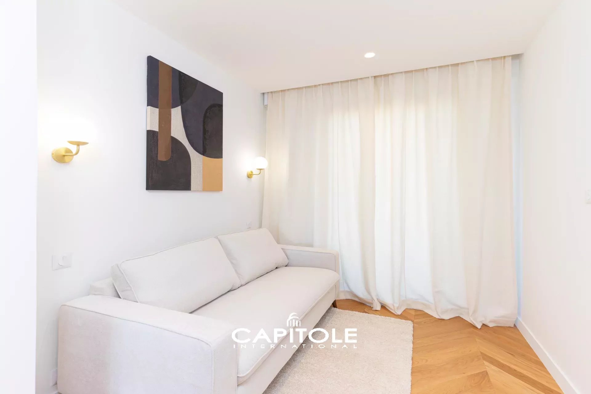 L'appartement se compose d'un hall d'entrée, d'un séjour avec cuisine équipée neuve, d'une vaste salle de bains avec wc, un wc indépendant, une chambre en suite avec grand dressing et salle d'eau et une 2ème chambre. Les deux espaces nuit sortent sur un balcon.