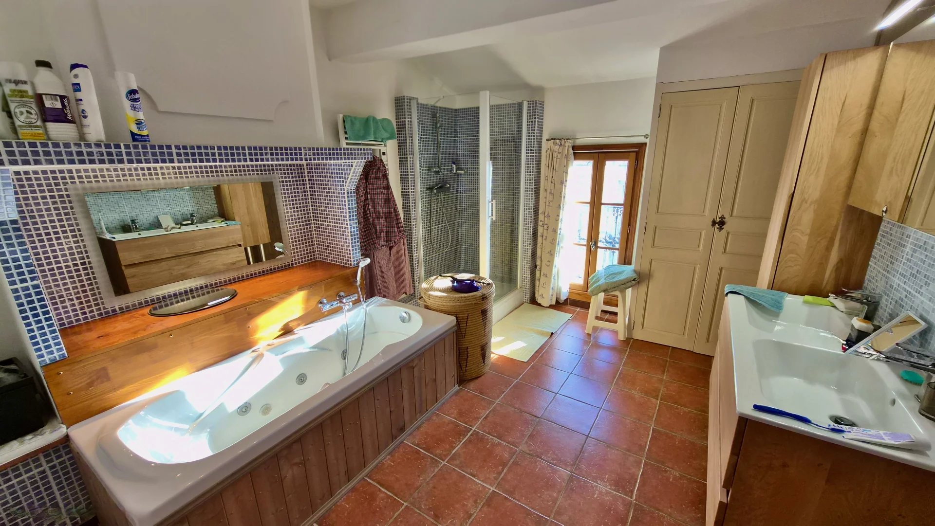 Au deuxième étage, on trouve trois chambres doubles et une grande salle de bains de 13 m² avec baignoire, cabine de douche et double vasque.