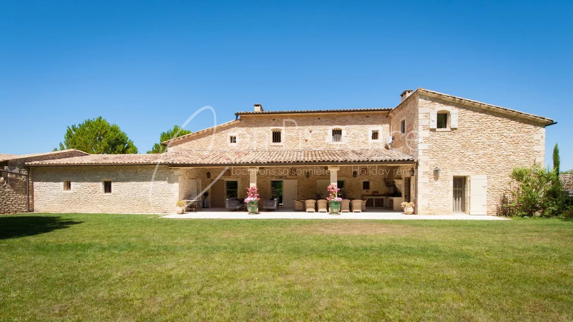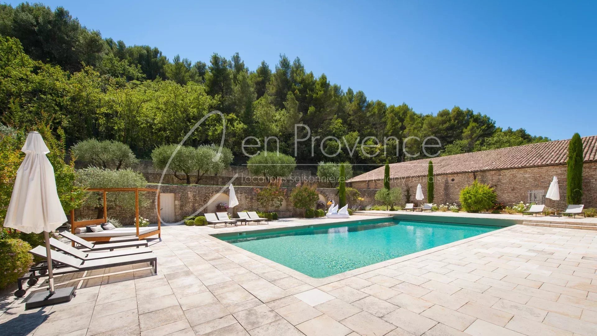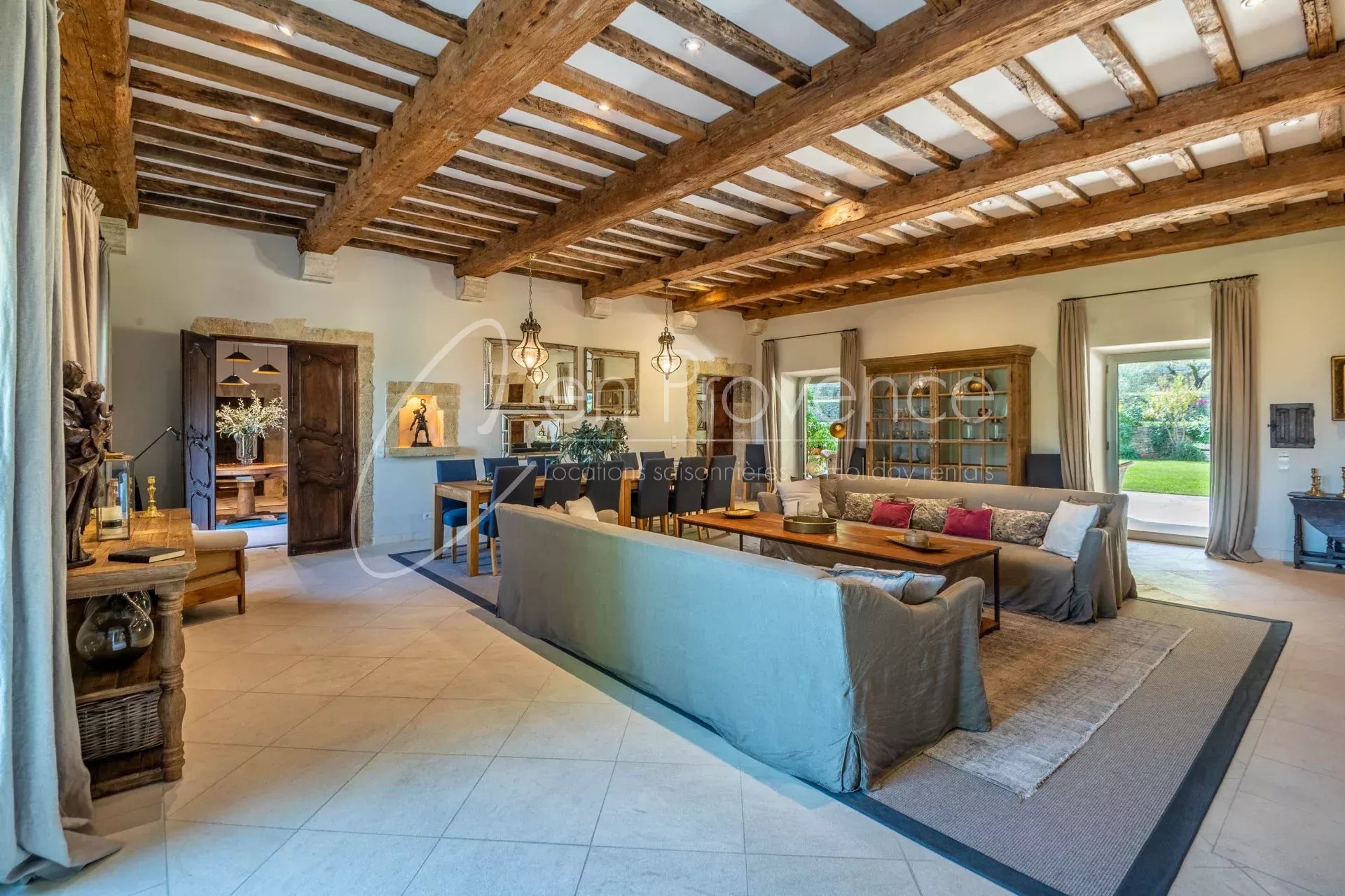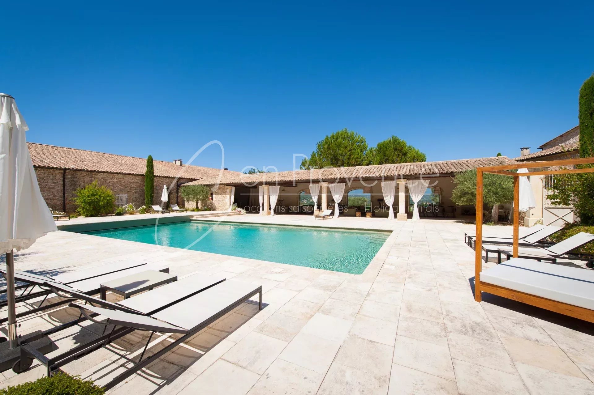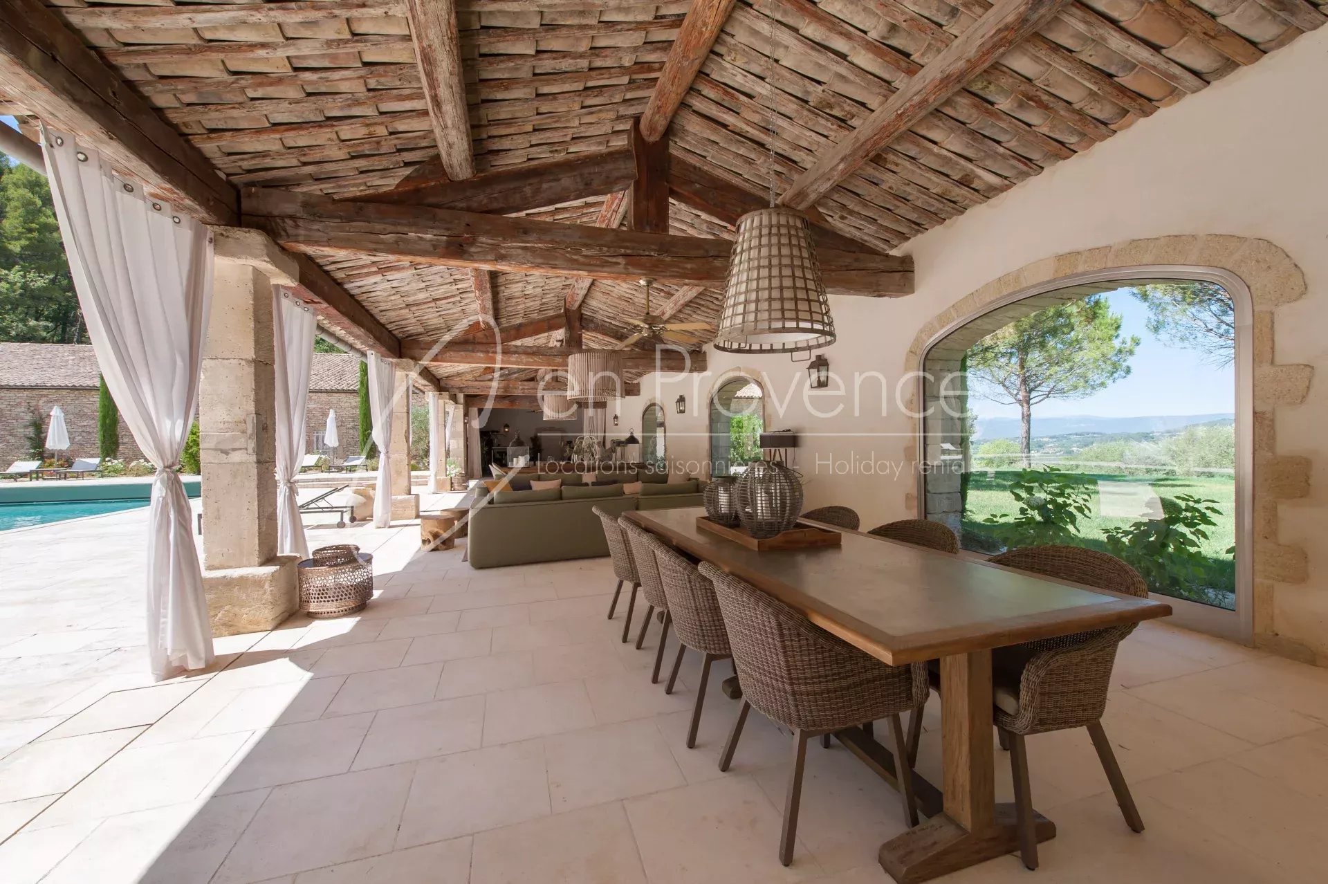 Idéale pour des vacances haut de gamme en Provence, la propriété accueille jusqu’à 24 personnes avec ses 11 chambres et 10 salles de bains réparties entre la maison principale et deux annexes indépendantes. Les intérieurs allient authenticité et confort moderne : cuisine semi professionnelle, vastes salons lumineux, climatisation, terrasses et espaces extérieurs aménagés.