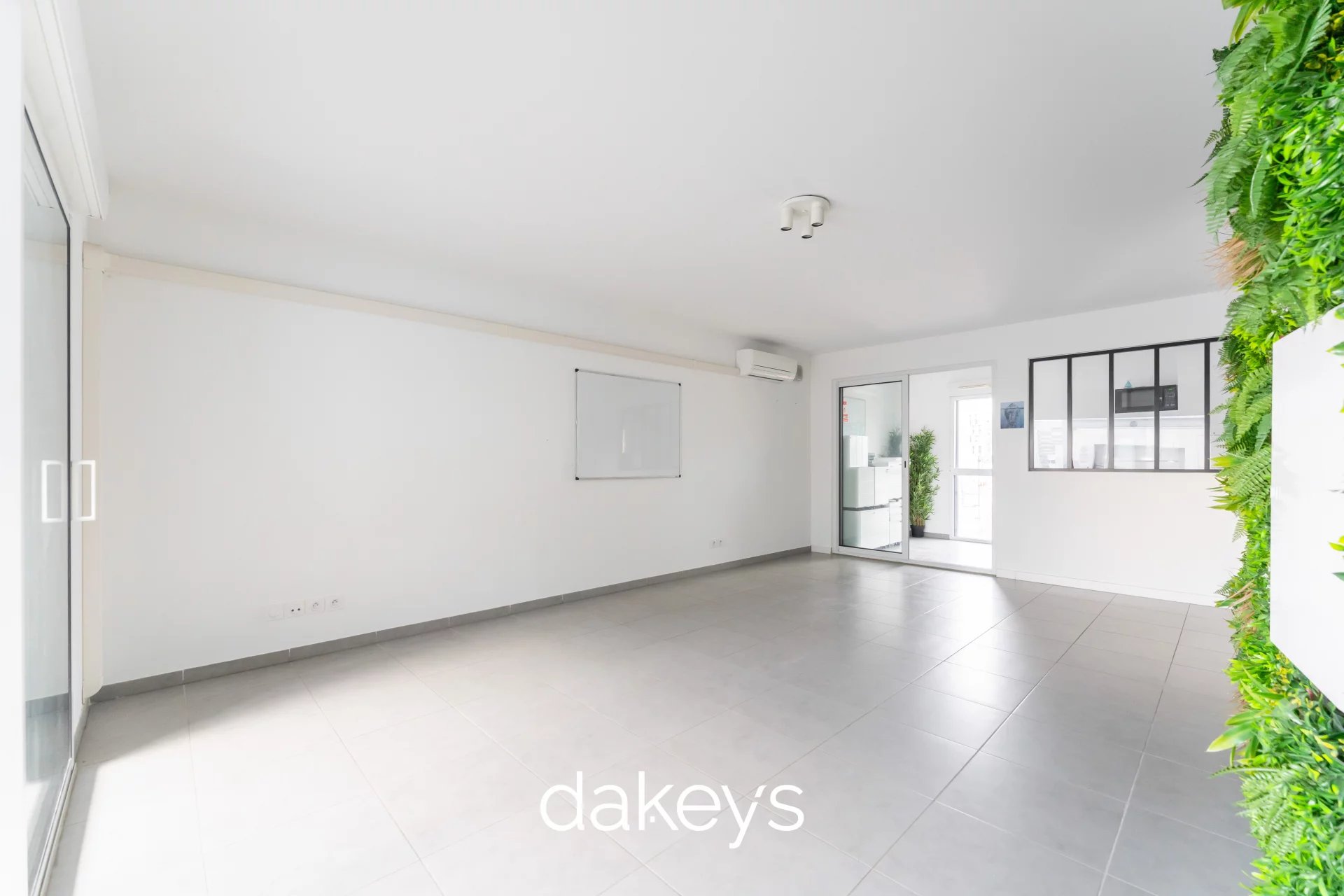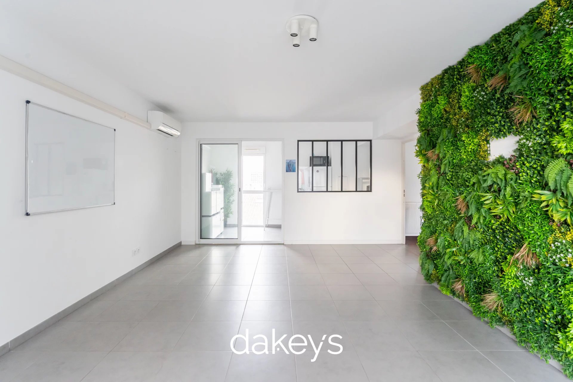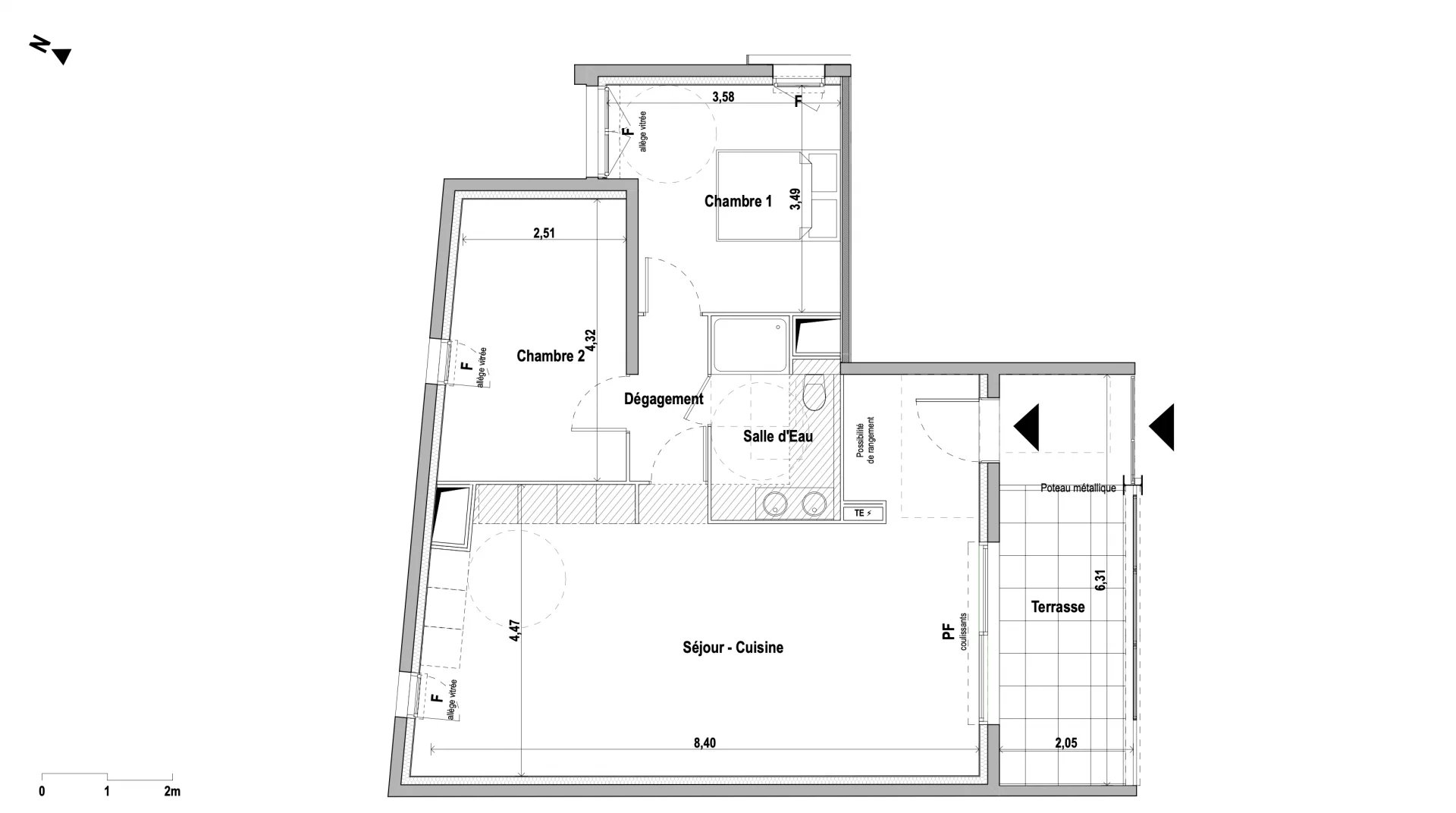 L’appartement se compose d’une pièce de vie lumineuse ouverte sur la terrasse, d’une cuisine ouverte, de deux chambres, et d’une salle d’eau avec WC.