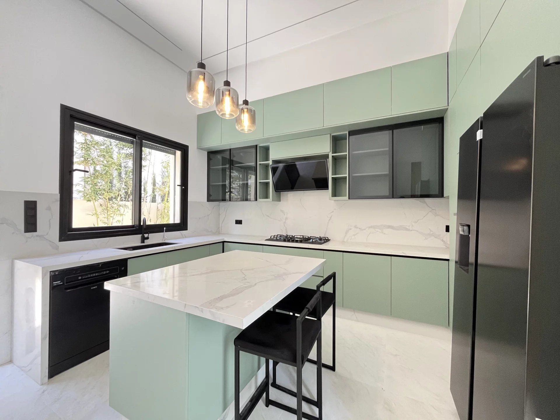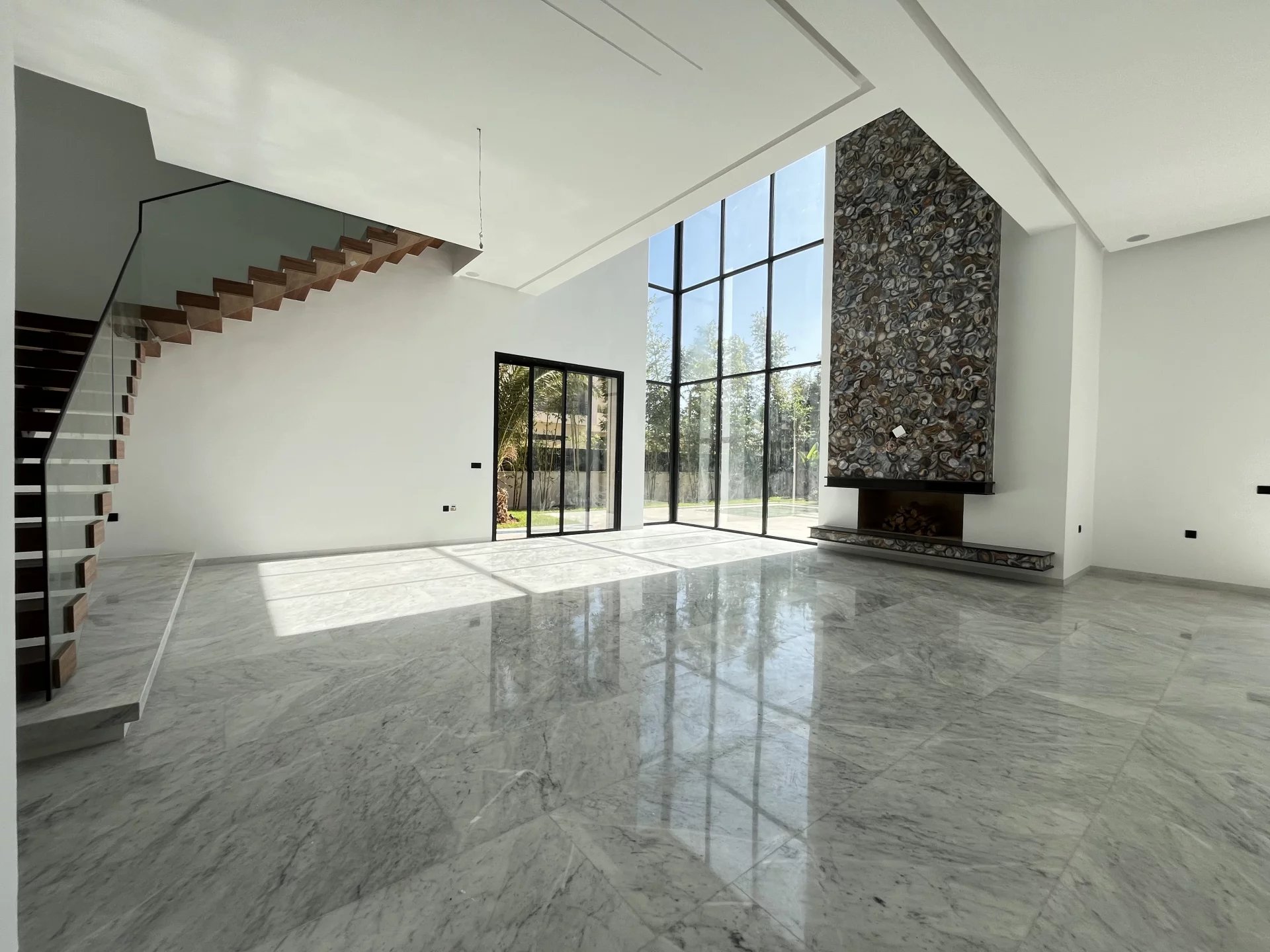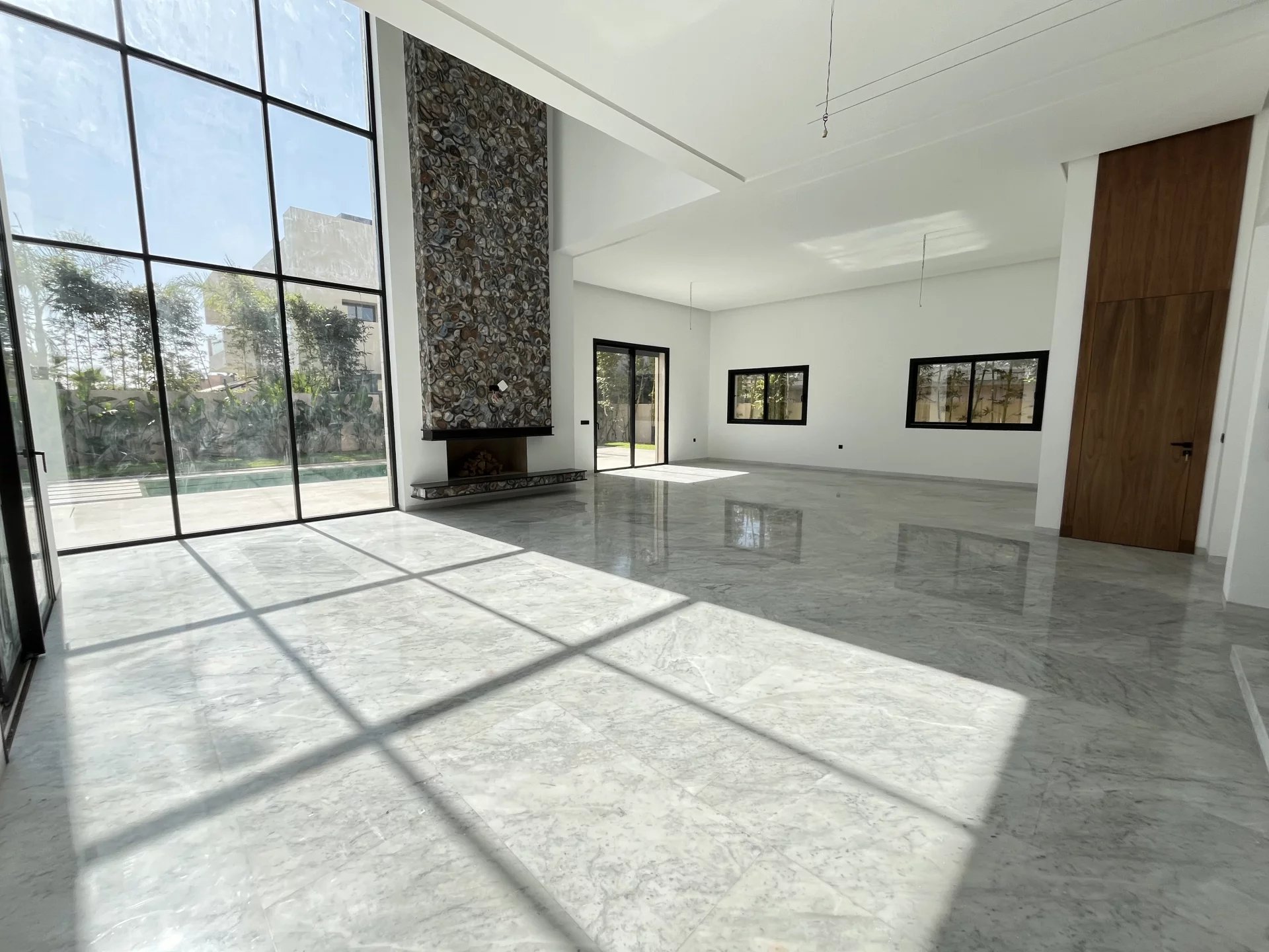 Tres belle villa située dans un domaine sécurisé construite sur un terrain paysagé de 560 M2 sur la route de TAHANAOUT à 5 mn de MOROCCO MALL. RDC : Double salon lumineux avec cheminée, cuisine équipée haut de gamme , salle d'eau et wc et pièce de rangement fond de cour exterieur avec sa salle d'eau . 1er ETAGE : 4 suites avec emplacement placards et SDB R+2: Rooftop avec 1 chambre et Salle d'eau, jardin exotique, piscine chauffée , effet miroir et à débordement , jacuzzi encastré , domotique avancée, climatisation gainée, ballon solaire .