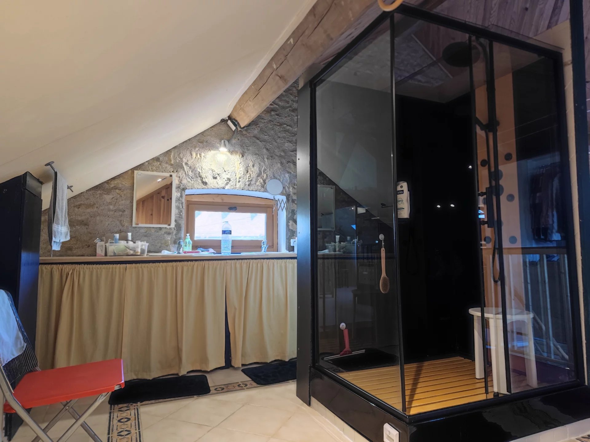 La maison à rénover d’une superficie 90m2, accueille au RDC une pièce principale, un dégagement et une ancienne salle d’eau avec WC. A l’étage, un grand grenier à aménager.