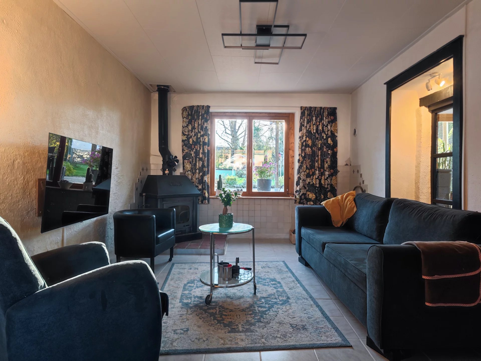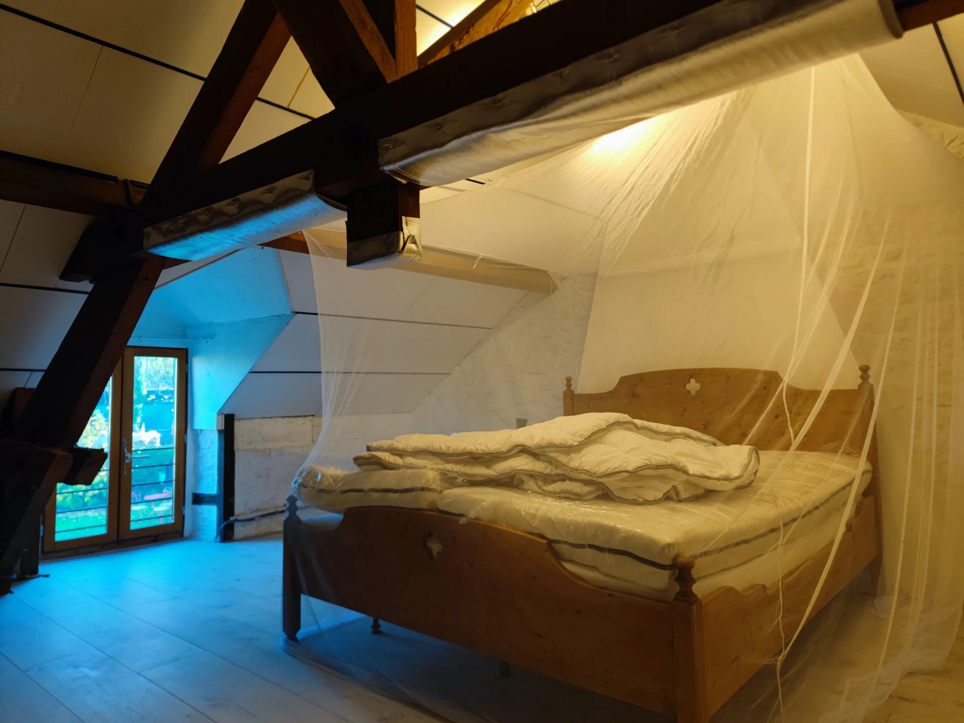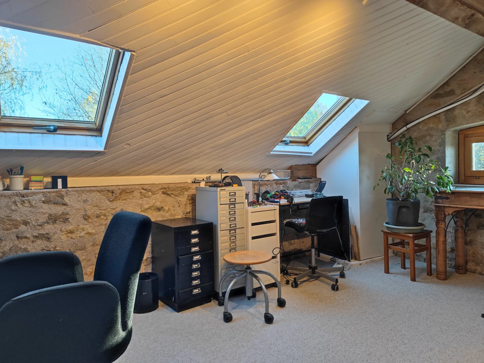 L’habitation principale d’une superficie de 121m2, se compose au RDC d’une cuisine semi-ouverte sur salle à manger, suivie d’un salon et d’un bureau. A l’étage, vous trouverez un vaste espace ouvert de 55m2 accueillant une chambre, une salle d’eau avec WC et un dressing. La maison est chauffée avec un poêle à granulés et un poêle à bois pour le RDC et une clim réversible pour l’étage. Double vitrage présent.