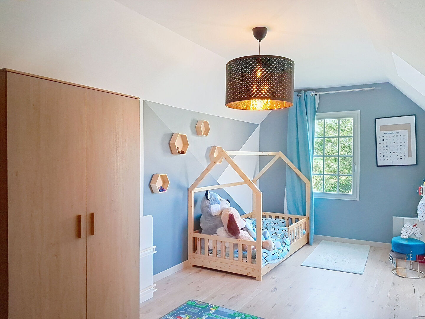 Maison de 2004 comprenant au rez-de-chaussée : entrée, cuisine, séjour double, cellier, WC, 1 chambre, salle d'eau, à l'étage : palier, 3 chambres, dressing, salle de bains, WC. Garage. Terrain : 900m².