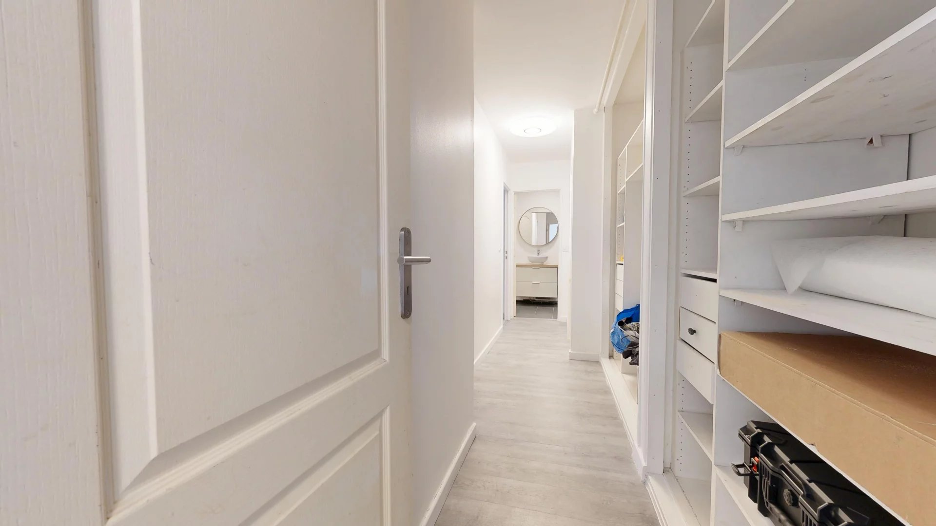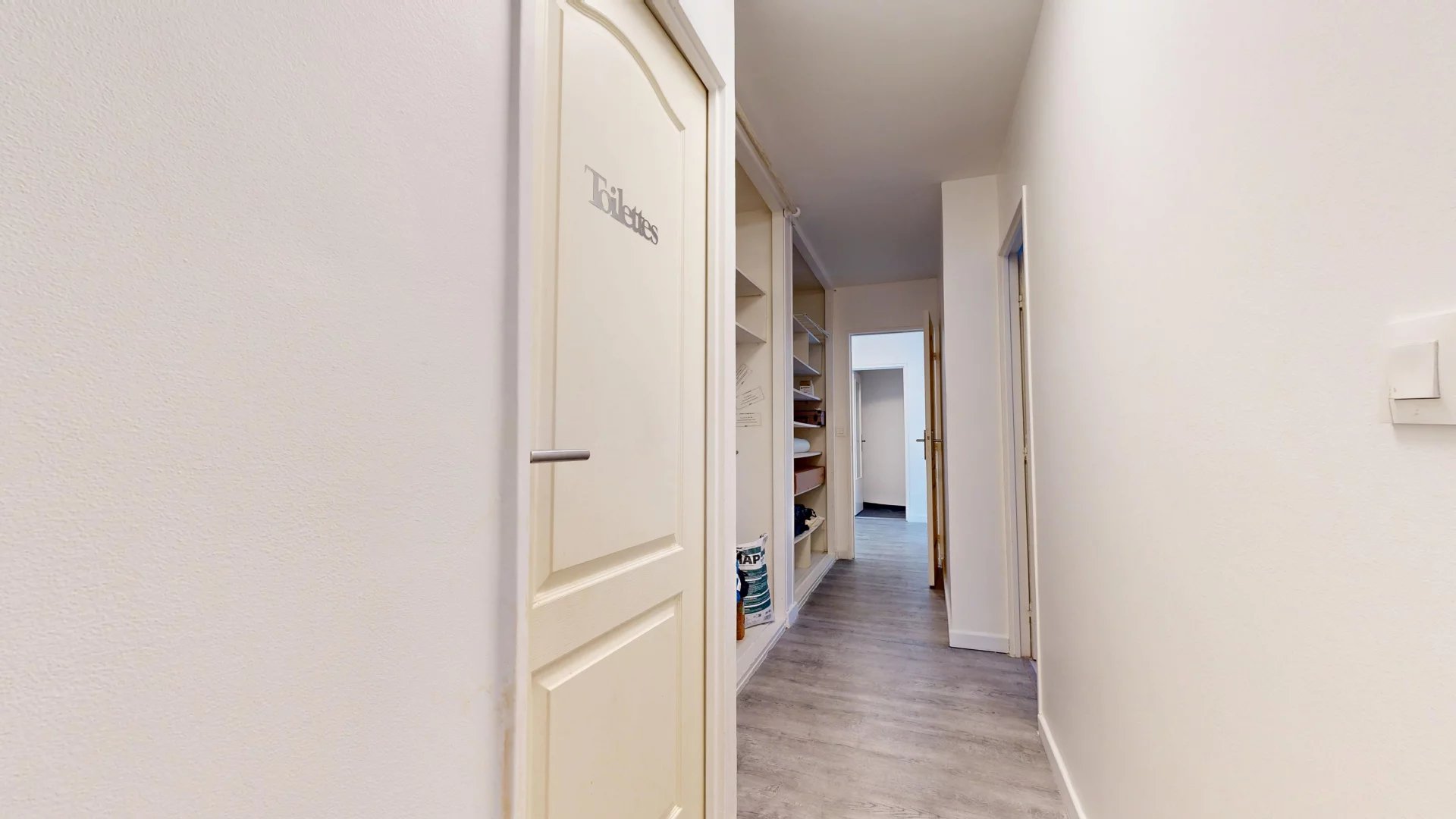 Un large couloir agrémenté de nombreux placards apporte un confort appréciable pour le rangement. Vous trouverez également deux chambres de bonne taille, une salle d’eau et un WC indépendant.