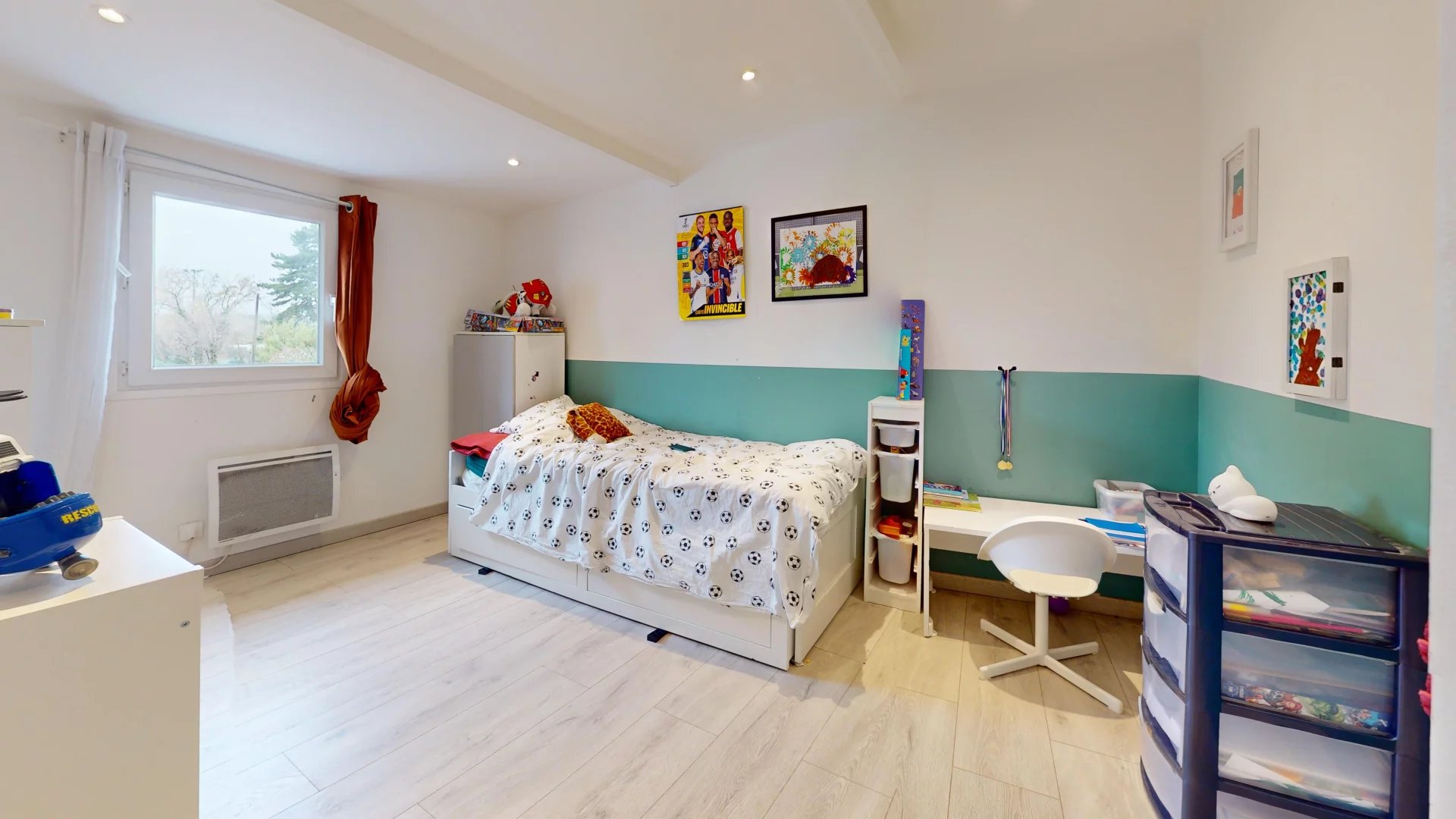 À l’étage, l’espace nuit se compose de trois chambres, dont une chambre d’enfant, ainsi qu’une salle d’eau avec WC.