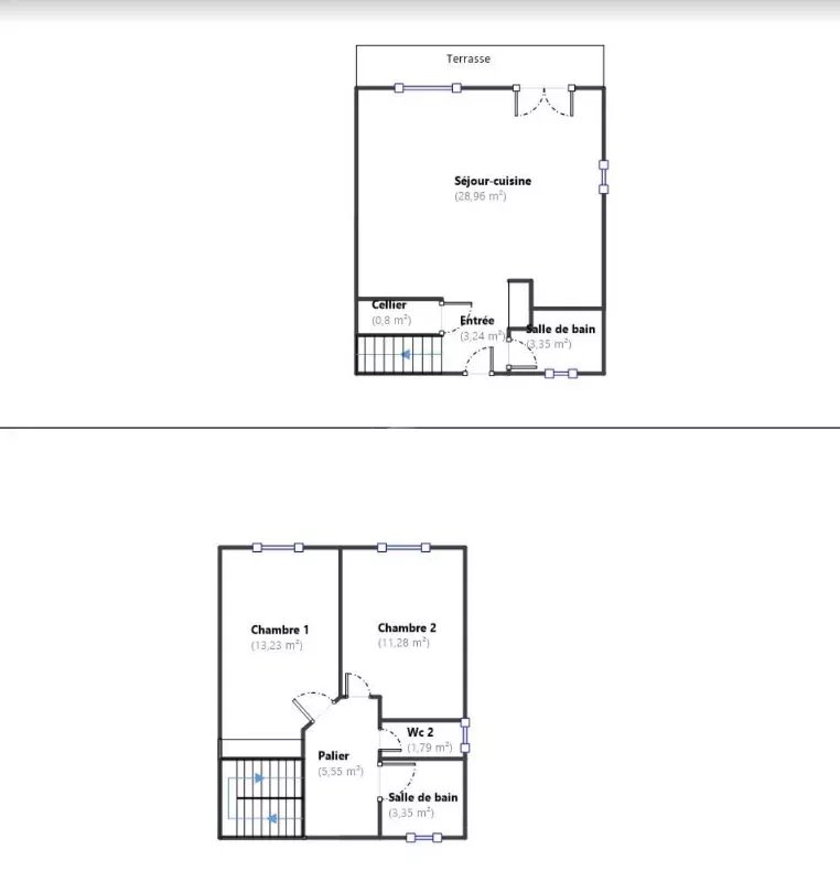 À l’étage, deux chambres avec placards muraux et une salle d’eau offrent un espace nuit fonctionnel et agréable.