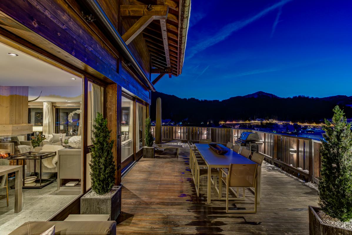 D'une superficie totale de 528 m² répartis sur quatre étages, le chalet dispose de sept chambres, dont six doubles spacieuses et une avec des lits superposés. La suite principale s'ouvre directement sur un coin salon extérieur privé, tandis que certaines autres chambres bénéficient d'un balcon commun offrant la même vue imprenable.