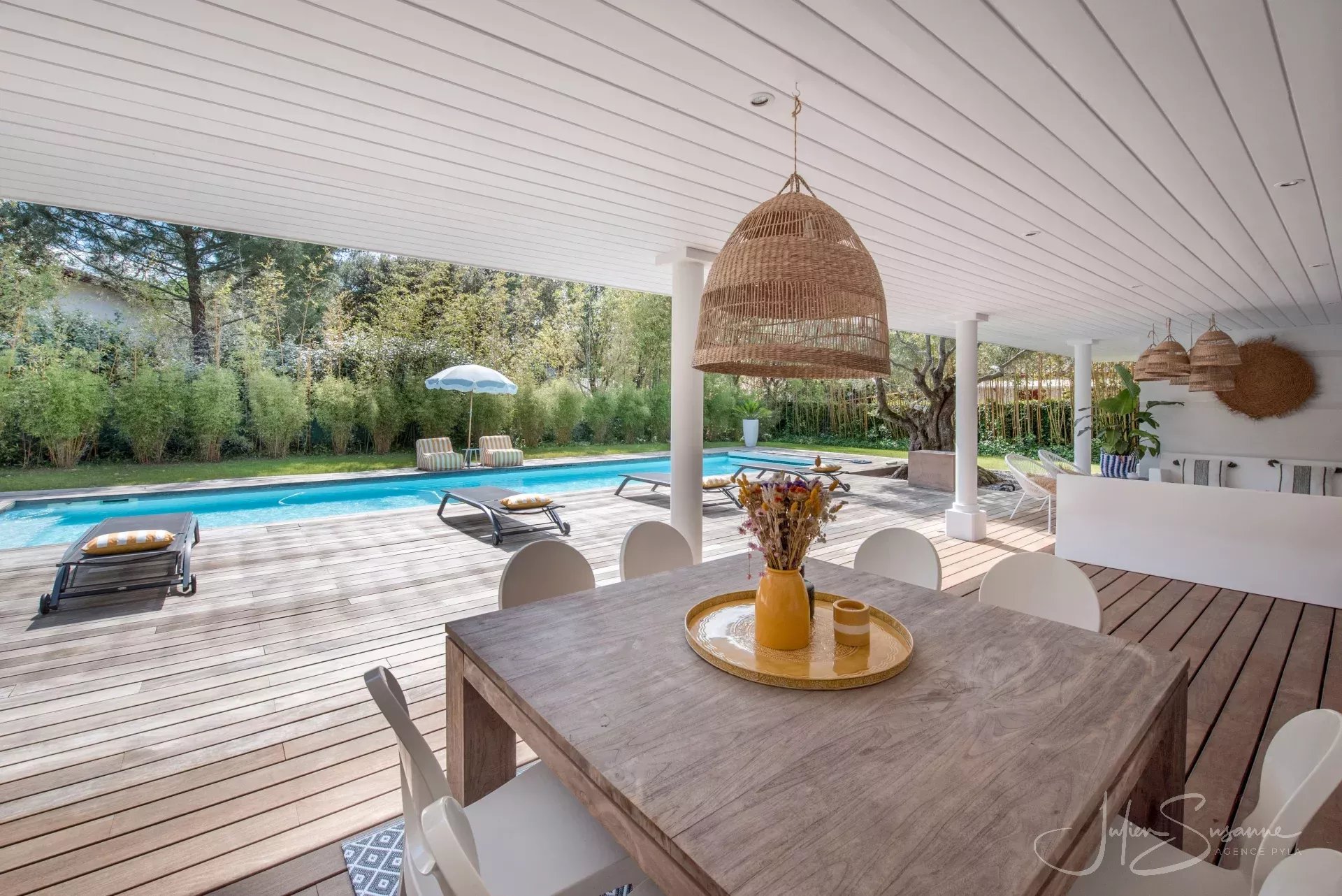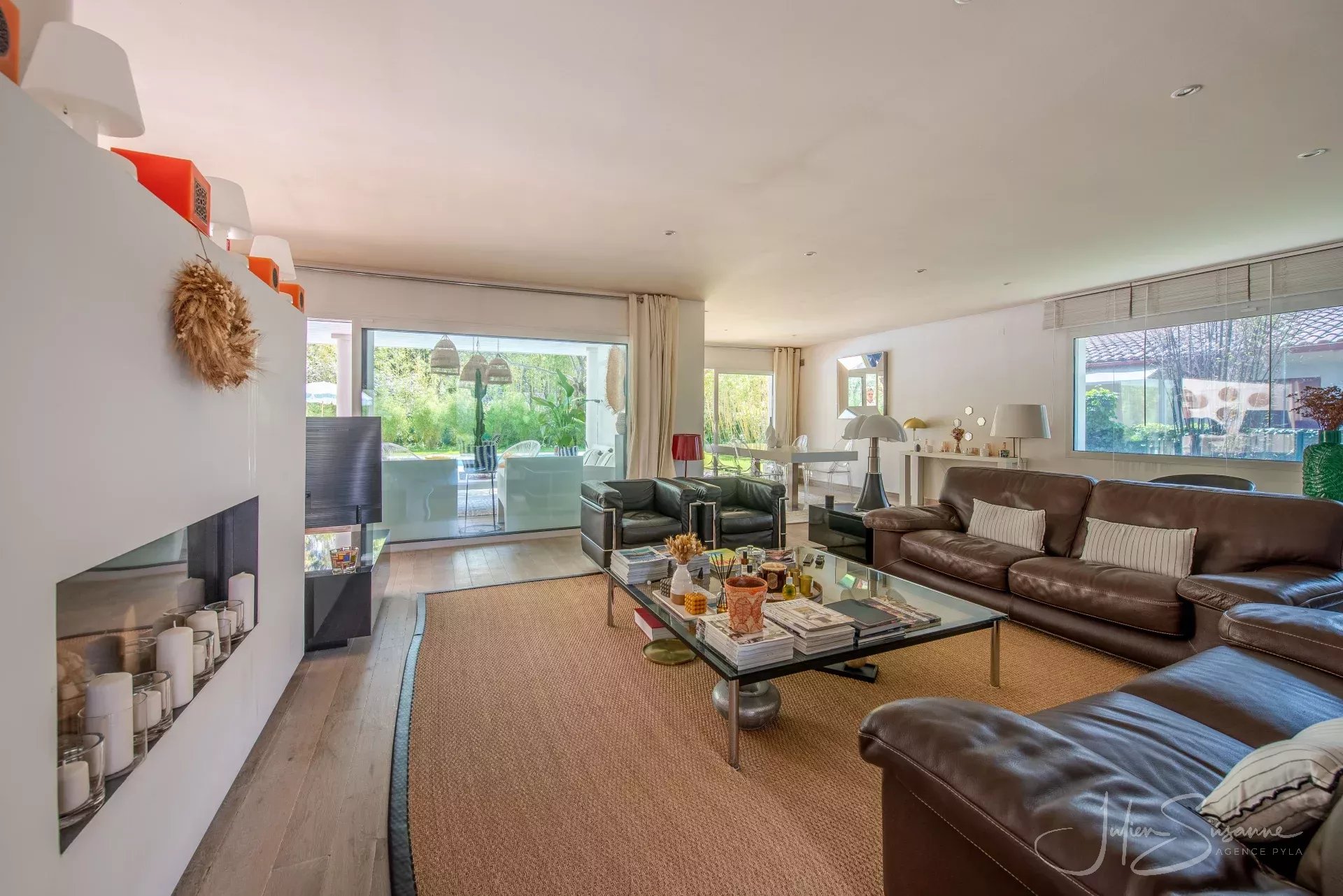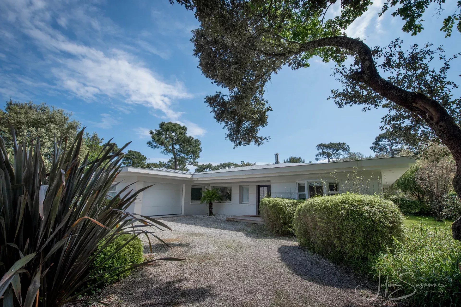 Villa d’inspiration floridienne chic et élégante – Le Moulleau, emplacement premium au calme absolu Située dans l’un des quartiers les plus recherchés du Moulleau, cette somptueuse villa d’inspiration floridienne offre un cadre de vie exceptionnel, alliant confort, design et sérénité. D’une superficie de 250 m², elle est implantée sur un magnifique terrain paysager, entièrement clôturé, sans aucun vis-à-vis – un véritable écrin de verdure à quelques pas de la plage et du centre du Moulleau. La villa se compose de 4 chambres spacieuses, dont une suite parentale, d’un vaste salon/séjour baigné de lumière avec cuisine américaine, sublimé par une cheminée moderne double face, apportant chaleur et caractère à l’espace de vie. Vous y trouverez également une salle de bain, 3 salles d’eau et 3 toilettes. À l’extérieur, vous découvrirez un espace soigneusement aménagé, idéal pour la détente, avec une grande piscine, parfait pour profiter des beaux jours en toute intimité, un garage et une cave complètent ce bien exceptionnel. Une propriété rare, à l’emplacement privilégié, qui séduira les amateurs de calme, de volumes généreux et de prestations haut de gamme. Agence Pyla JS 0675531105