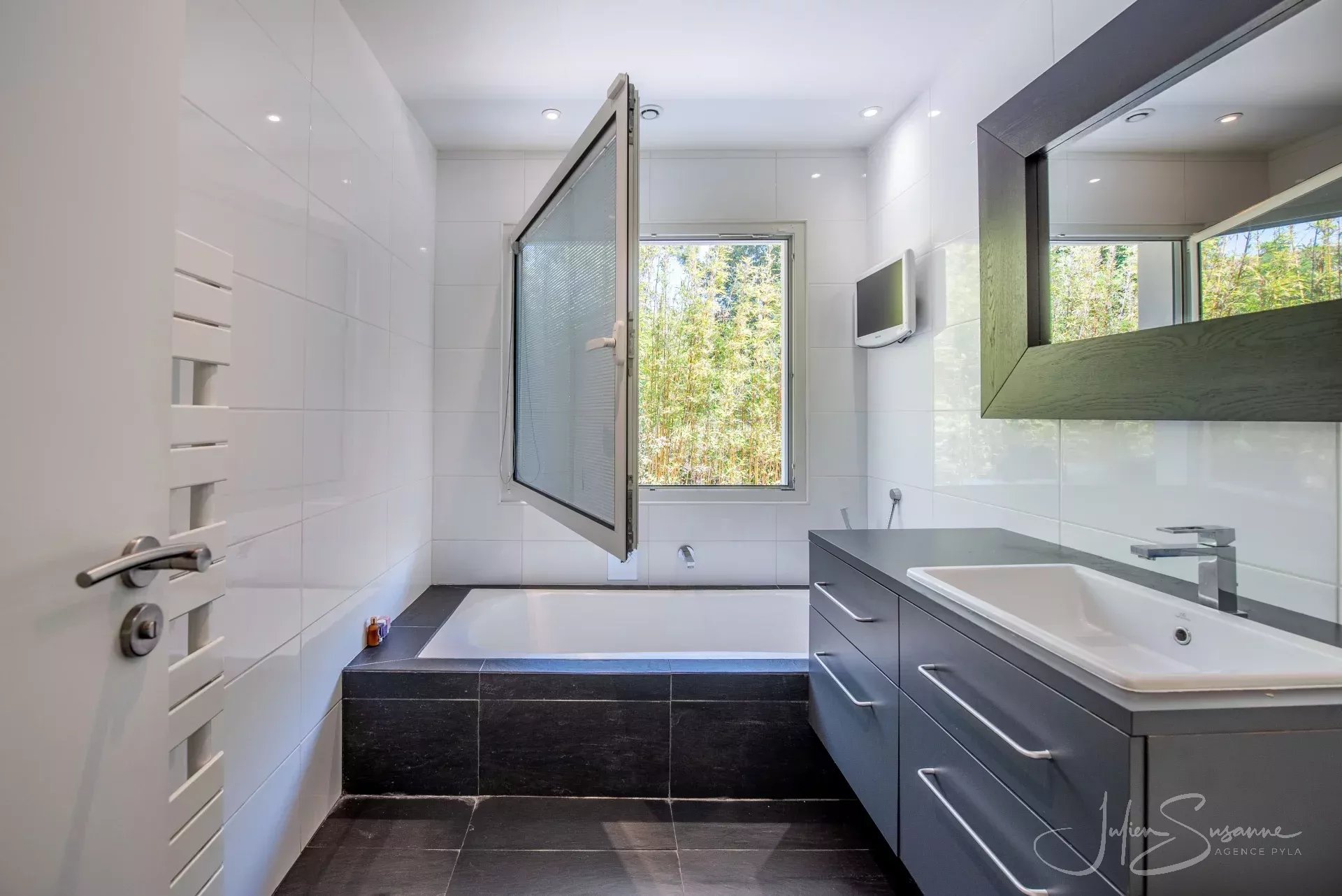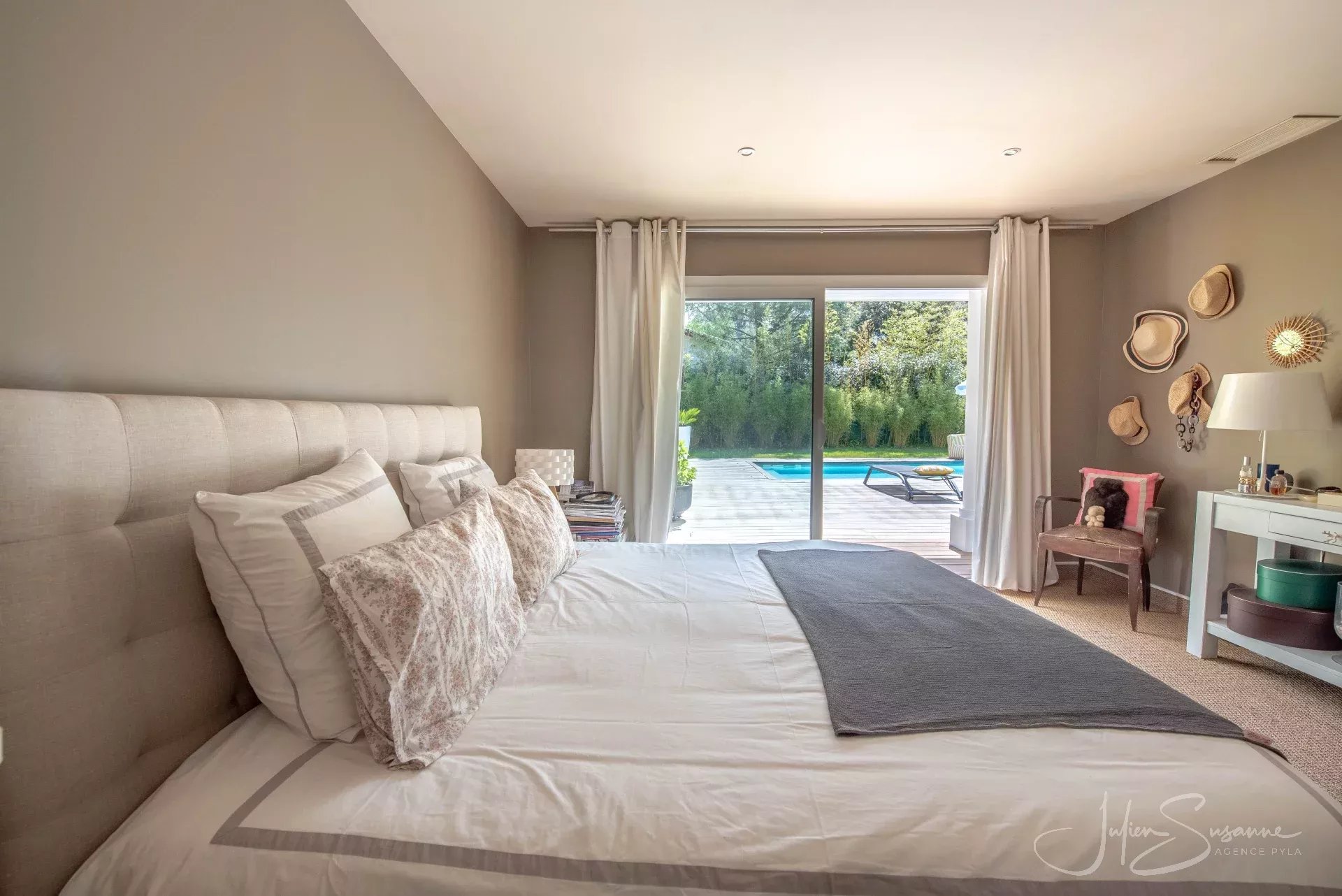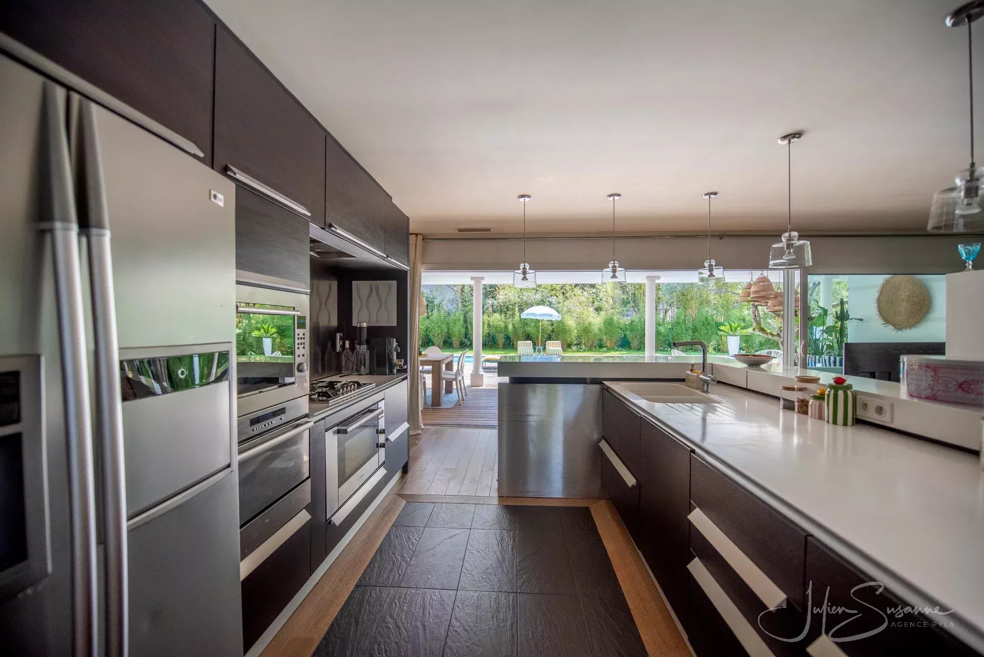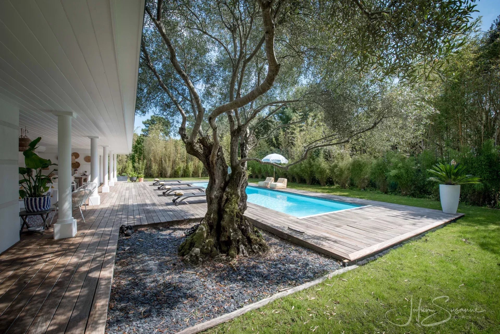 Villa d’inspiration floridienne chic et élégante – Le Moulleau, emplacement premium au calme absolu Située dans l’un des quartiers les plus recherchés du Moulleau, cette somptueuse villa d’inspiration floridienne offre un cadre de vie exceptionnel, alliant confort, design et sérénité. D’une superficie de 250 m², elle est implantée sur un magnifique terrain paysager, entièrement clôturé, sans aucun vis-à-vis – un véritable écrin de verdure à quelques pas de la plage et du centre du Moulleau. La villa se compose de 4 chambres spacieuses, dont une suite parentale, d’un vaste salon/séjour baigné de lumière avec cuisine américaine, sublimé par une cheminée moderne double face, apportant chaleur et caractère à l’espace de vie. Vous y trouverez également une salle de bain, 3 salles d’eau et 3 toilettes. À l’extérieur, vous découvrirez un espace soigneusement aménagé, idéal pour la détente, avec une grande piscine, parfait pour profiter des beaux jours en toute intimité, un garage et une cave complètent ce bien exceptionnel. Une propriété rare, à l’emplacement privilégié, qui séduira les amateurs de calme, de volumes généreux et de prestations haut de gamme. Agence Pyla JS 0675531105