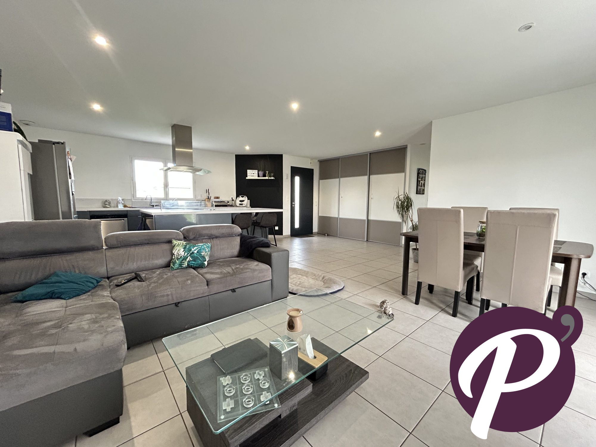 Le vaste séjour de 50 m² avec une cuisine aménagée et équipée, clim réversible et placards dans l'entrée
