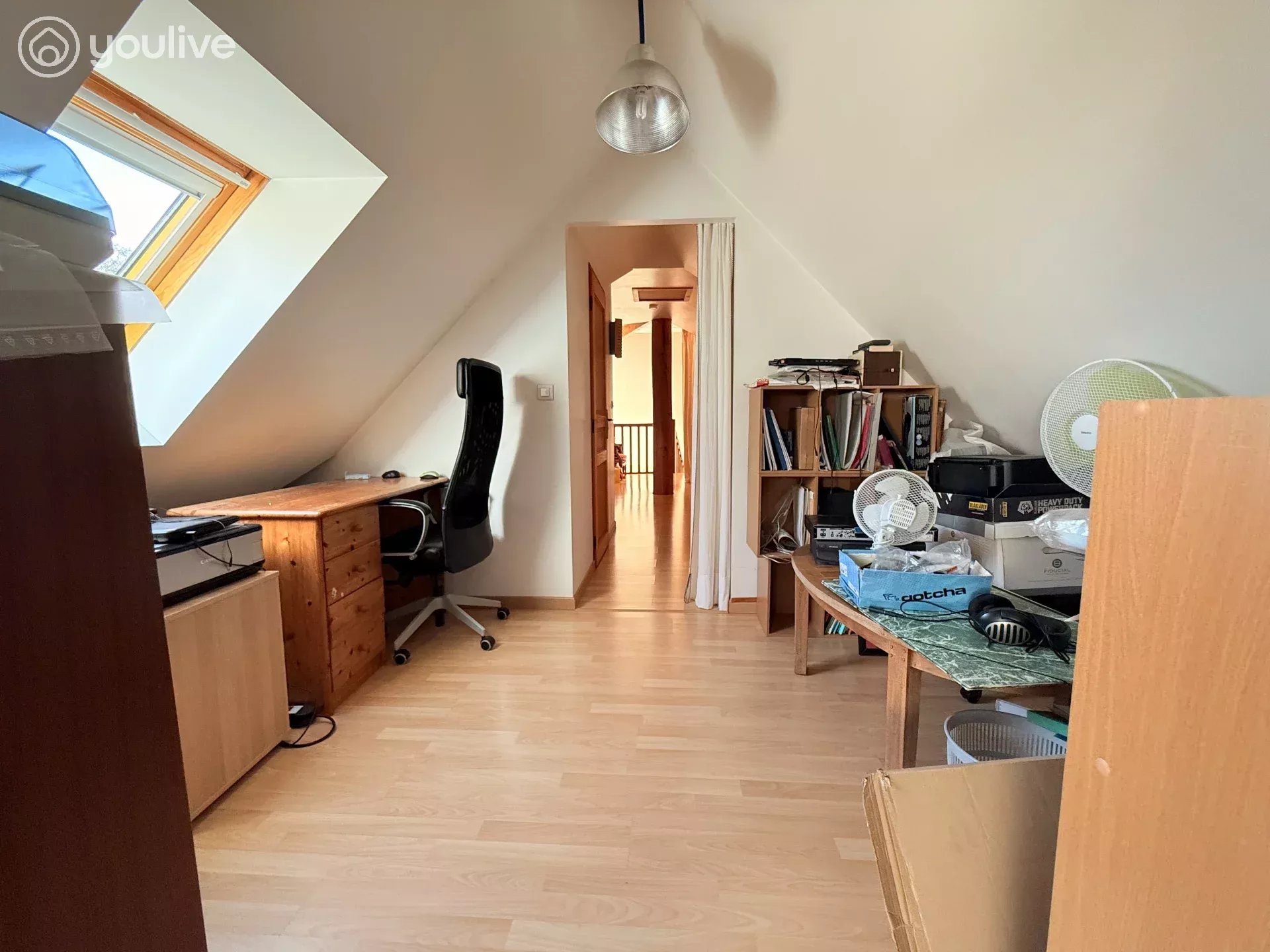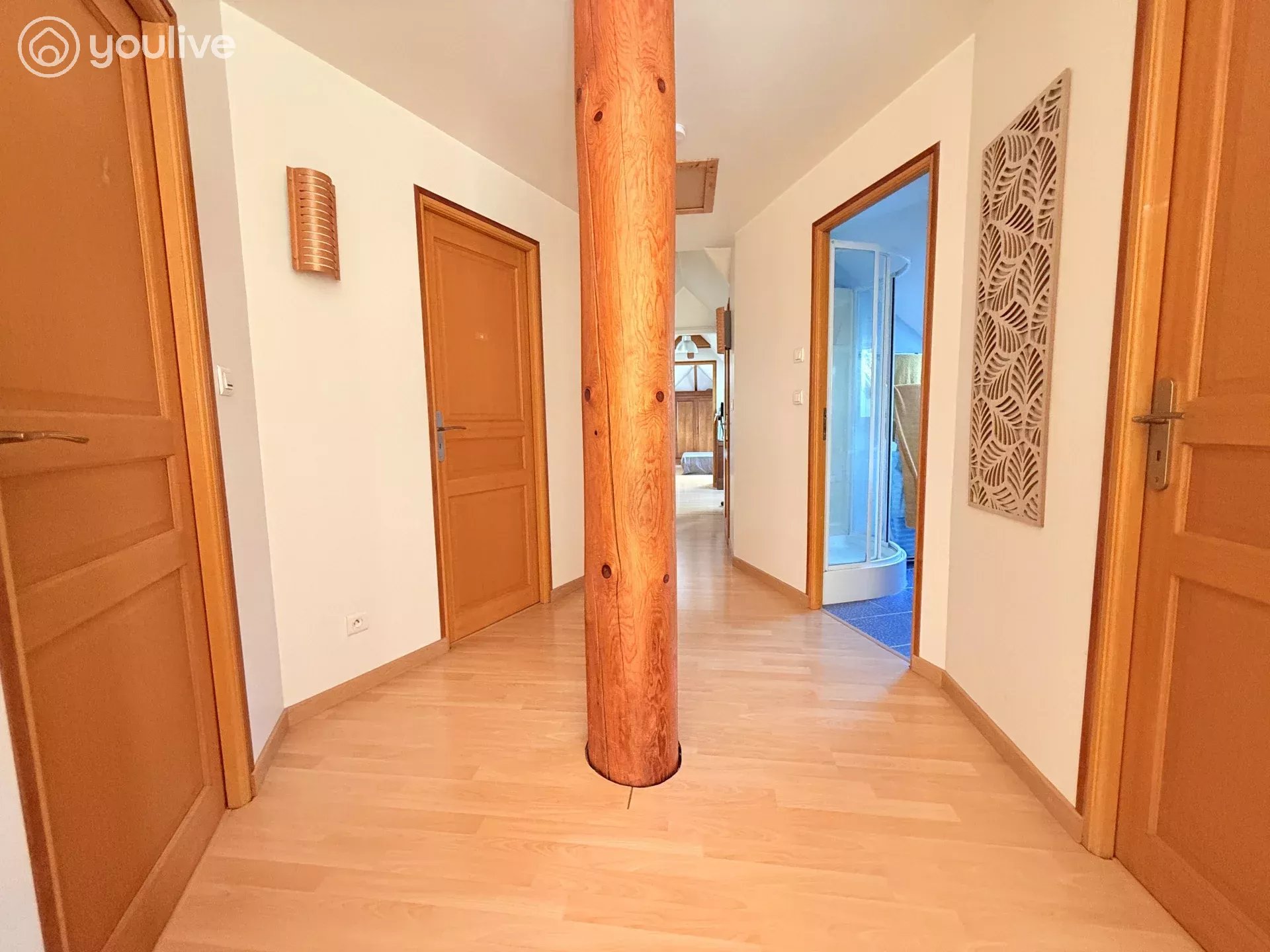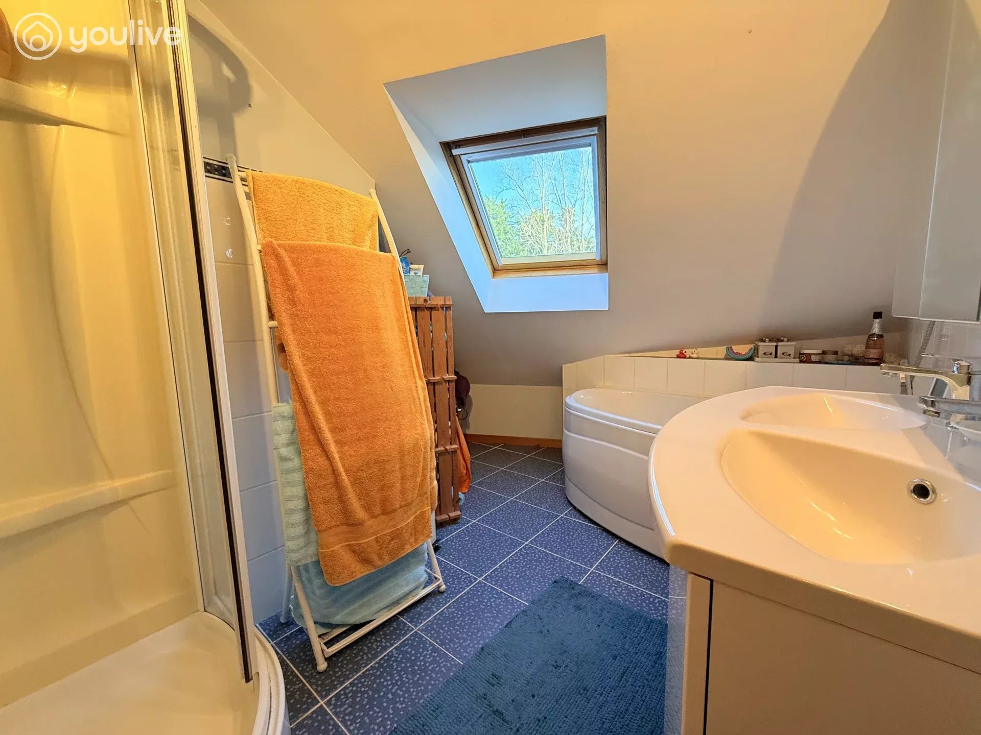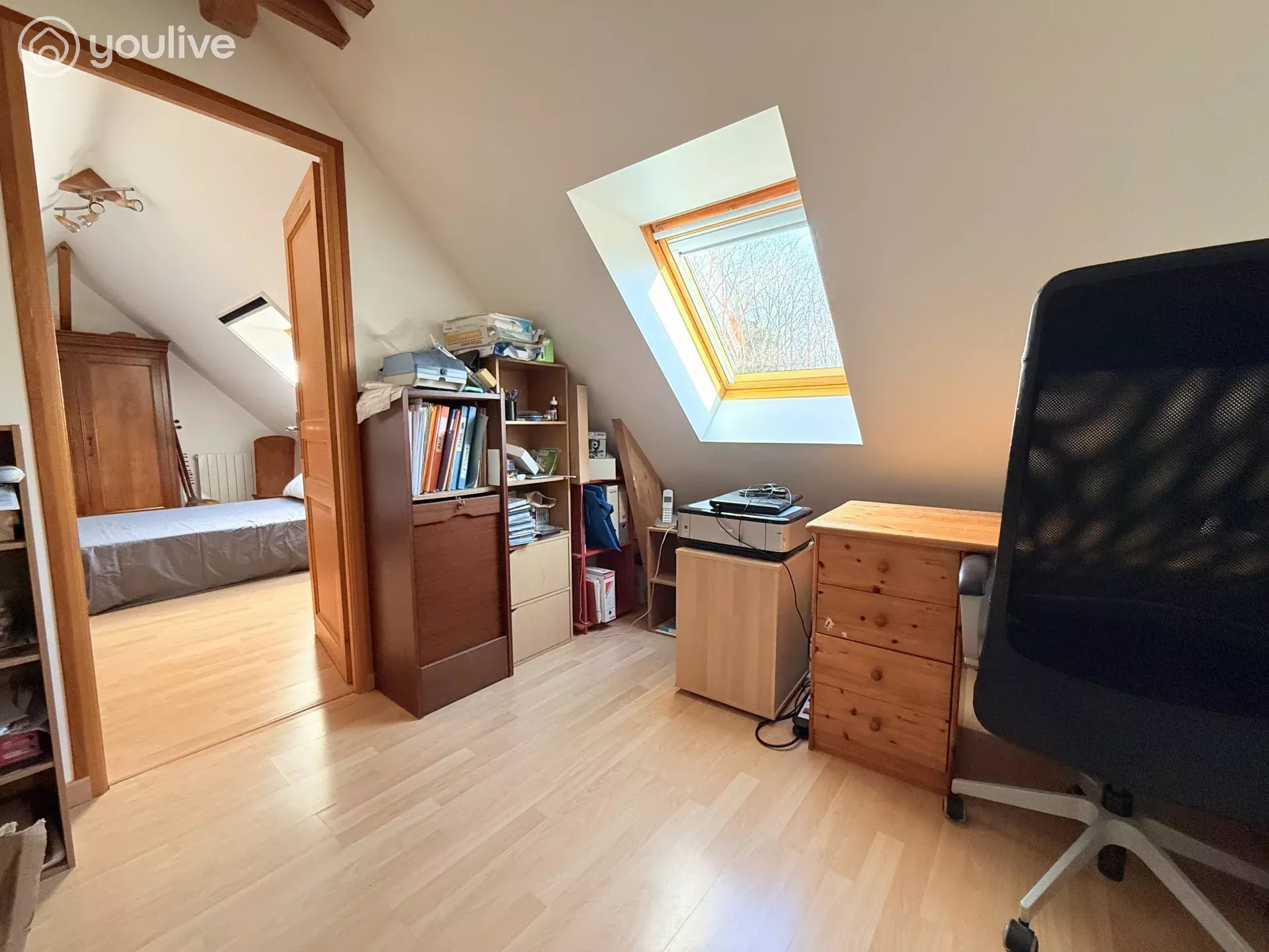 À l’étage : palier mezzanine, 4 chambres, bureau, grande salle de bain avec baignoire d’angle et douche, WC séparés avec lave-mains.