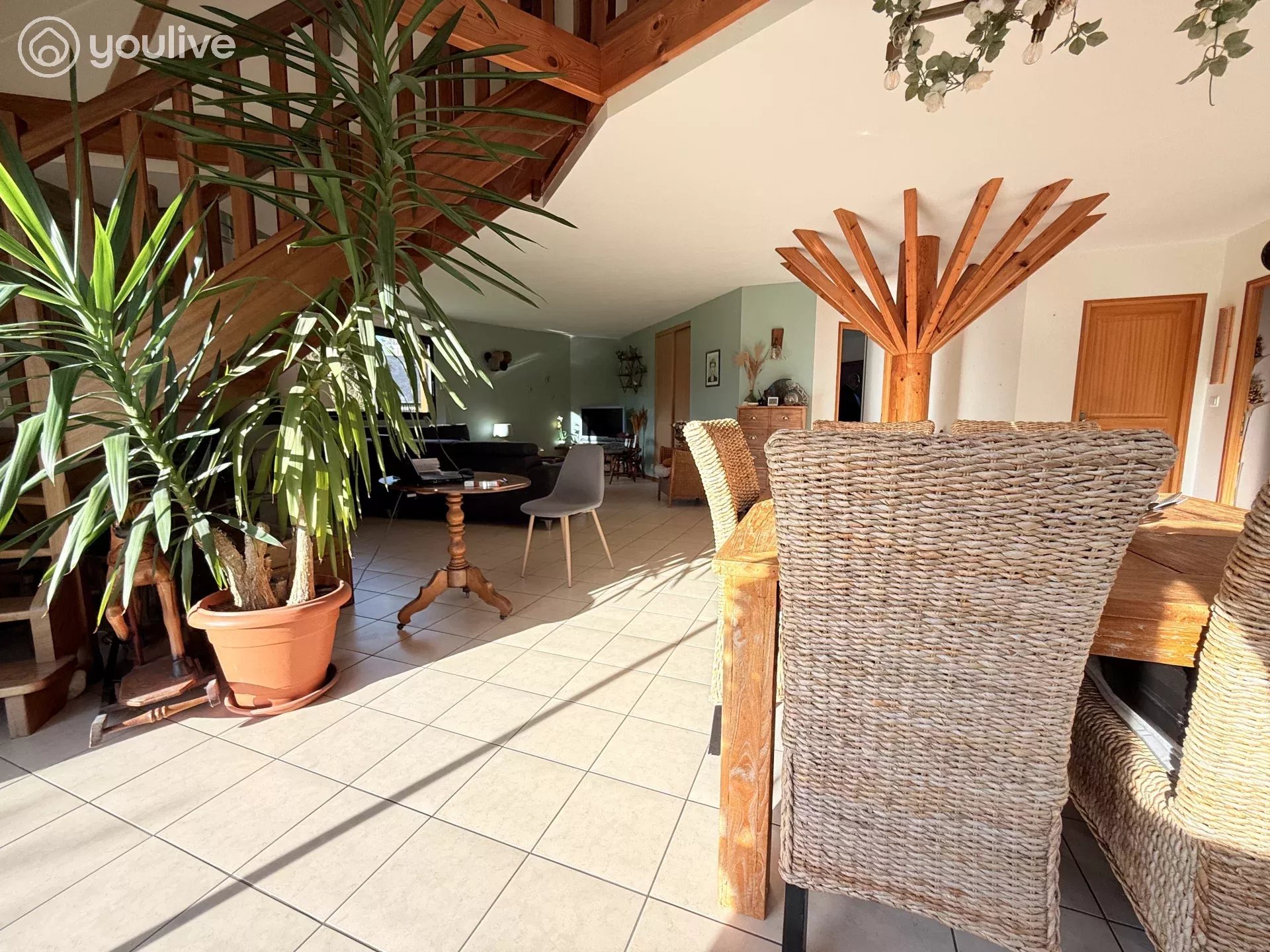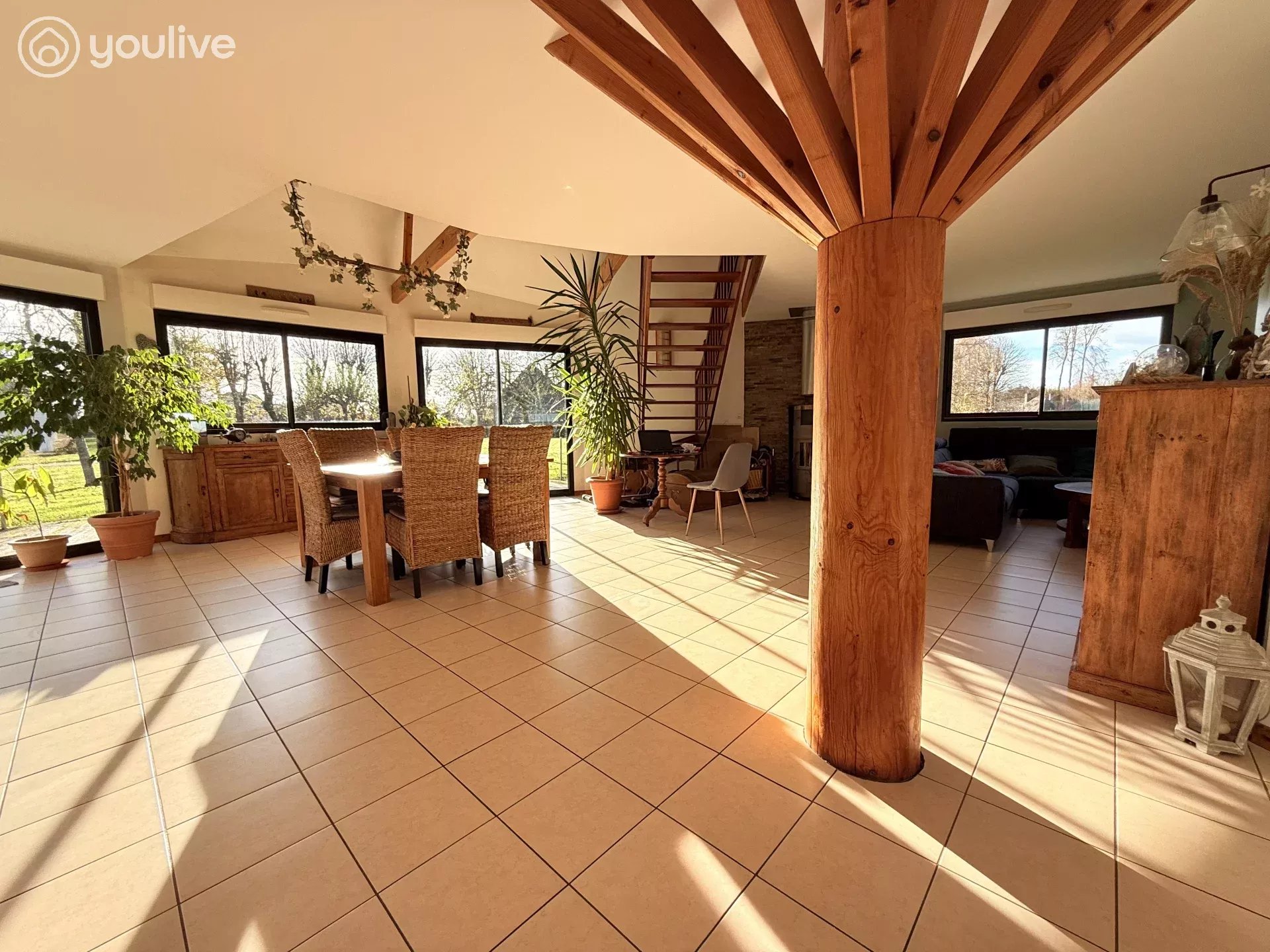 _ Pièce de vie panoramique 72 m2 : cuisine ouverte, lumière traversante, séjour cathédrale, mezzanine et poêle à bois — un espace chaleureux et idéal pour recevoir