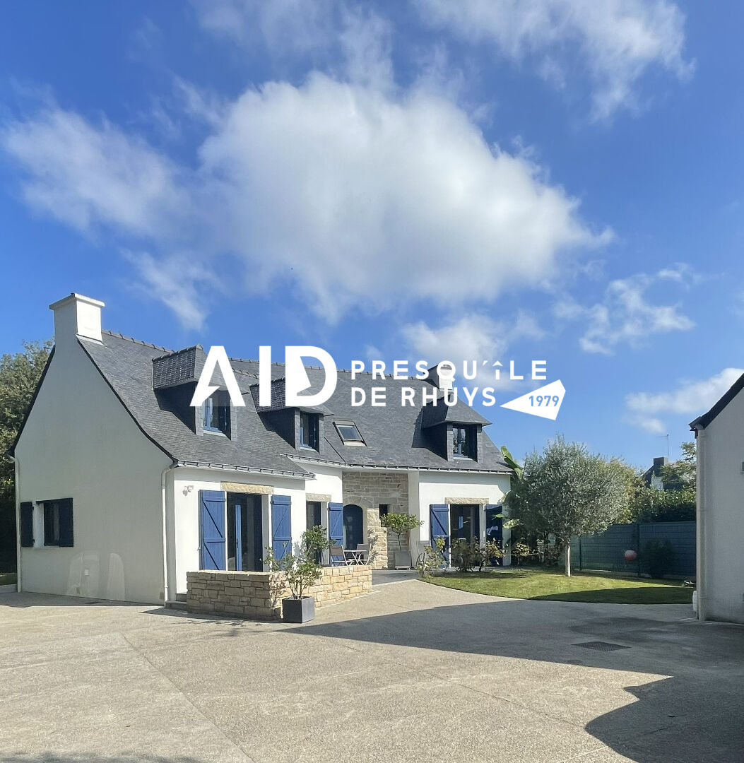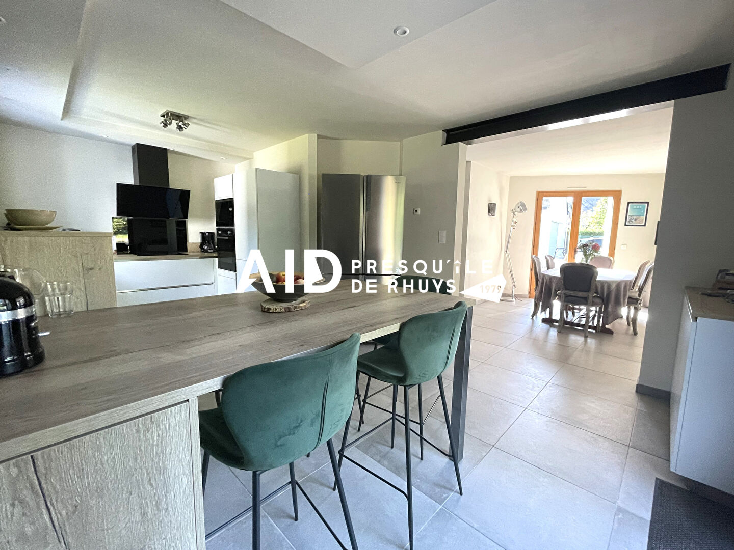 A proximité du Golfe, située en impasse, à l'abri de toute nuisance et sans vis-à-vis, nous vous proposons de découvrir cette agréable maison offrant volume et clarté. D'une superficie de 155 m², elle se compose : au rez-de-chaussée d'une entrée, un séjour-salon avec un poêle à pellet une cuisine aménagée, un cellier, une chambre, une salle d'eau et WC. A l'étage : une belle mezzanine dessert quatre chambres, une salle de bains, et un WC. Vous profiterez d'une terrain entièrement clos de plus de 1000 m² sur lequel est implanté un double garage avec un grenier. Les sentiers côtiers aux portes de la propriété vous permettront balades et détente sur les bords du Golfe du Morbihan. (5.00 % honoraires TTC à la charge de l'acquéreur.)