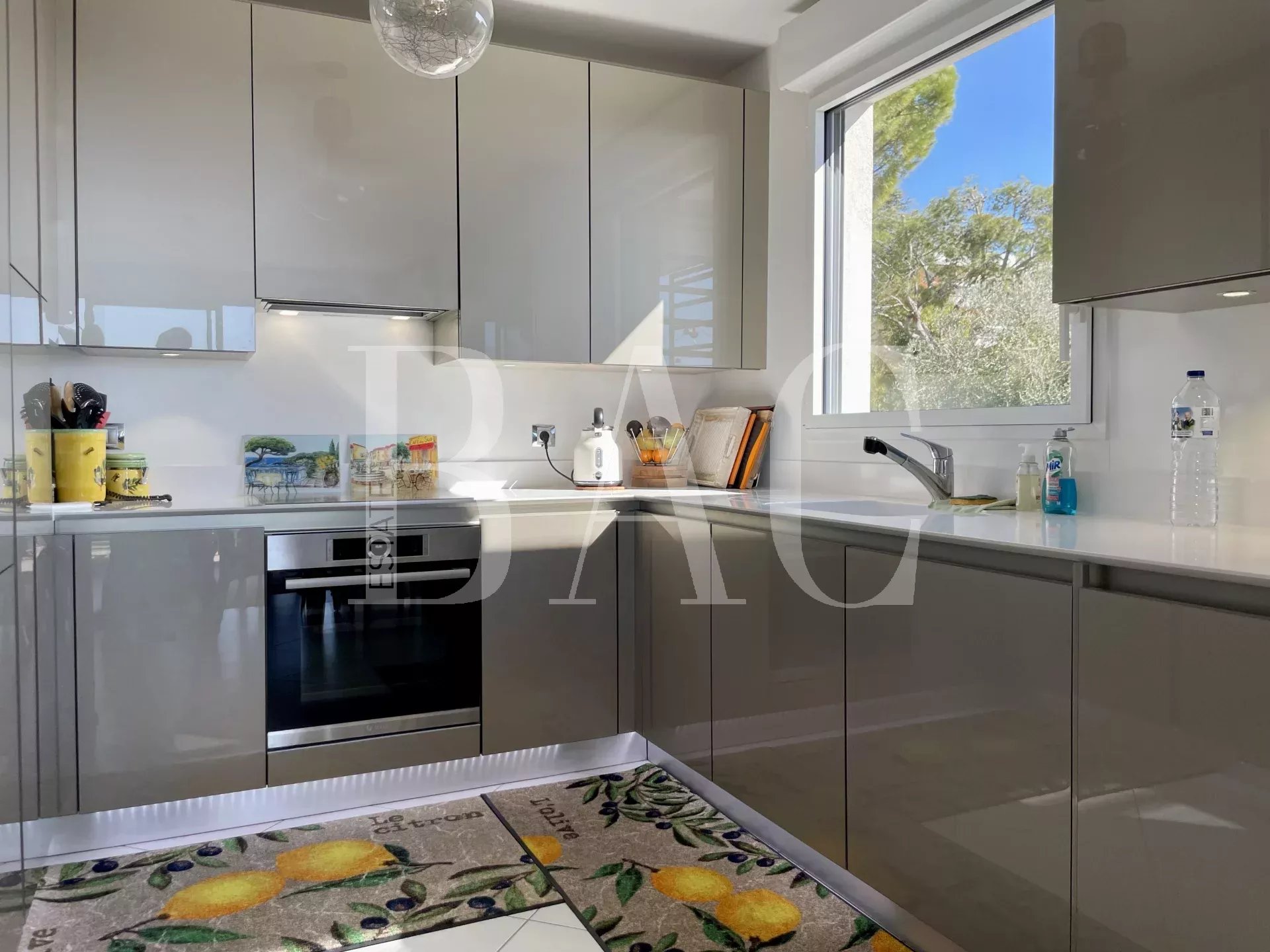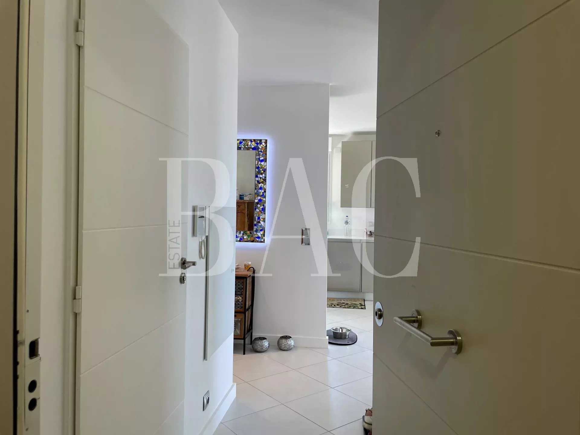 In piccola recente e lussuosa residenza, superbo appartamento trasversale con vista mare panoramica. Si compone di ingresso, soggiorno di 40 mq con cucina a vista, due ampie camere da letto, due bagni con doccia, terrazzo angolare di 20 mq con tripla esposizione, Est Sud e Ovest, cantina e box doppio. Residence con piscina, negozi, autobus e scuole a meno di 200 metri.