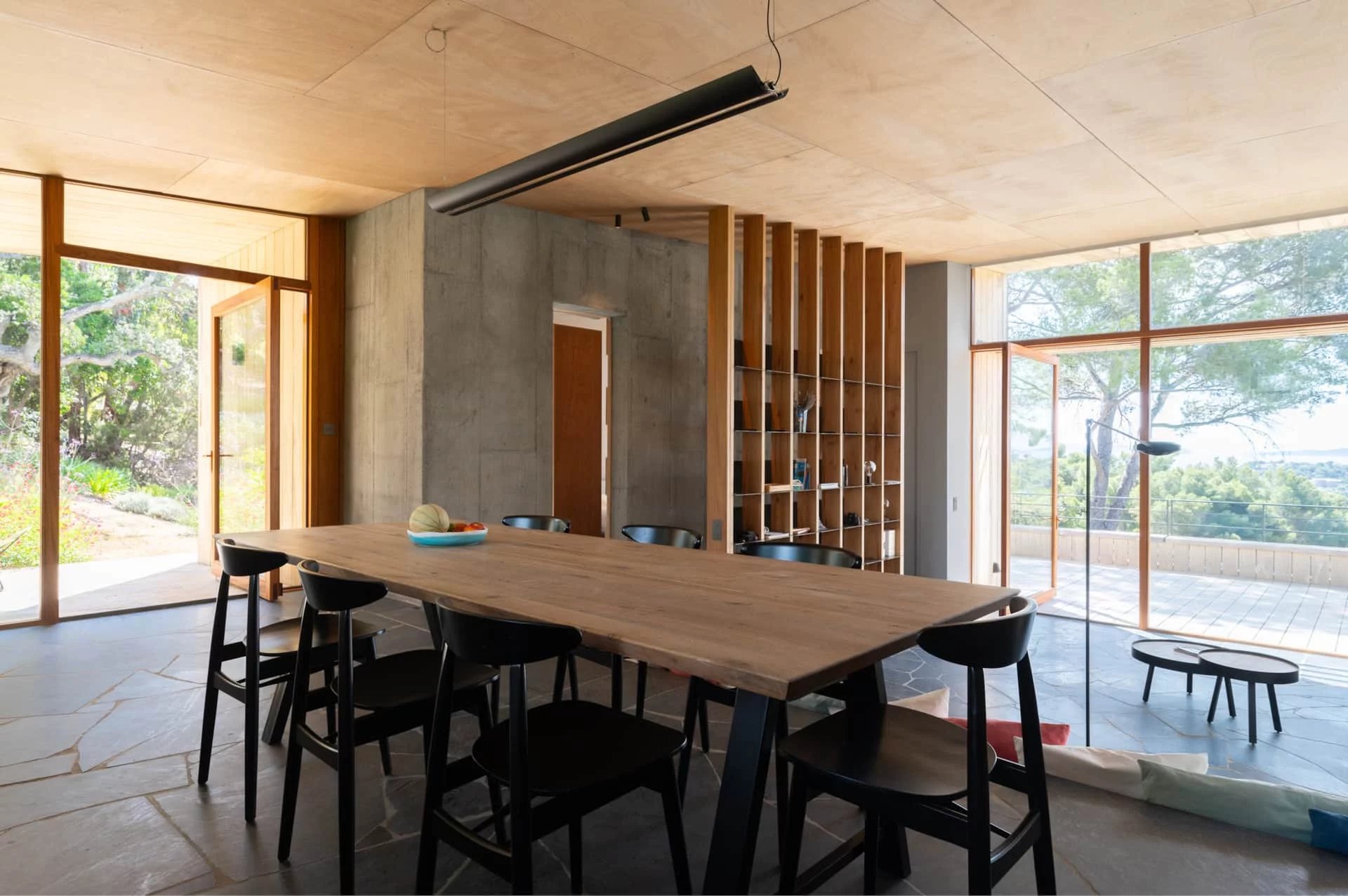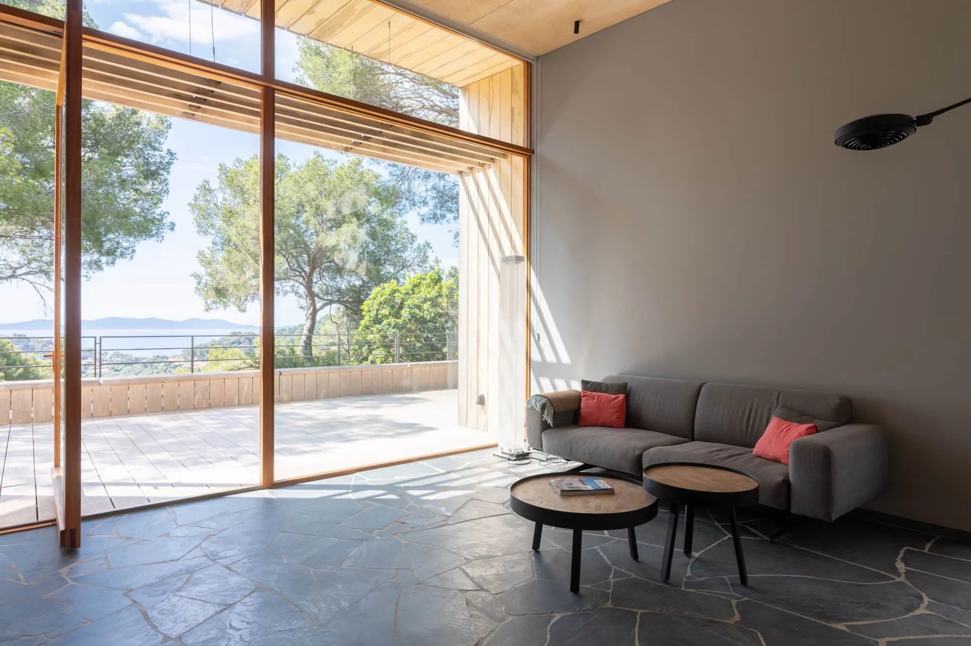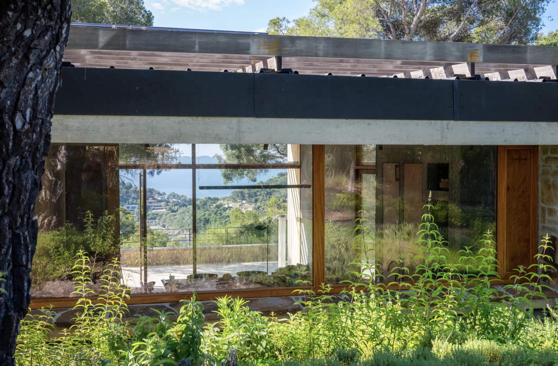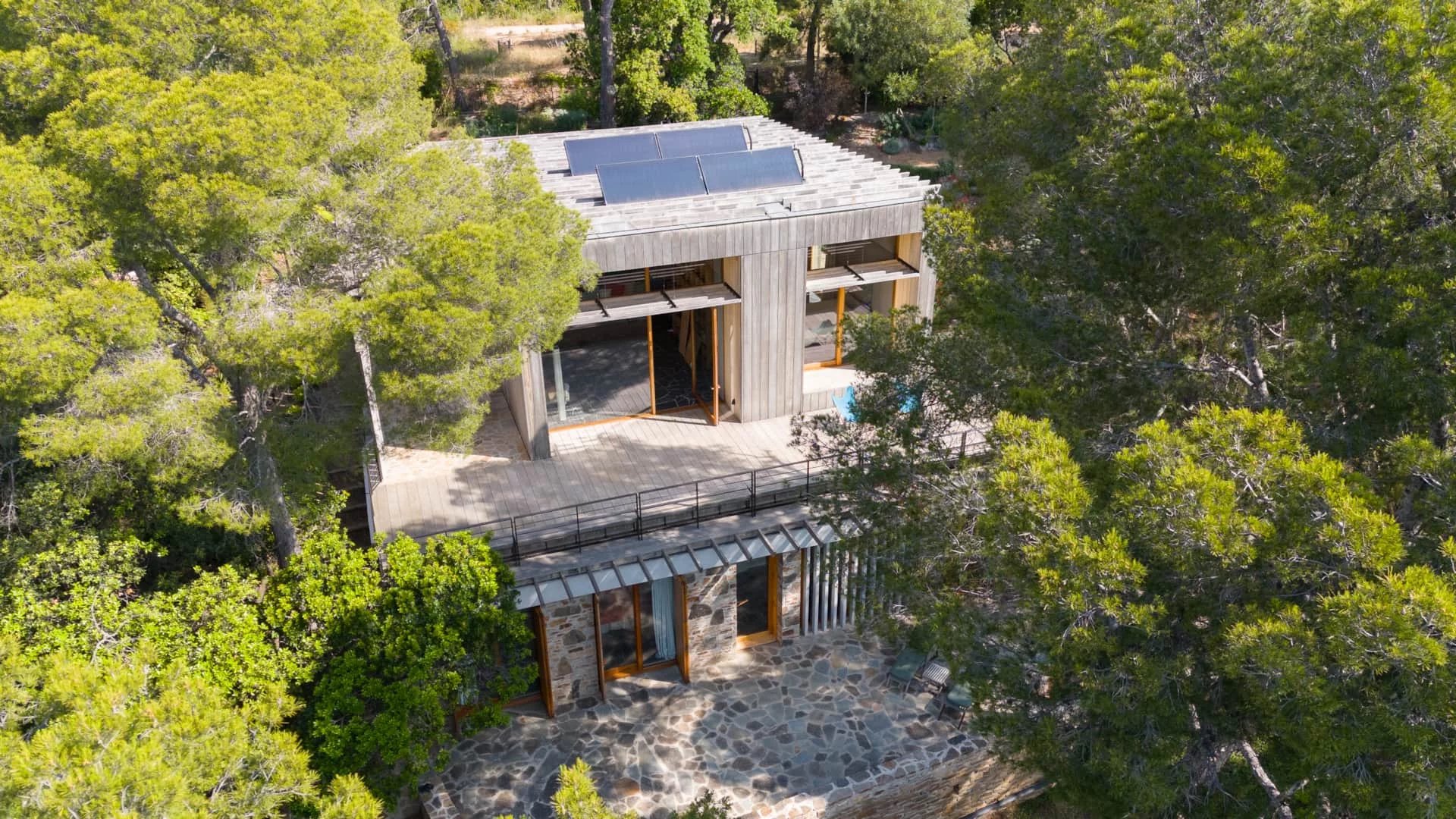 Les espaces de la villa sont largement ouverts sur la mer, les terrasses et la végétation. Son architecture se fond dans la végétation environnante, rendant la maison quasiment imperceptible dans le paysage.