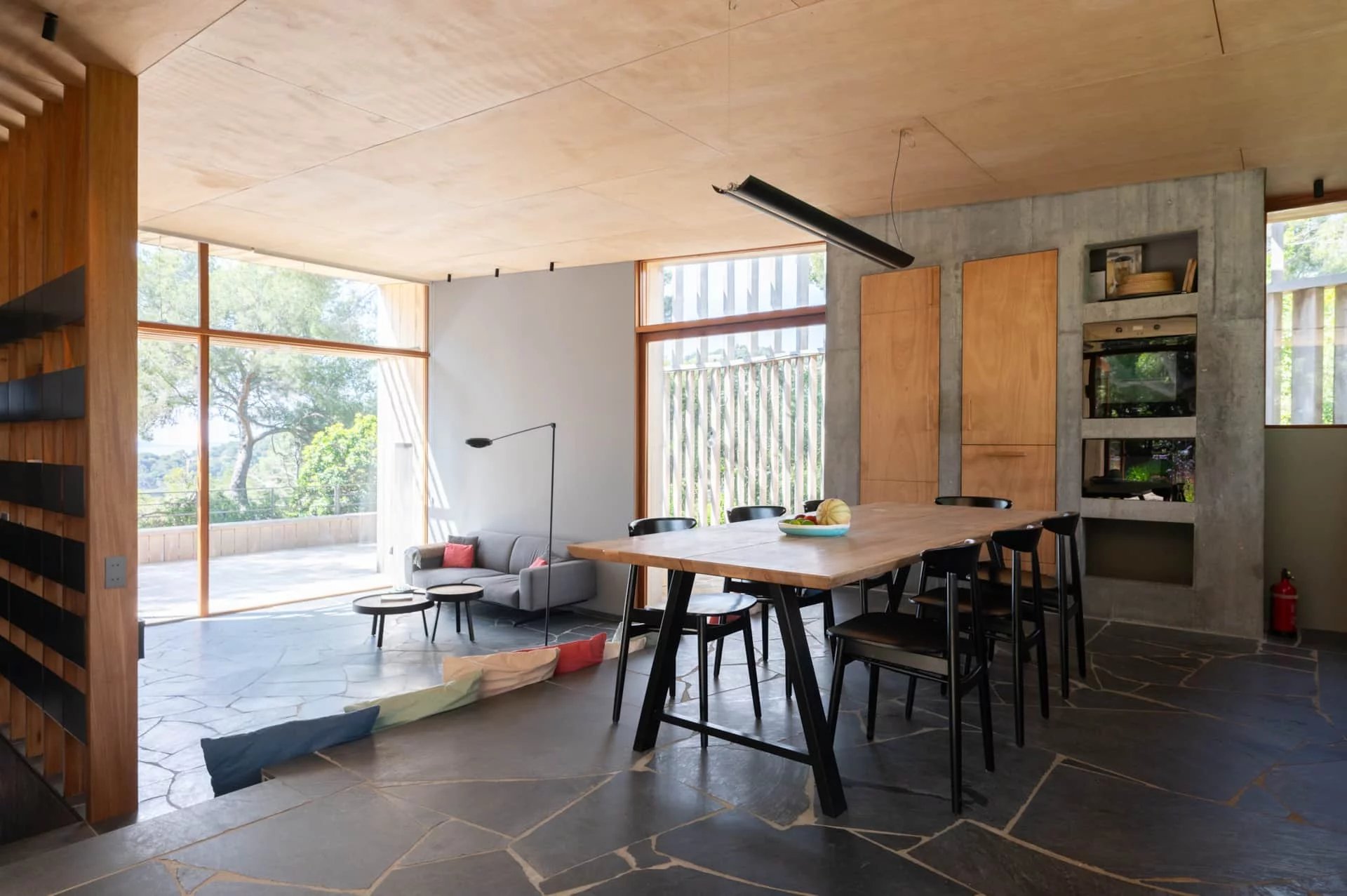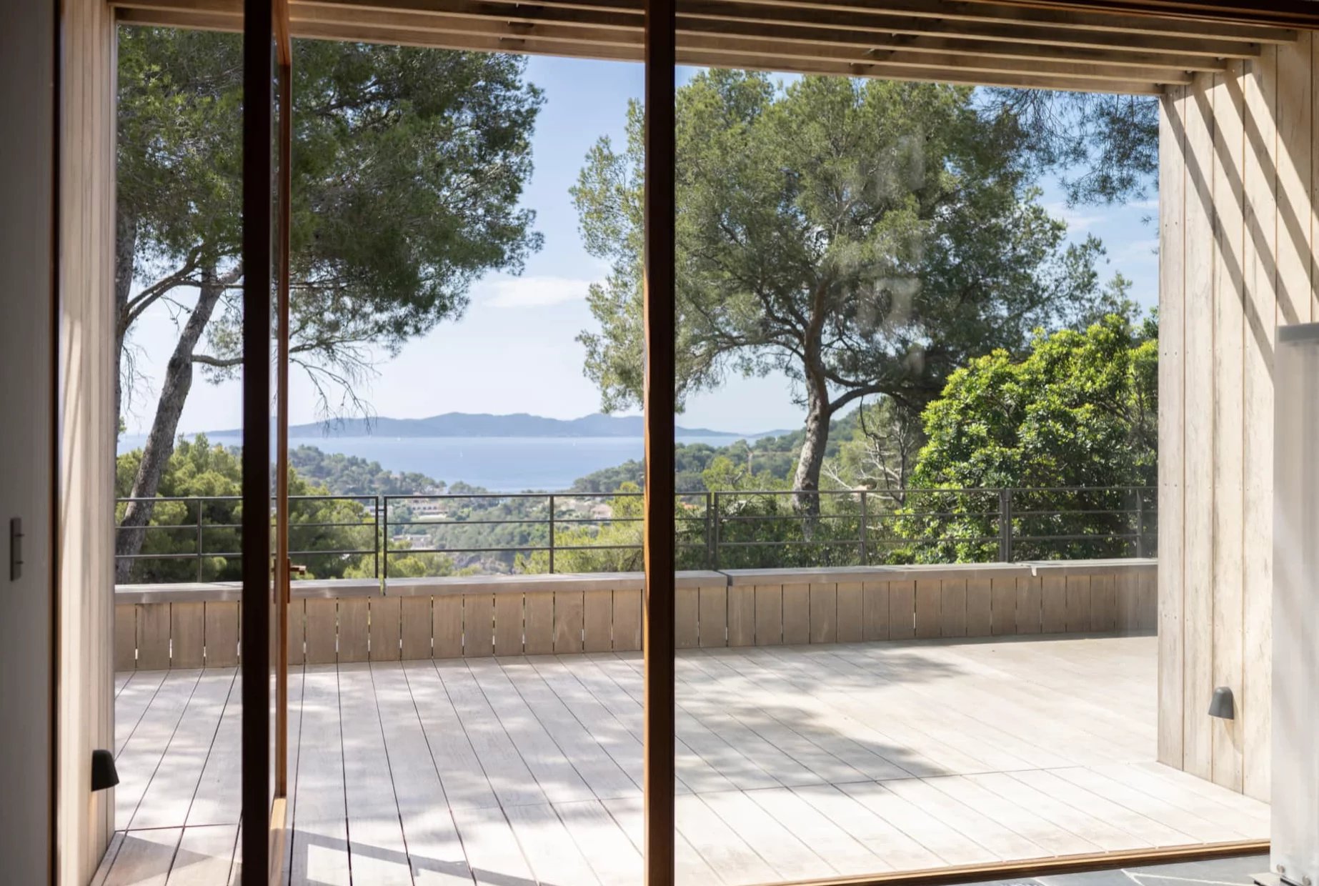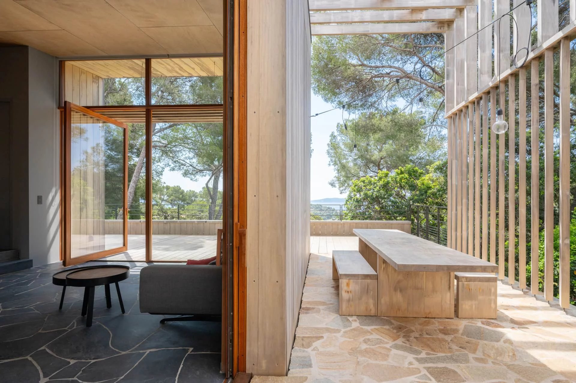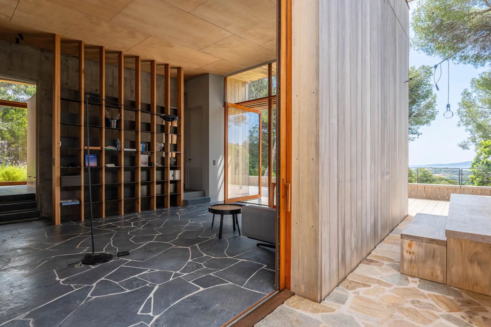 Les espaces de la villa sont largement ouverts sur la mer, les terrasses et la végétation. Son architecture se fond dans la végétation environnante, rendant la maison quasiment imperceptible dans le paysage.