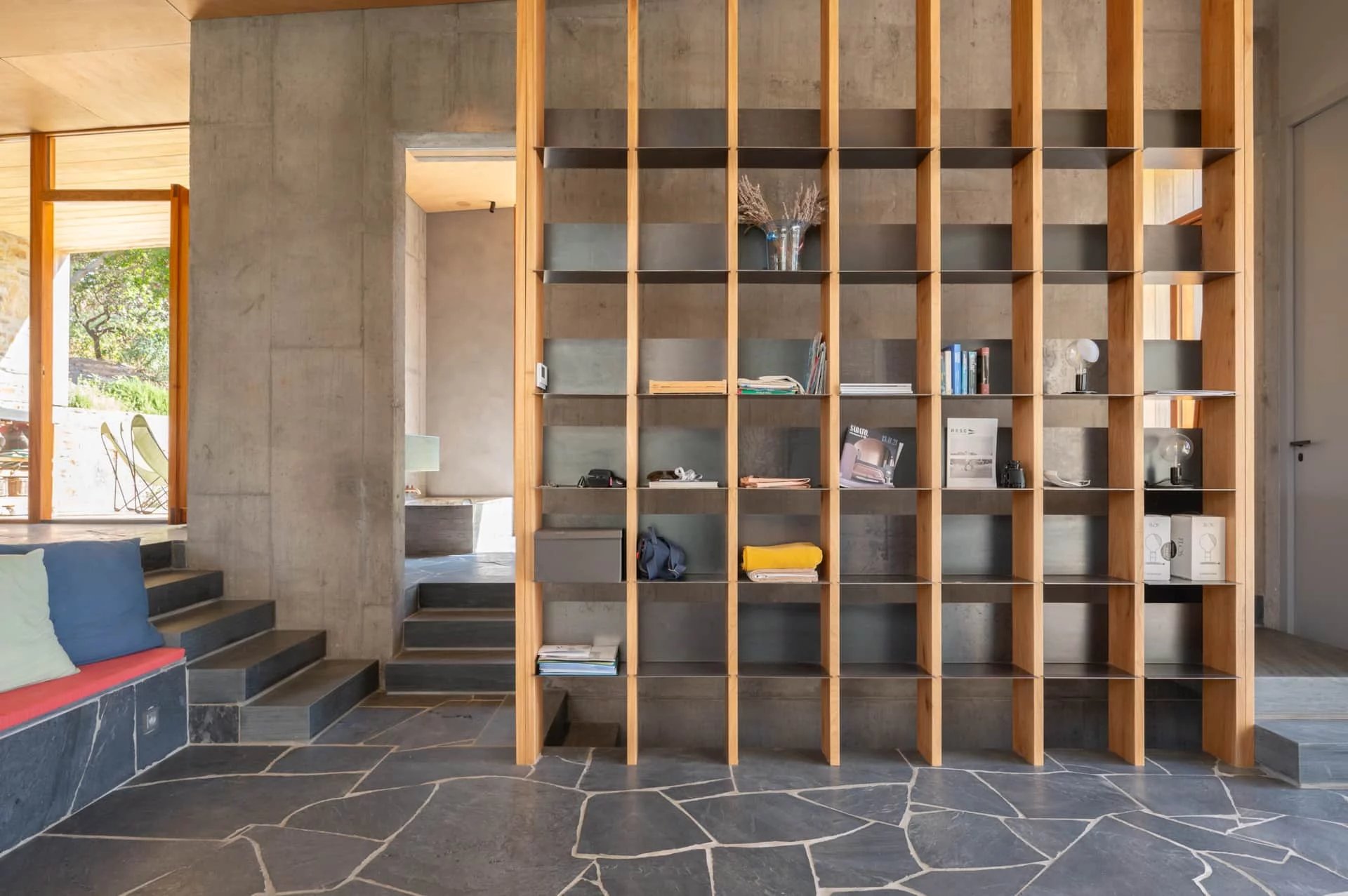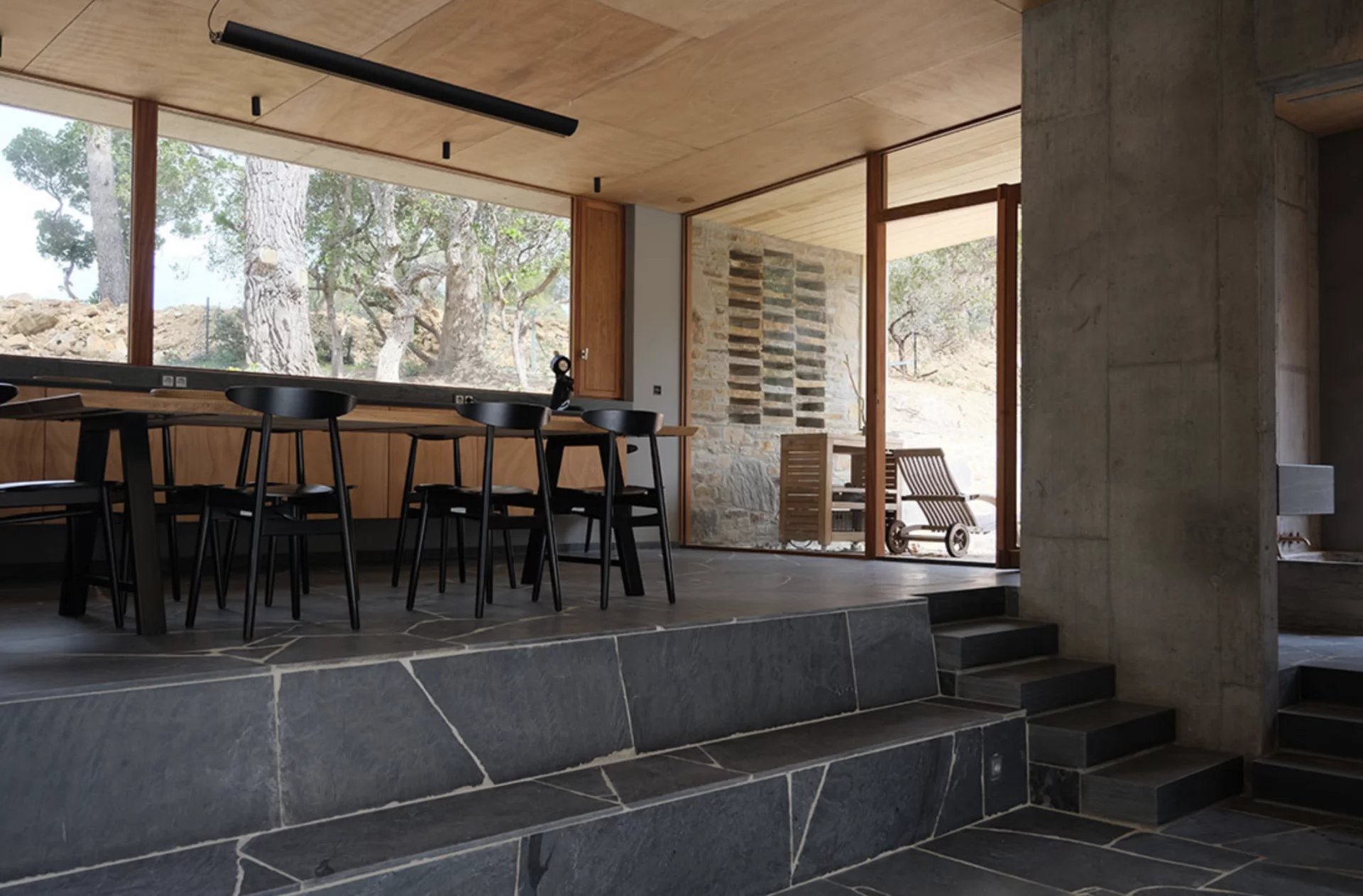 Son dessin architectural se fait l’expression de la nature massive des matériaux employés - la pierre locale, le bois et le béton. L’architecte a mené ici un véritable travail d’implantation de l’extension dans la pente et sans dénaturé le bâti existant.