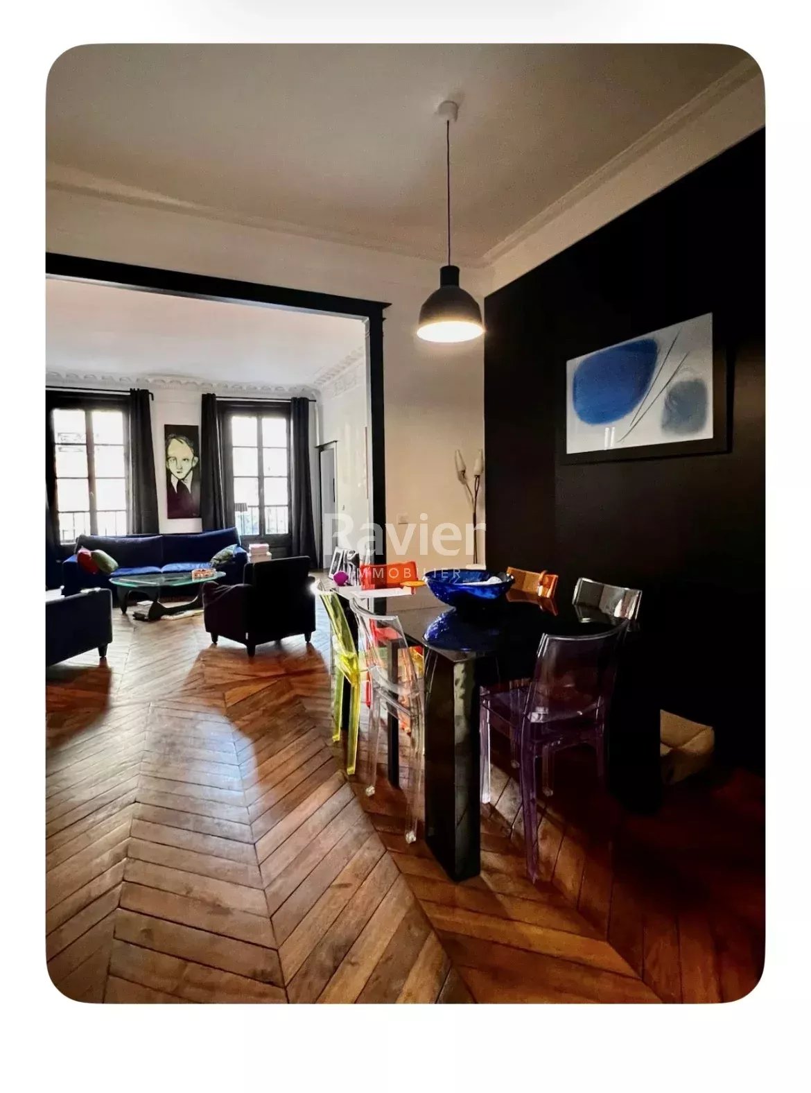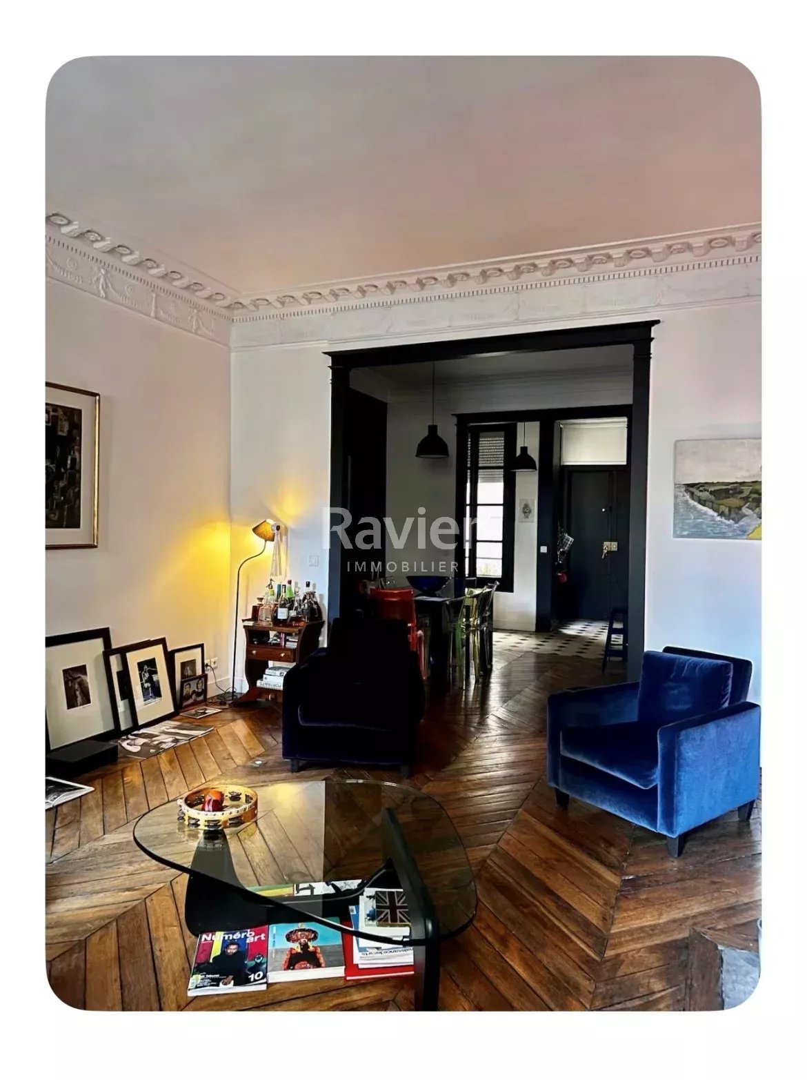 D’une surface de 80,65 m², les pièces de vie séduisent par leur belle hauteur sous plafond (3m20), leurs cheminées d’origine, leur parquet en point de Hongrie et bénéficient d’une vue sur une rue perpendiculaire, apportant luminosité naturelle et ouverture visuelle.