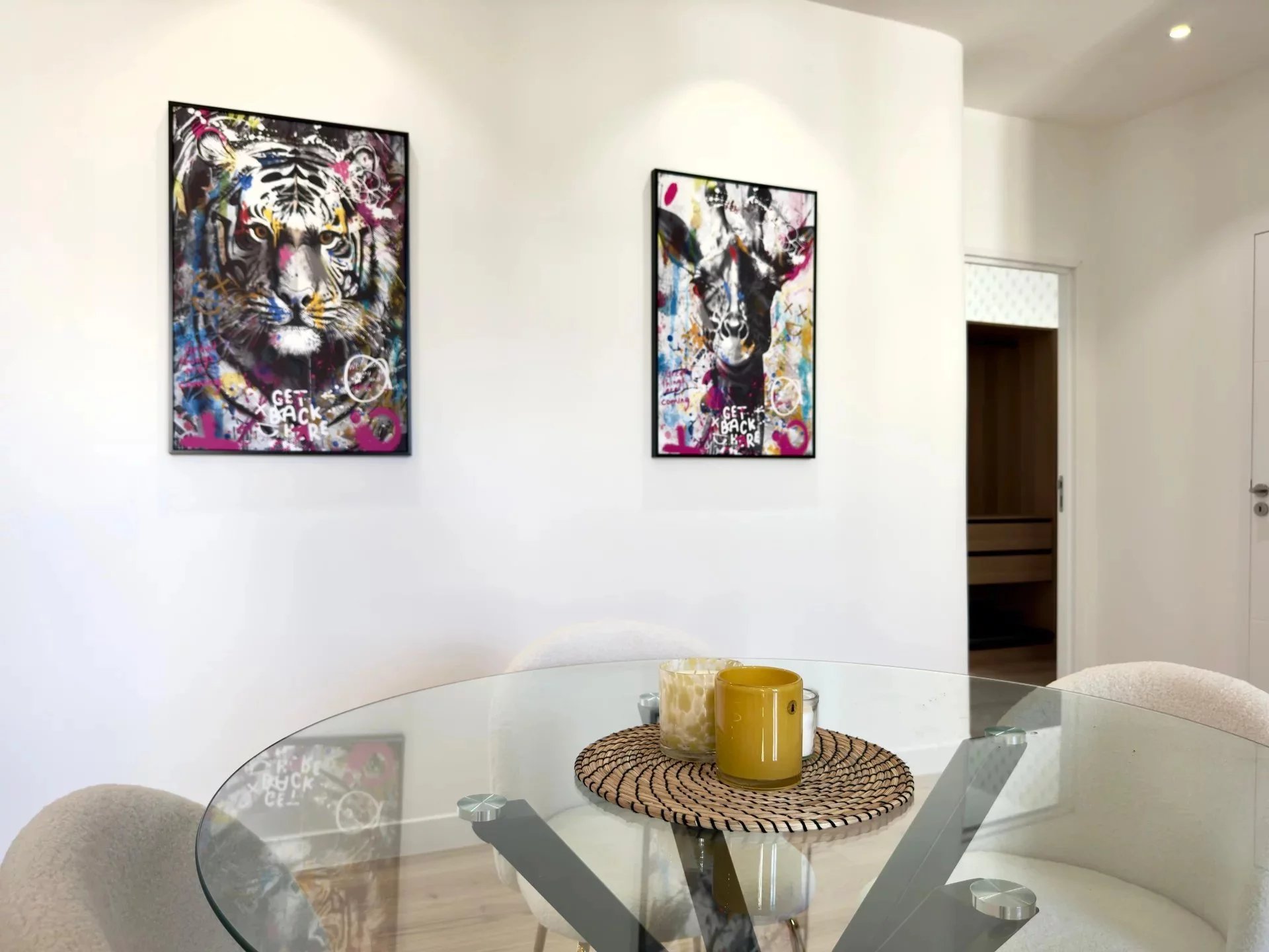 L’appartement s’ouvre sur un agréable séjour climatisé, agrémenté d’un espace salle à manger, offrant une atmosphère conviviale et chaleureuse. La cuisine ouverte, totalement équipée, apporte une touche contemporaine et optimise parfaitement l’espace. La partie nuit se compose de deux chambres, dont l’une disposant d’un dressing intégré, complétée par un dressing indépendant supplémentaire, offrant ainsi de nombreux espaces de rangement. Une salle d’eau moderne avec toilette vient parfaire l’ensemble.