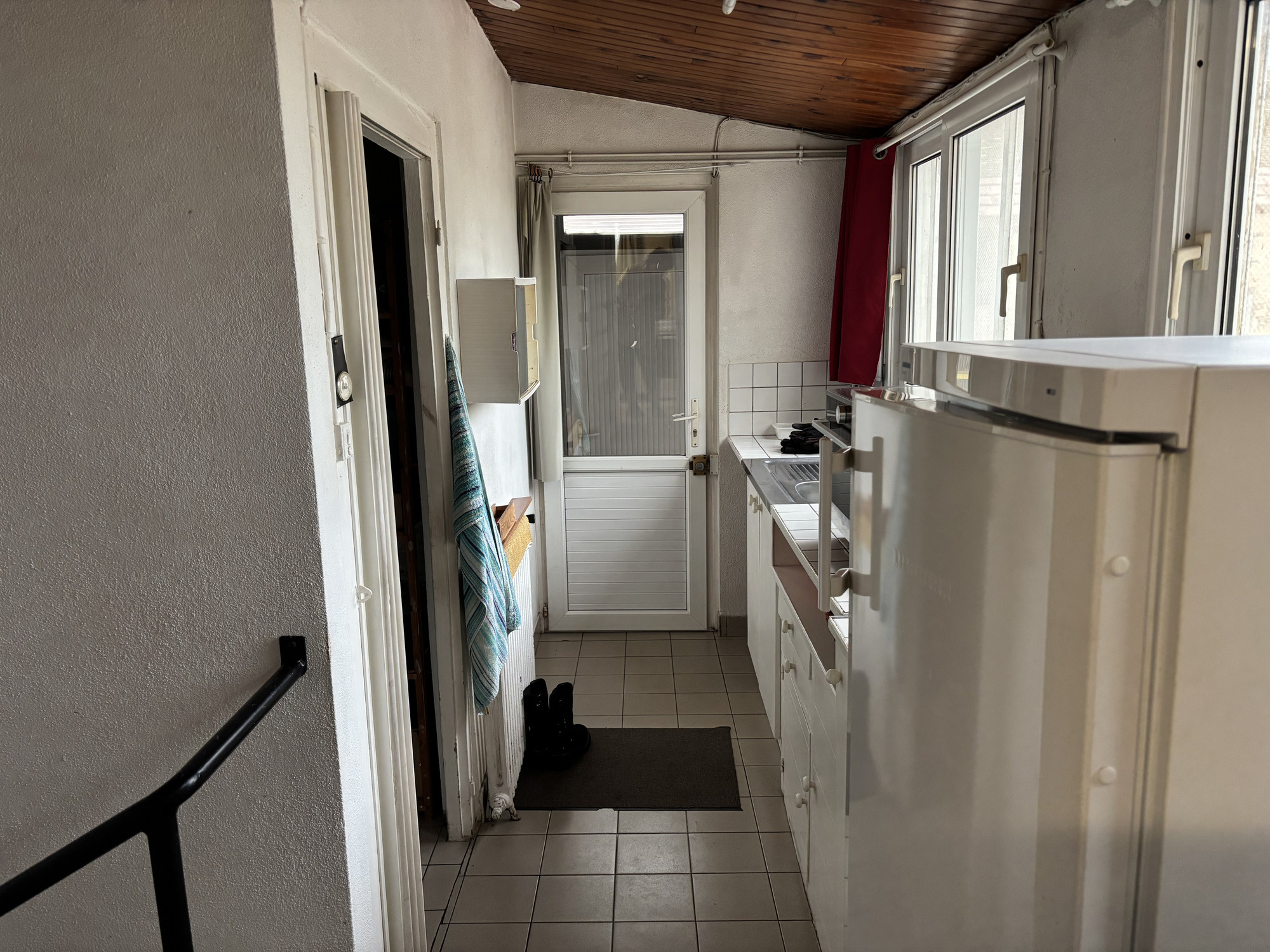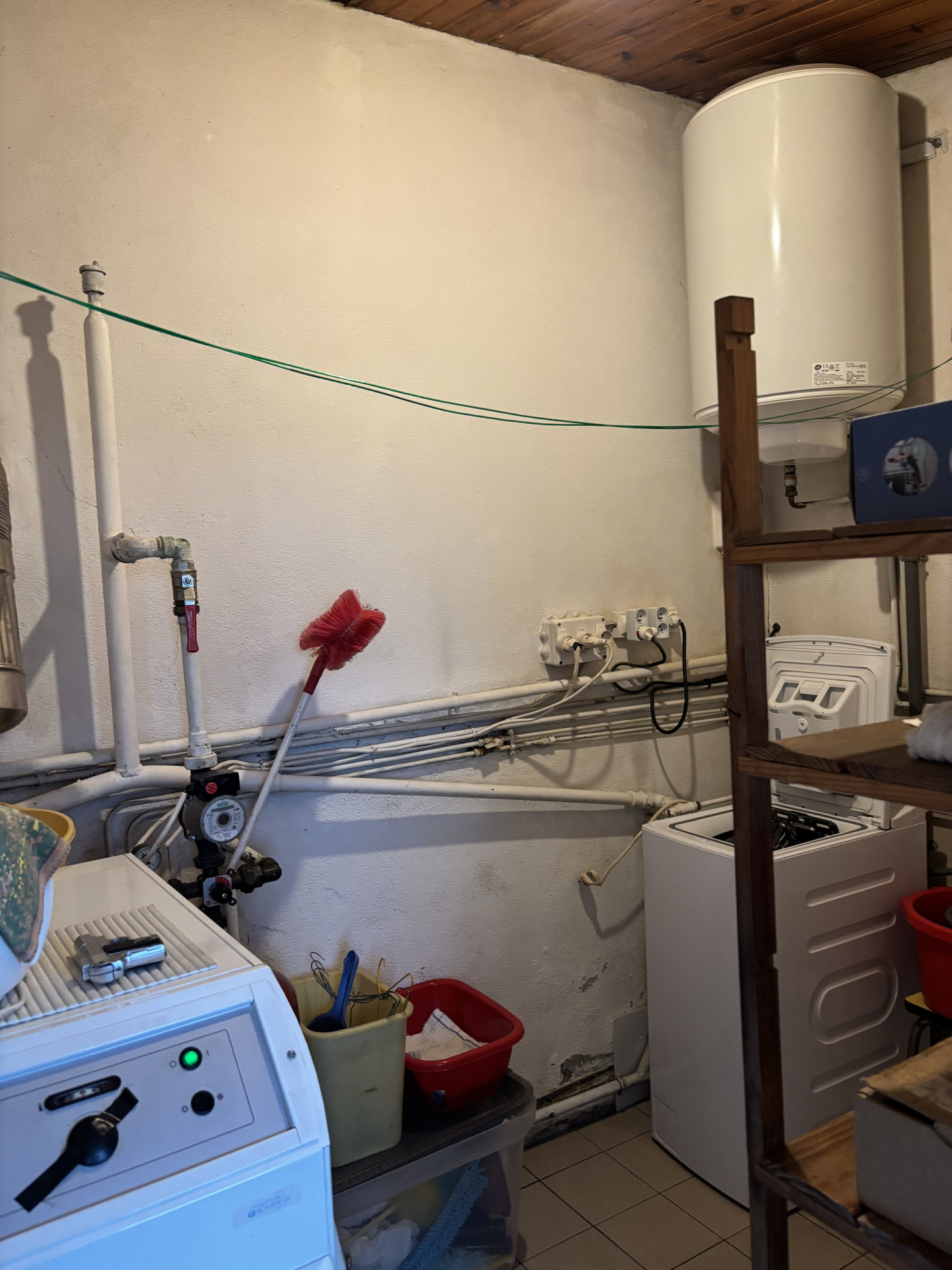 À gauche du hall se trouve la salle à manger avec une ancienne cheminée (hors service) et des portes-fenêtres donnant sur l'arrière de la maison. Depuis la salle à manger, quelques marches mènent à la cuisine, qui donne ensuite accès à l'arrière-cuisine et à un local technique avec le chauffe-eau, la chaudière au fioul, le raccordement pour la machine à laver et un local séparé où se trouve le chauffage central au bois. Depuis l'arrière-cuisine, une porte mène à la cave, qui est équipée d'un sol en béton et de l'électricité.
