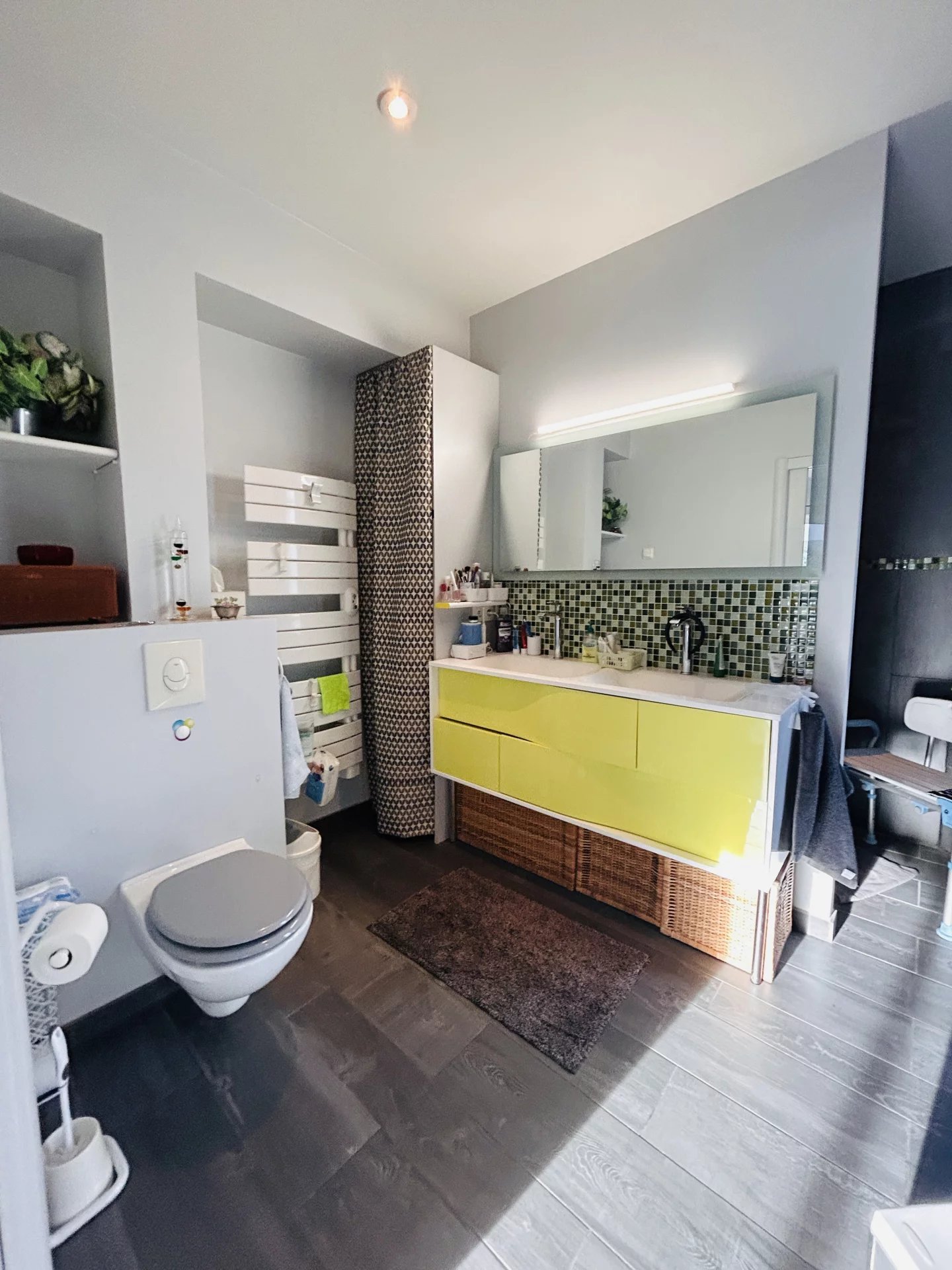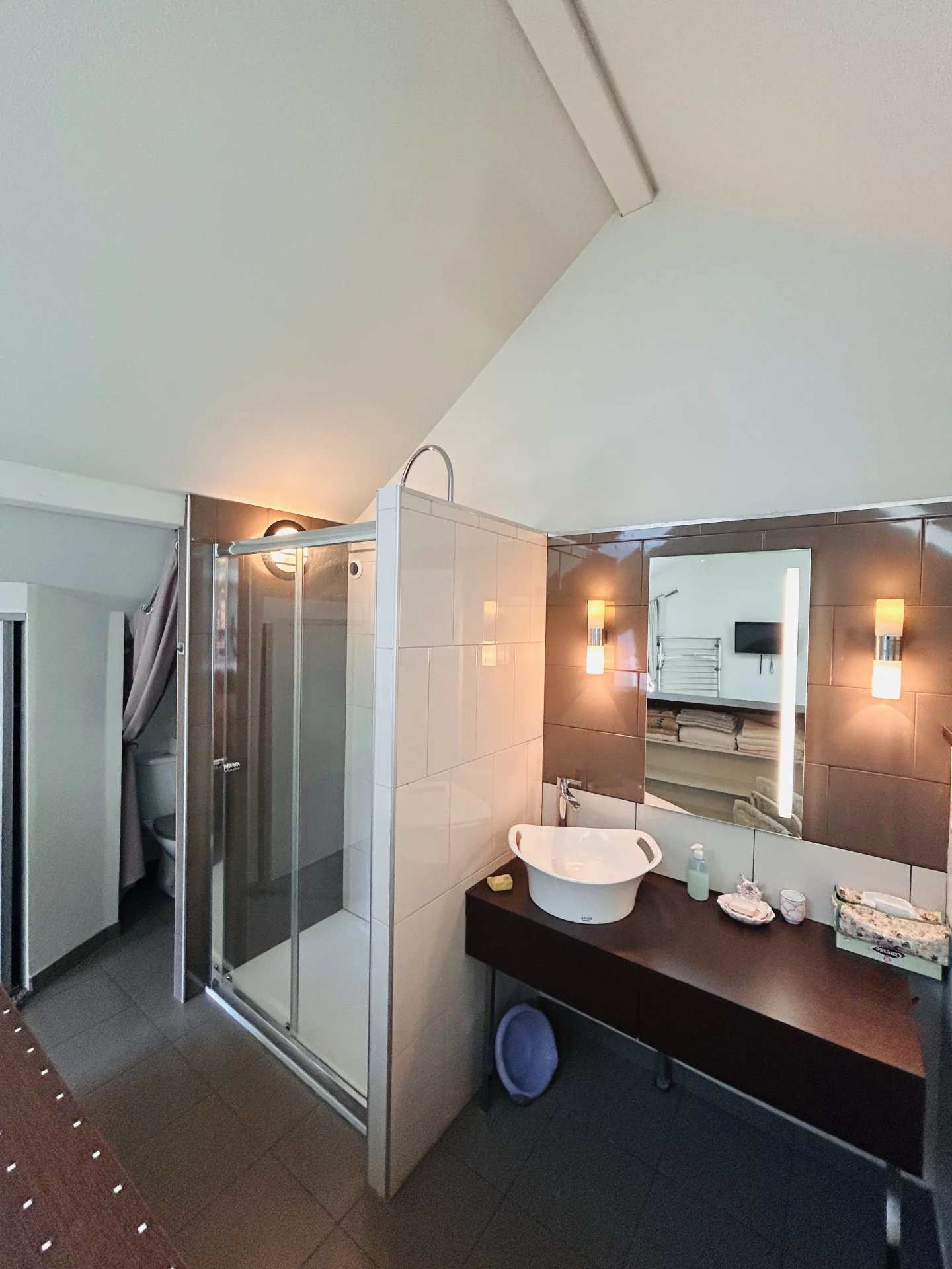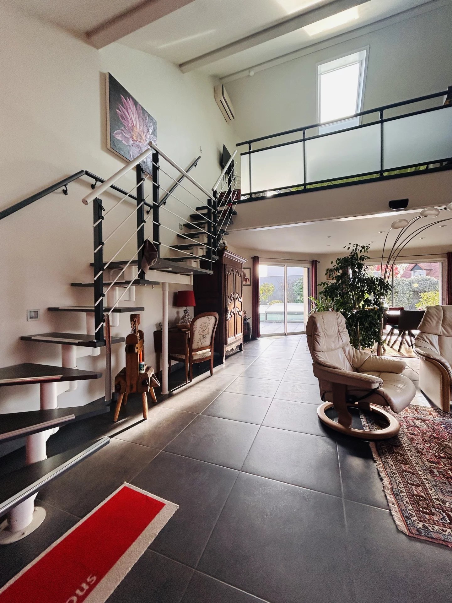 Côté nuit, la maison propose une suite parentale de plain-pied, composée d’une chambre, d’une salle de bains et d’un dressing. À l’étage, une deuxième suite en mezzanine offre un espace intime supplémentaire.