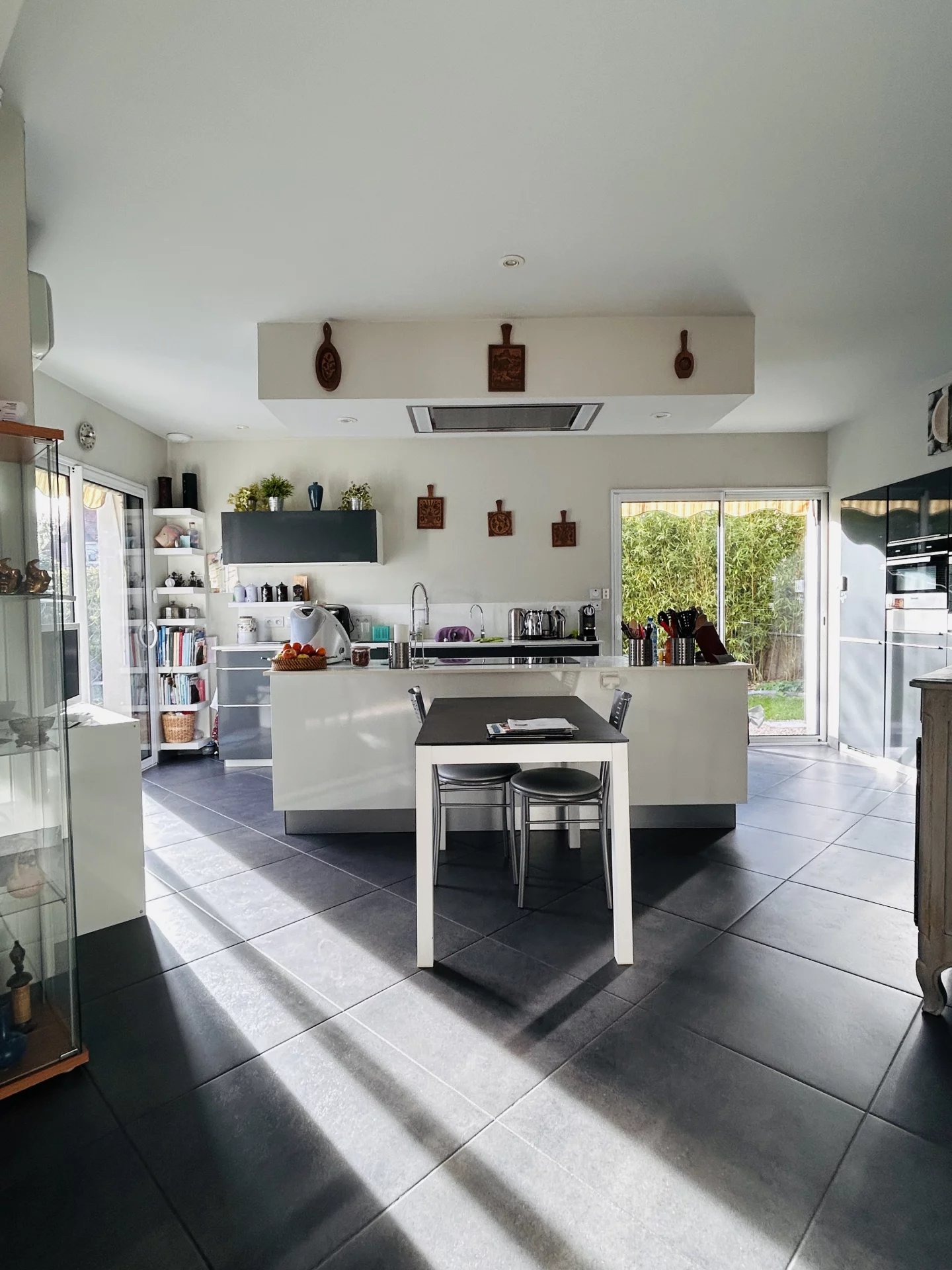 Une pièce de vie spacieuse et lumineuse accueille une cuisine entièrement équipée ouverte sur la terrasse et l’espace piscine.