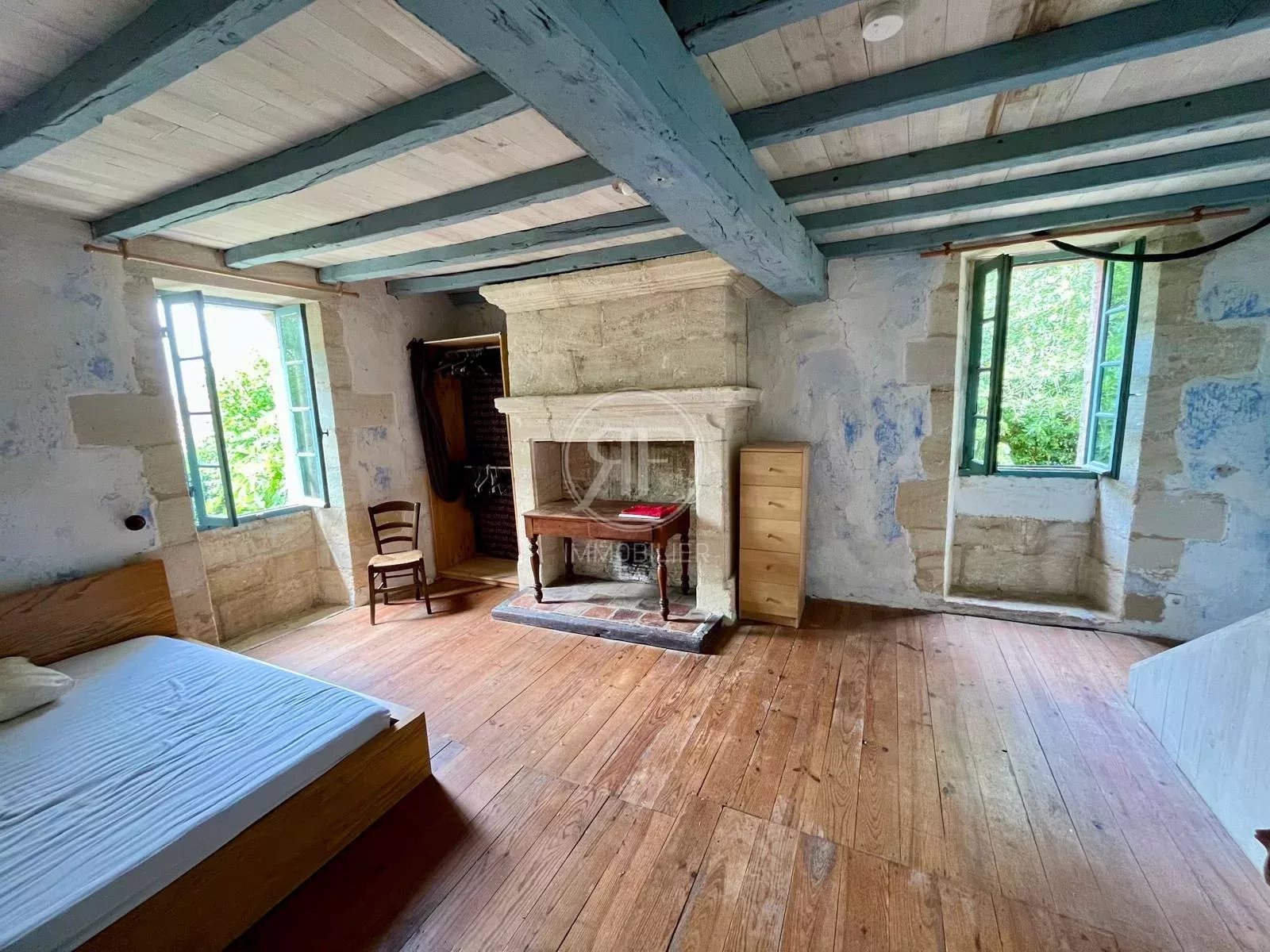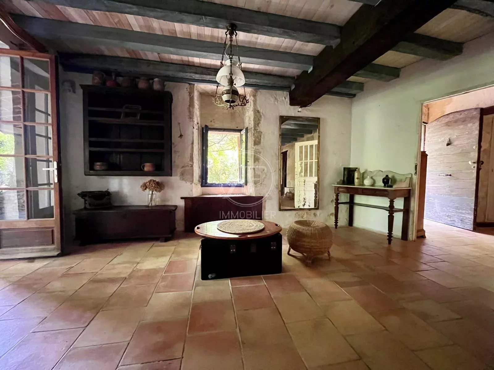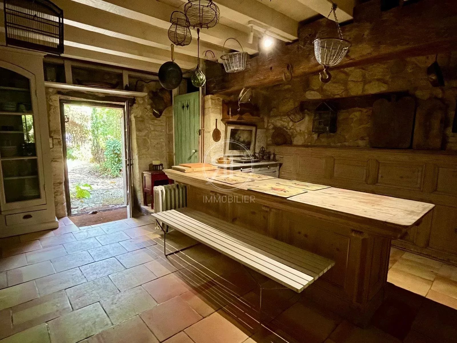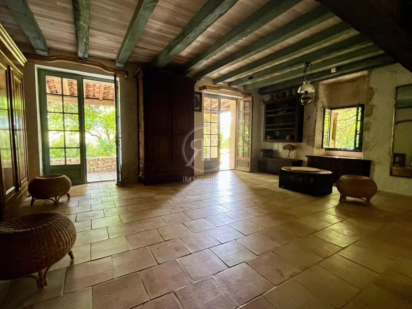 D'environ 215m², il se compose en RDC d'une pièce de vie donnant sur le jardin, d'une salle à manger avec cheminée, d'une cuisine et d'un WC.