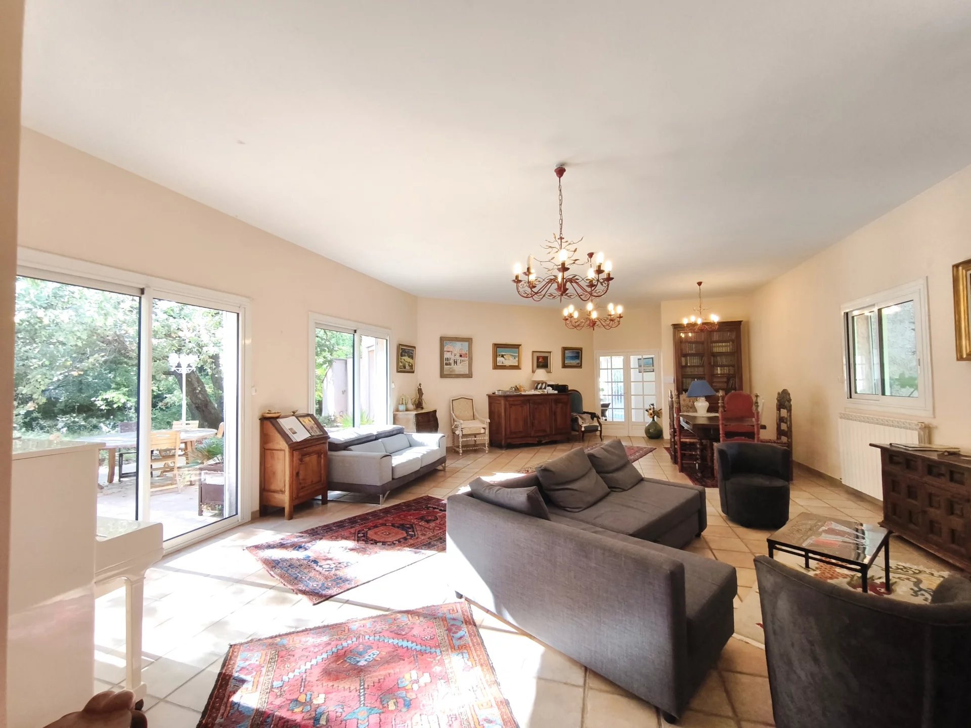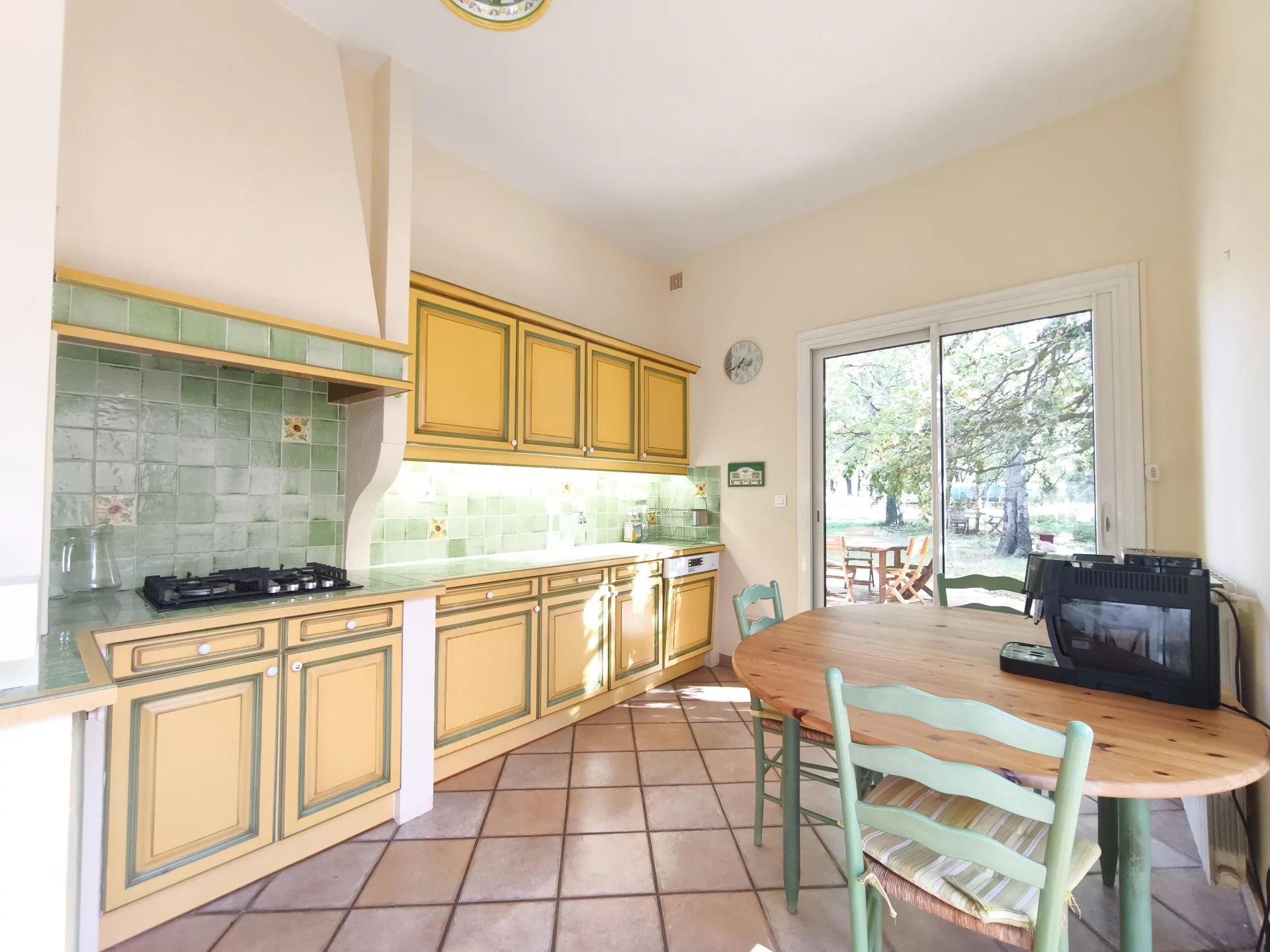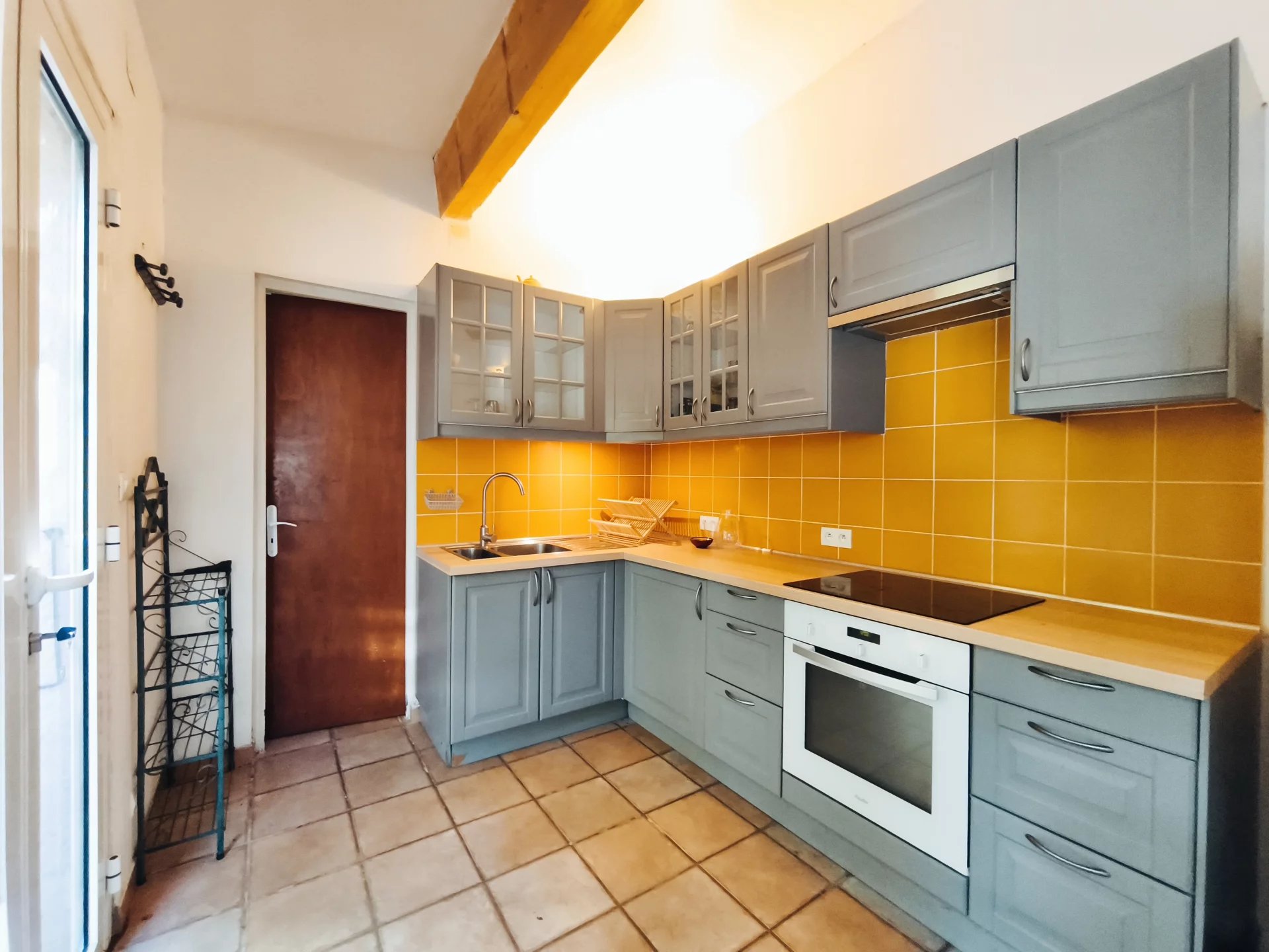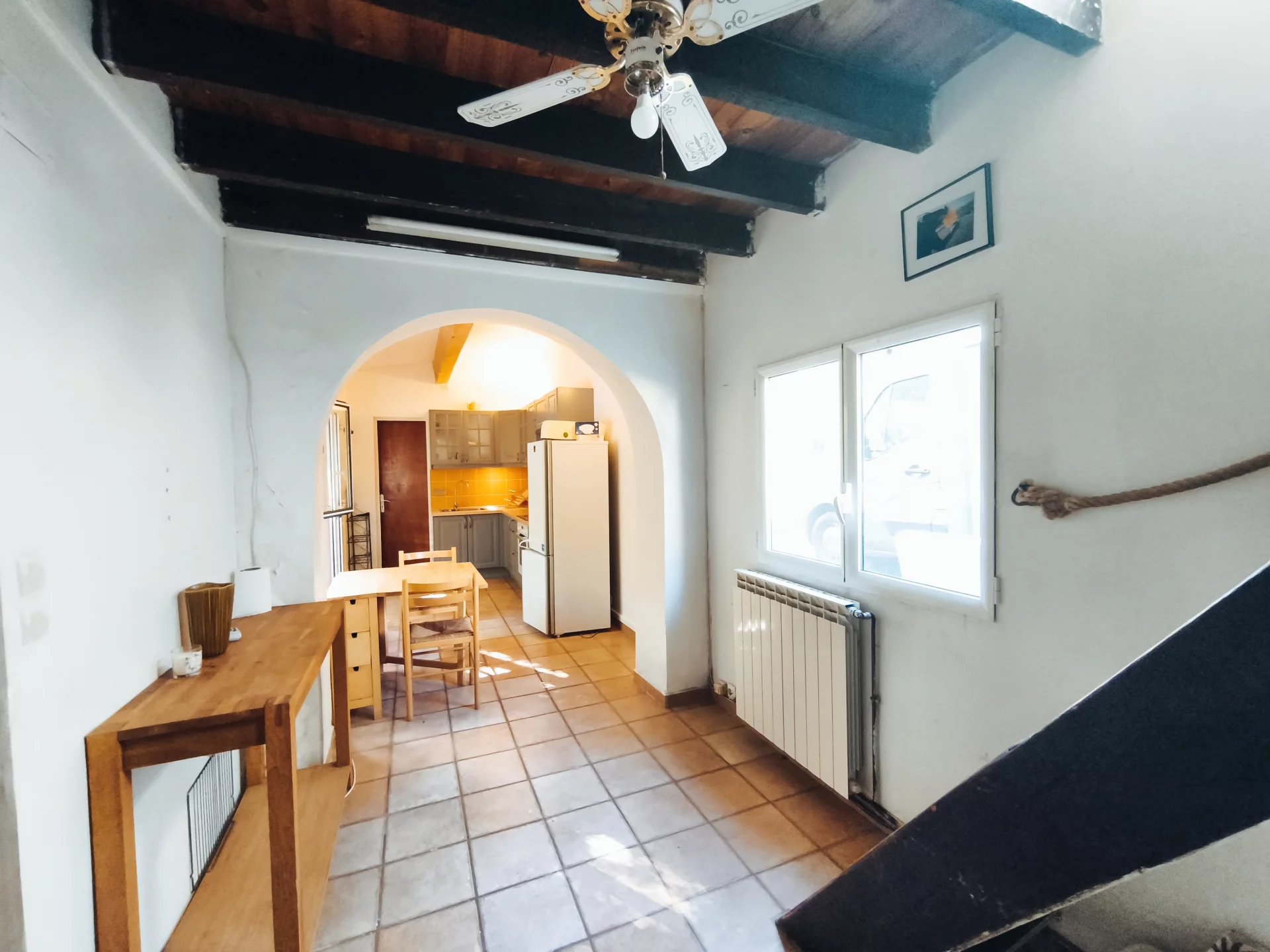 La seconde habitation, attenante, développe environ 118 m² et s’ouvre sur un large salon cathédrale, une cuisine séparée, un espace bureau et une chambre parentale avec salle d’eau. Les deux habitations s’articulent autour d’un patio central invitant à la détente, idéal pour créer une atmosphère méditerranéenne chaleureuse.