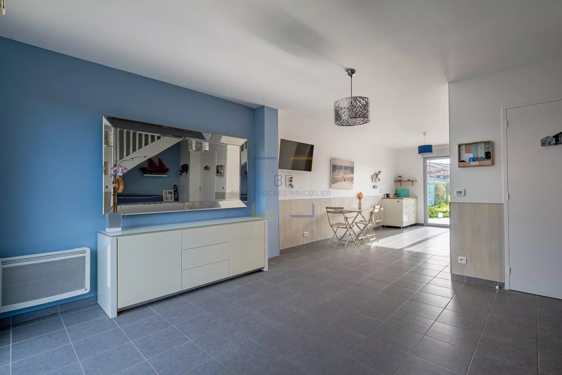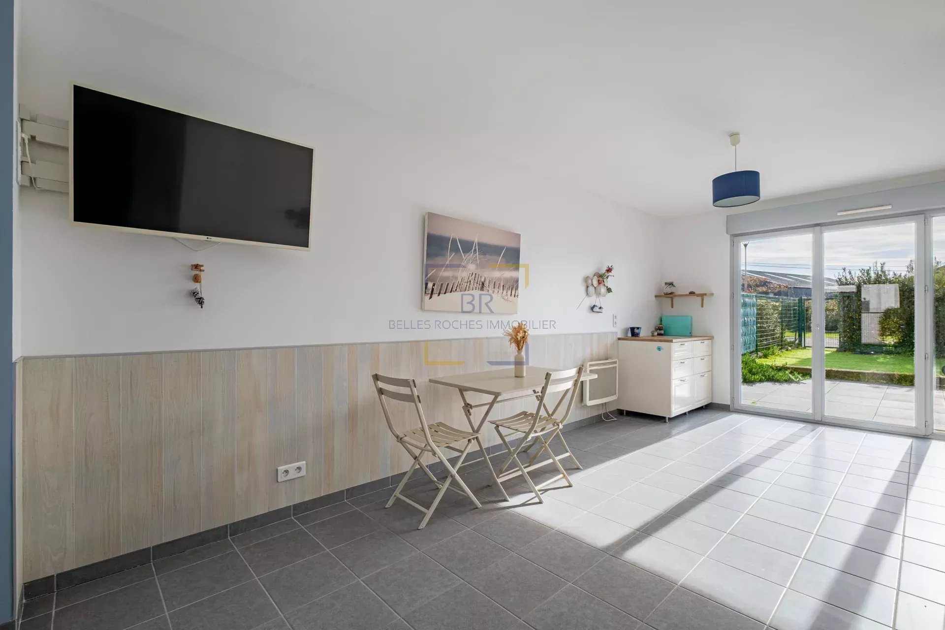 Piriac-sur-Mer, à seulement 1 km de la place du marché et des commerces, dans un petit lotissement, au calme, une maison jumelée de 2012, de 96,56 m2 Carrez (136,6 m2 au sol), rénovée en 2019, comprenant au rez-de-chaussée : une entrée avec escalier vers l’étage, un double séjour traversant avec cuisine ouverte aménagée/équipée et une grande baie donnant sur une terrasse et un jardinet exposés plein Sud, un wc avec lavabo et étagères de rangement permettant l’aménagement d’un espace buanderie.