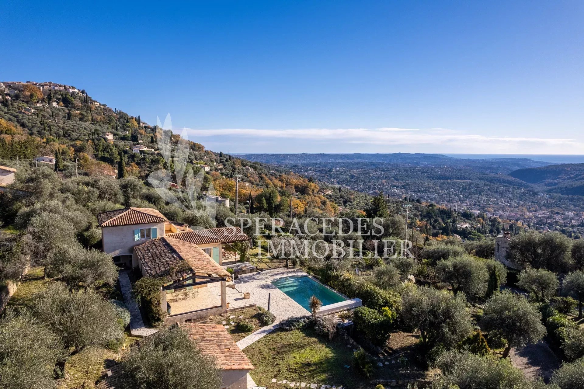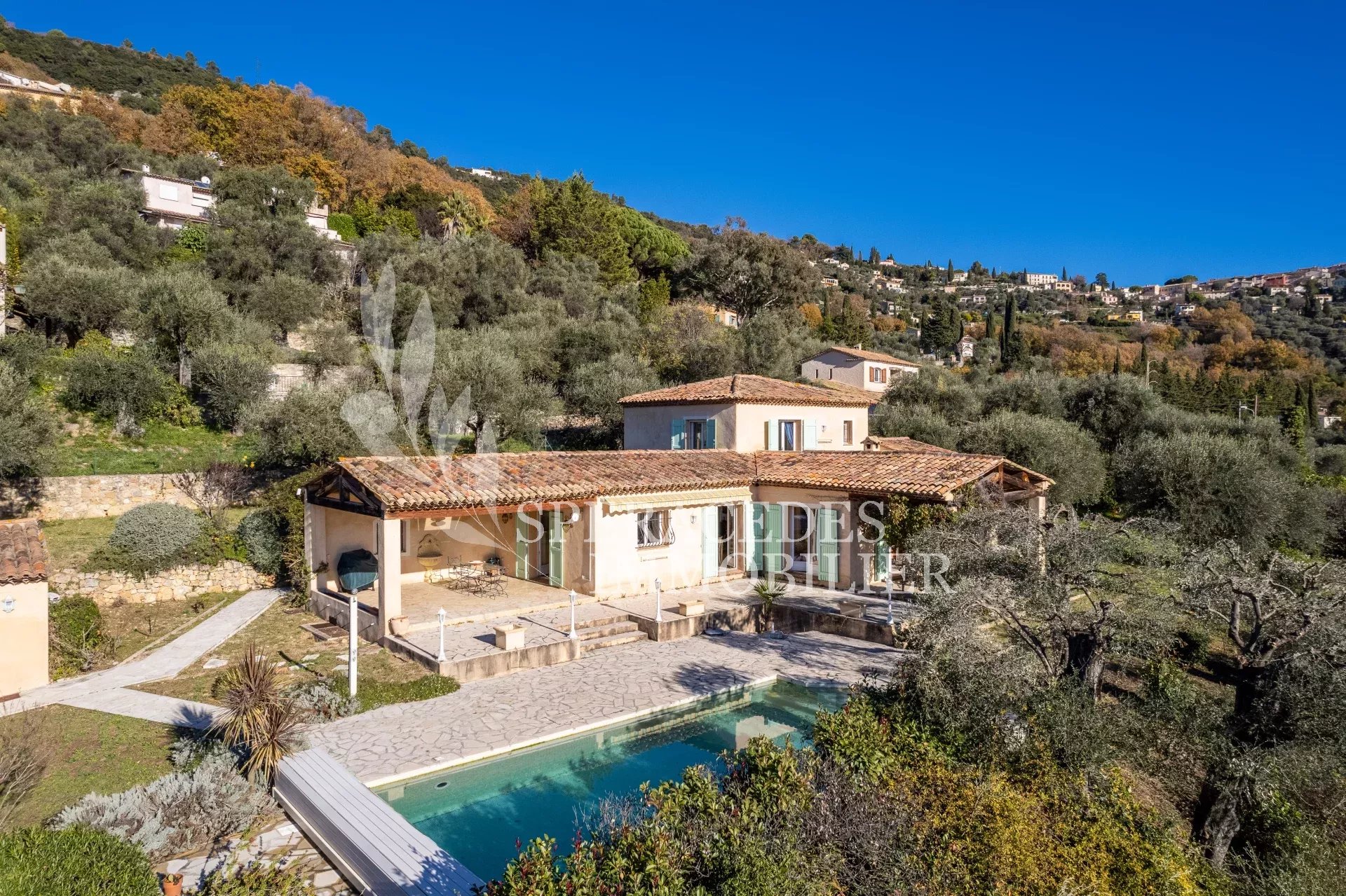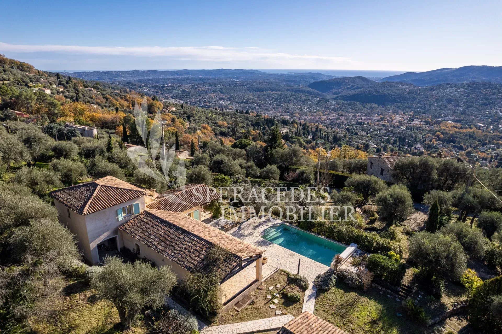 Exclusivité. Cabris, dans un quartier résidentiel calme et recherché, à quelques pas du pittoresque village de Spéracèdes, découvrez cette belle villa traditionnelle d’environ 170 m², offrant une belle vue sur la mer et le lac. Le terrain de 3 210 m², agrémenté de superbes oliviers et de végétation méditerranéenne, crée une atmosphère paisible et accueillante. De plain-pied, la villa se compose d’un grand salon/salle à manger lumineux avec une cuisine ouverte d’environ 78 m², un espace convivial et spacieux. Vous y trouverez également une chambre avec salle d’eau, deux autres chambres et une salle d’eau supplémentaire. Deux grandes terrasses couvertes permettent de profiter du cadre extérieur, idéalement orientées pour profiter de la vue. À l’étage, la chambre principale dispose d’une salle de bains avec douche et d’un dressing, avec accès à une terrasse tropézienne, parfait pour se détendre au soleil. La villa dispose aussi d’une belle piscine de 10 x 5 m avec rideau électrique, d’un garage et d’un abri pour voitures