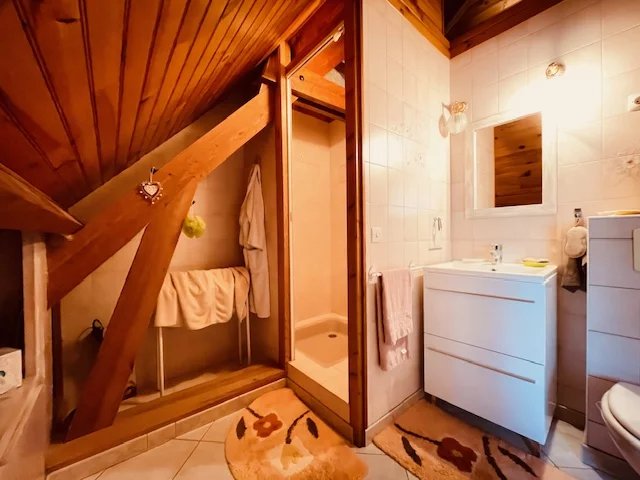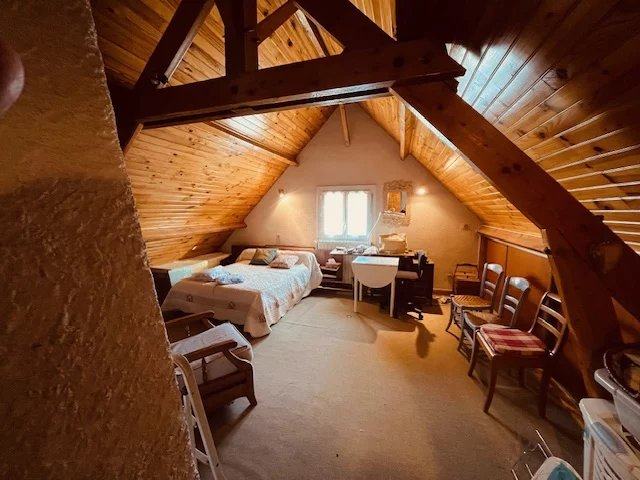 Le niveau supérieur comprend actuellement deux très grandes chambres mansardées avec toits cathédrales d’environ 36 et 26 m² au sol et une salle de douche avec toilettes.