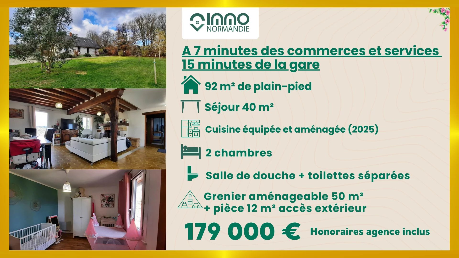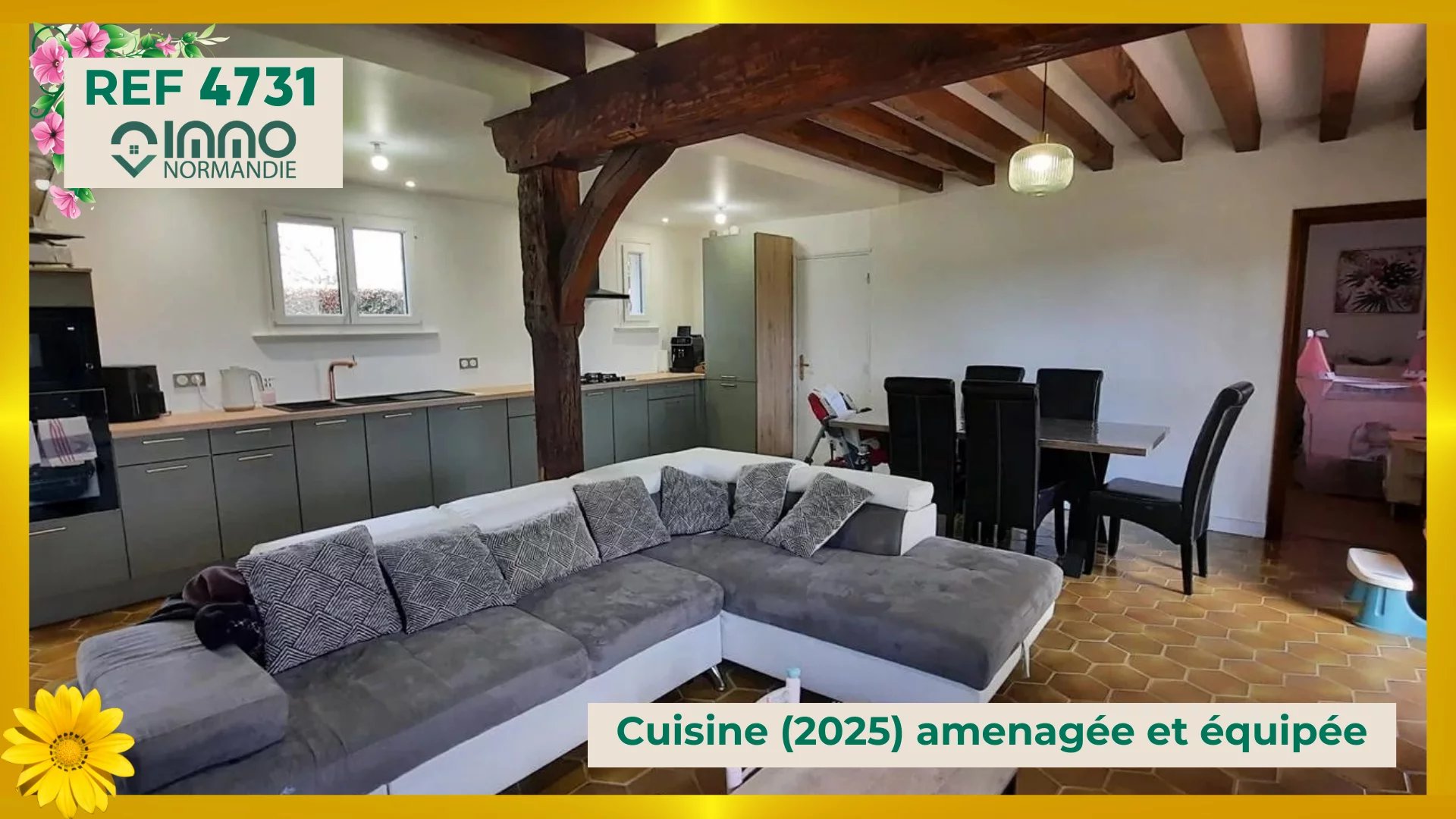 - A 7 minutes des commerces et services ; - 15 minutes de la gare ; Cette maison rénovée vous propose 80 m² de vie de plain-pied + une pièce de 12 m² aménagée à l'étage + grenier de 50 m² environ AU REZ DE CHAUSSÉE : - Séjour 40m², belle cheminée avec poèle à bois ouvrant sur terrasse offrant une belle vue panoramique sur la campagne Normande ; - Cuisine équipée et aménagée (2025) ; - Chambre parentale (13m²) ; - Salle de douche (2024) ; - Toilettes séparées ; - Deuxième chambre (11 m²) ; - Une pièce avec trémie menant à l'étage en attente de la pose d'un escalier ; A L'ÉTAGE : - Une pièce aménagée (17m²), accès par escalier extérieur ; - Un grenier d'environ 50 m² à aménager avec velux, eau et électricité ; EXTÉRIEURS : - Beau terrain clos et arboré de 2000 m² ; - Double garage de 38m² environ ; - Hangar de 250 m² environ ; UNE VIE TRANQUILLE PROCHE DES COMMODITÉS. Agence IMMO-NORMANDIE 4 agences Pour vous accompagner dans votre Projet immobilier -- LA BARRE EN OUCHE -- BEAUMONT LE ROGER -- -- BRIONNE -- THIBERVILLE -- Retrouvez toutes nos annonces et vidéos sur notre site www.immonormandie.fr Contact : Benjamin ROMUALD -06.33.72.85.24- entrepreneur individuel (E.I.) agissant en sa qualité d'agent commercial, inscrit au Registre Spécial des Agents Commerciaux sous le numéro RSAC 812 264 455 00013