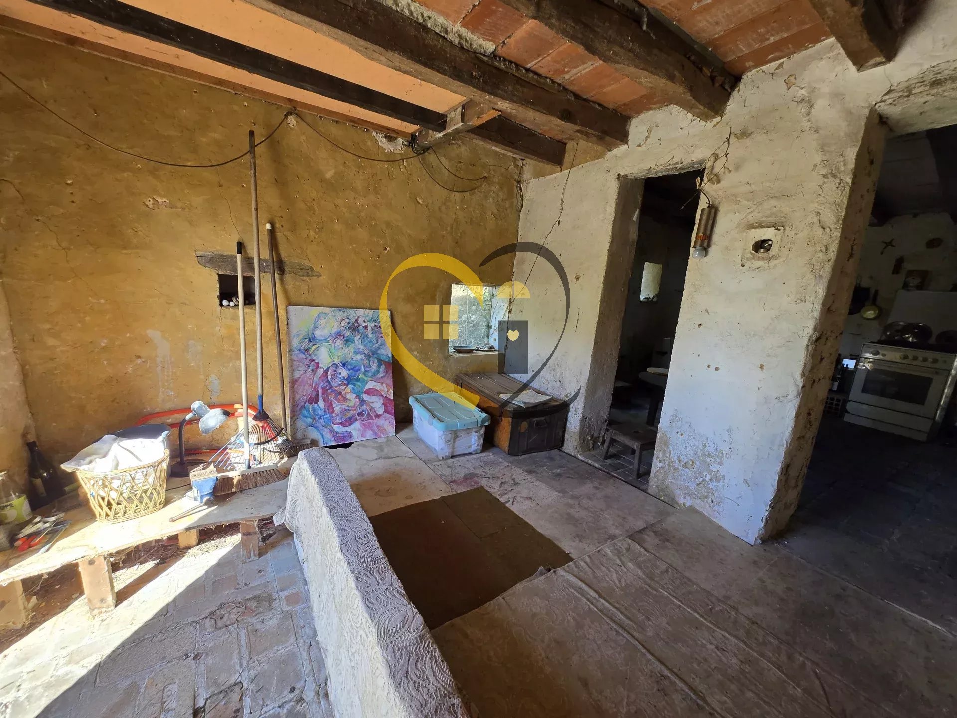 Composée de 3 pièces principales (entrée, salon, salle à manger, cuisine, buanderie et grenier), cette bâtisse est actuellement inhabitable en l'état. Prévoir une rénovation complète, notamment l’installation d’un système d’assainissement.