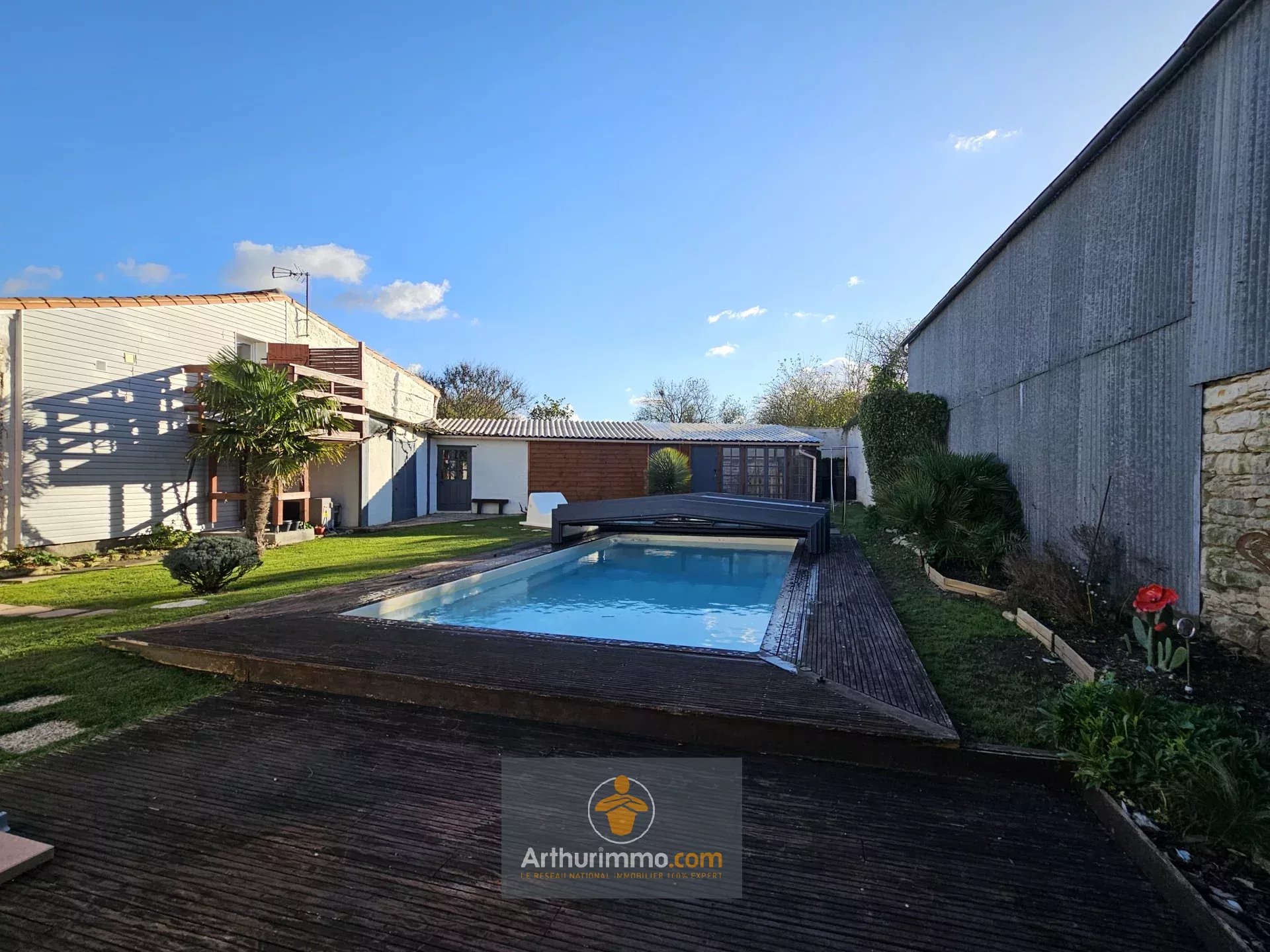 Belle maison familiale avec appartement 1 chambre indépendant, 4/5 chambres, dont une suite parentale, deux salles de bains/eau, jardin clos, piscine, parking couvert pour deux voitures, tout-à-l'égout, double vitrage PVC. Découvrez cette belle maison sur deux niveaux, avec un jardin clos de 705 m², une piscine chauffée avec dôme et bain à remous. Rez-de-chaussée : entrée, cuisine, séjour, salle à manger, cellier, chaufferie, salle de bain/douche, toilettes, une suite parentale avec salle d'eau et dressing. Étage : une mezzanine, quatre chambres dont une deuxième suite parentale avec salle d'eau/WC. Des greniers, un grand garage avec studio de musique, des dépendances et un appartement indépendant avec cuisine/salon, salle d'eau/WC, une chambre. Contactez votre agence immobilière Arthurimmo.com Courçon (17170) idéalement située au cœur du Marais Poitevin ! À seulement 20 minutes de La Rochelle (17000) 25 minutes de Niort (79000) Village dynamique avec écoles, collège, activités sportives, marché et commerces Accès direct à la voie rapide 5 minutes pour rejoindre Ferrières d'Aunis (17170) et sa zone commerciale 15 minutes pour Surgères (17700) et sa gare TGV Pour toutes vos transactions immobilières, contactez-nous dès aujourd'hui.
