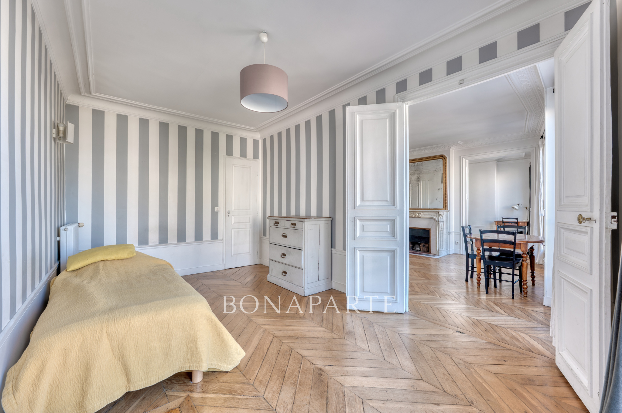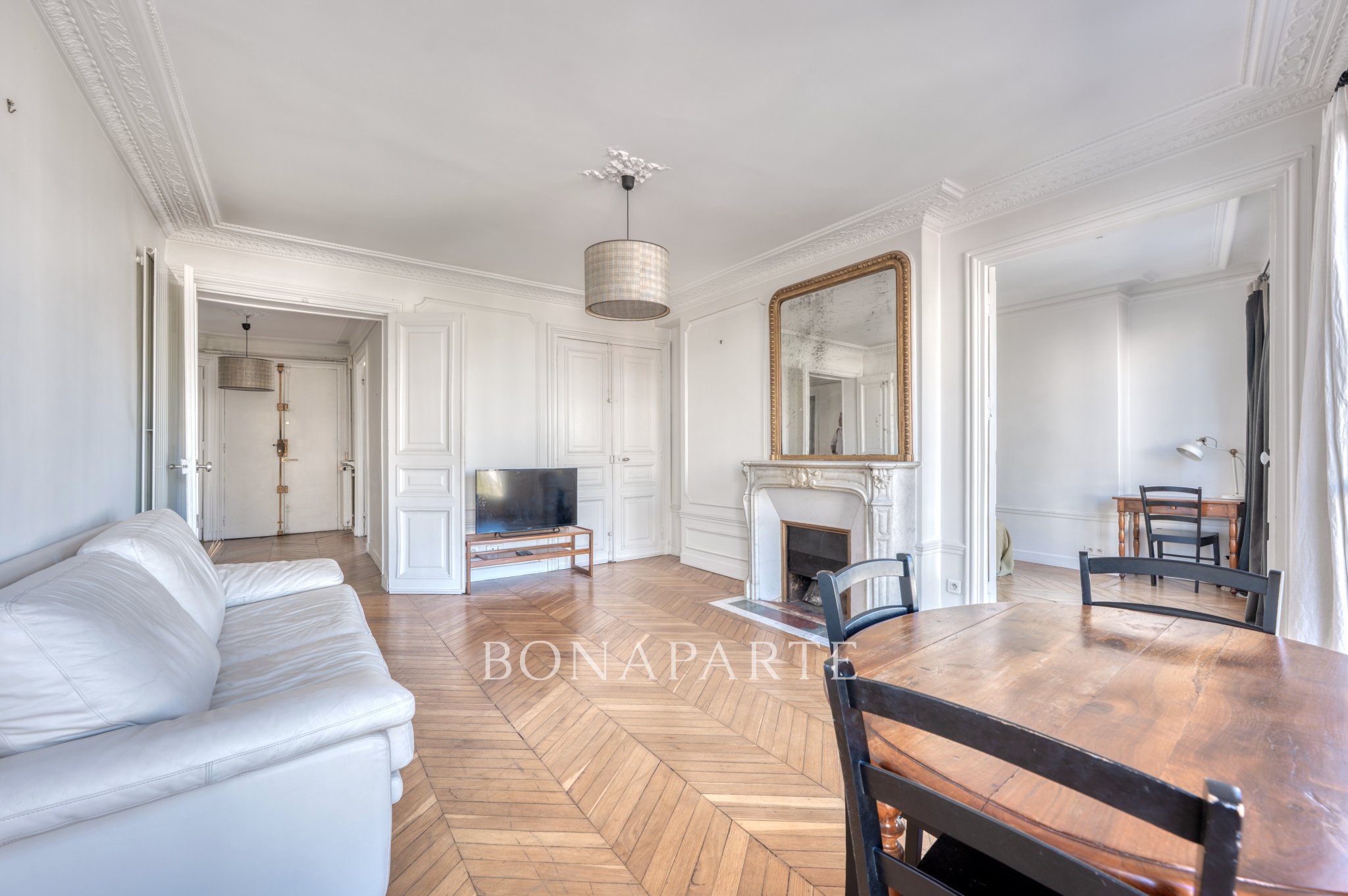 Traversant, l'appartement bénéficie d'une circulation fluide et d'un agencement harmonieux. Dès l'entrée, le charme de l'ancien s'impose : parquet en point de Hongrie parfaitement conservé, moulures fines soulignant les hauteurs sous plafond, cheminées d'époque dans plusieurs pièces. Le séjour, agréable et lumineux, s'ouvre sur le balcon et offre une perspective claire sur les toits et les alentours. Les trois chambres, bien proportionnées, permettent diverses configurations selon les besoins, qu'il s'agisse de créer un espace nuit, un bureau ou une chambre d'enfant.