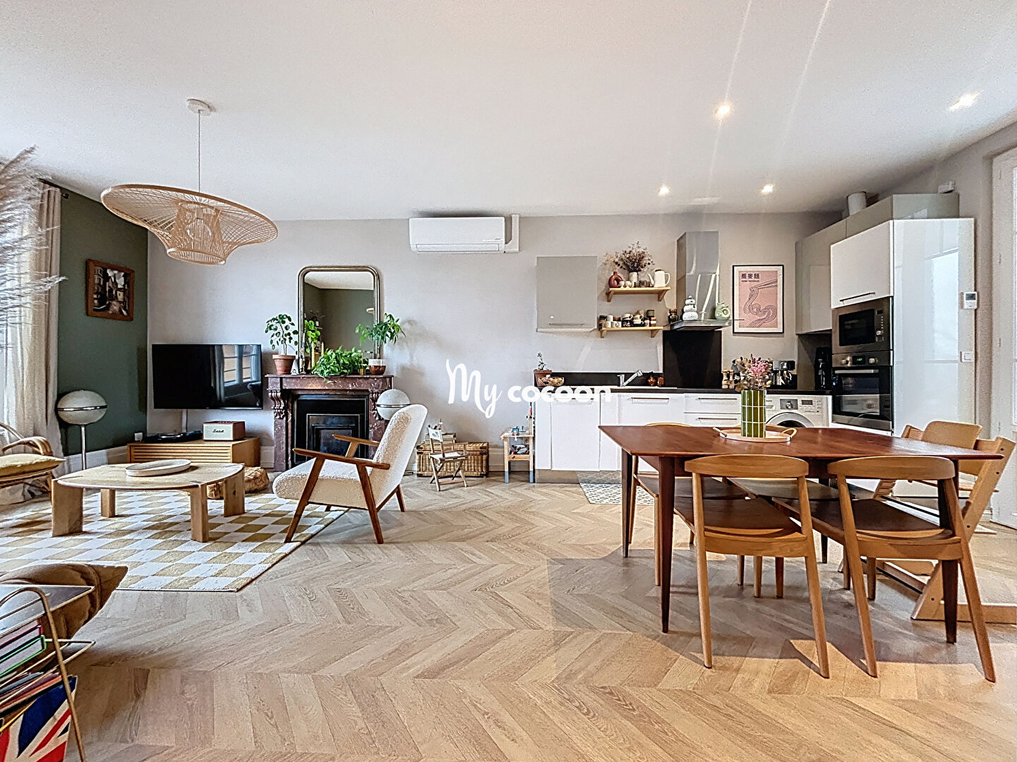 Votre agence Nestenn Croix Rousse et Caluire vous propose en exclusivité ce splendide T4 transformé en vaste T3, entièrement rénové avec des prestations haut de gamme, situé au 5ème étage d'une résidence de bon standing parfaitement entretenue, au calme dans le bourg de Caluire, à deux pas des commerces, transports, écoles et de la voie verte. Il est composé d'une belle entrée avec grand placard et espace buanderie, d'un superbe séjour de près de 35 m² baigné de lumière avec c