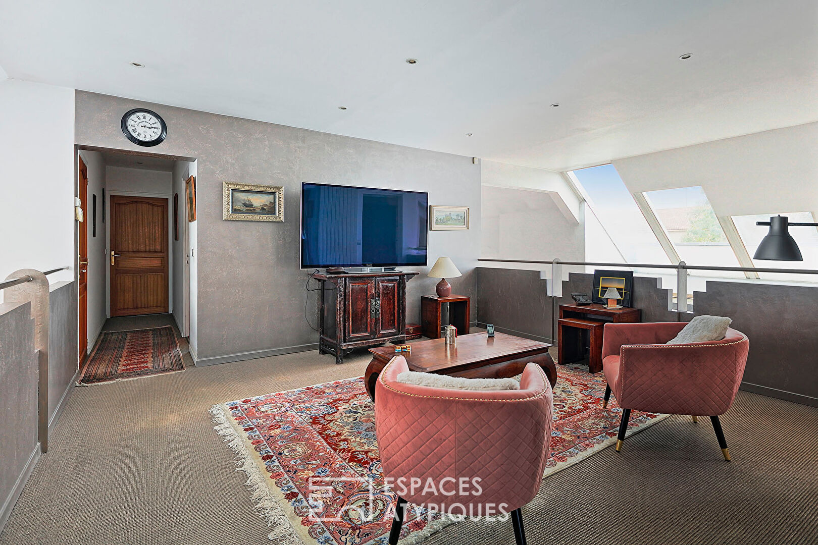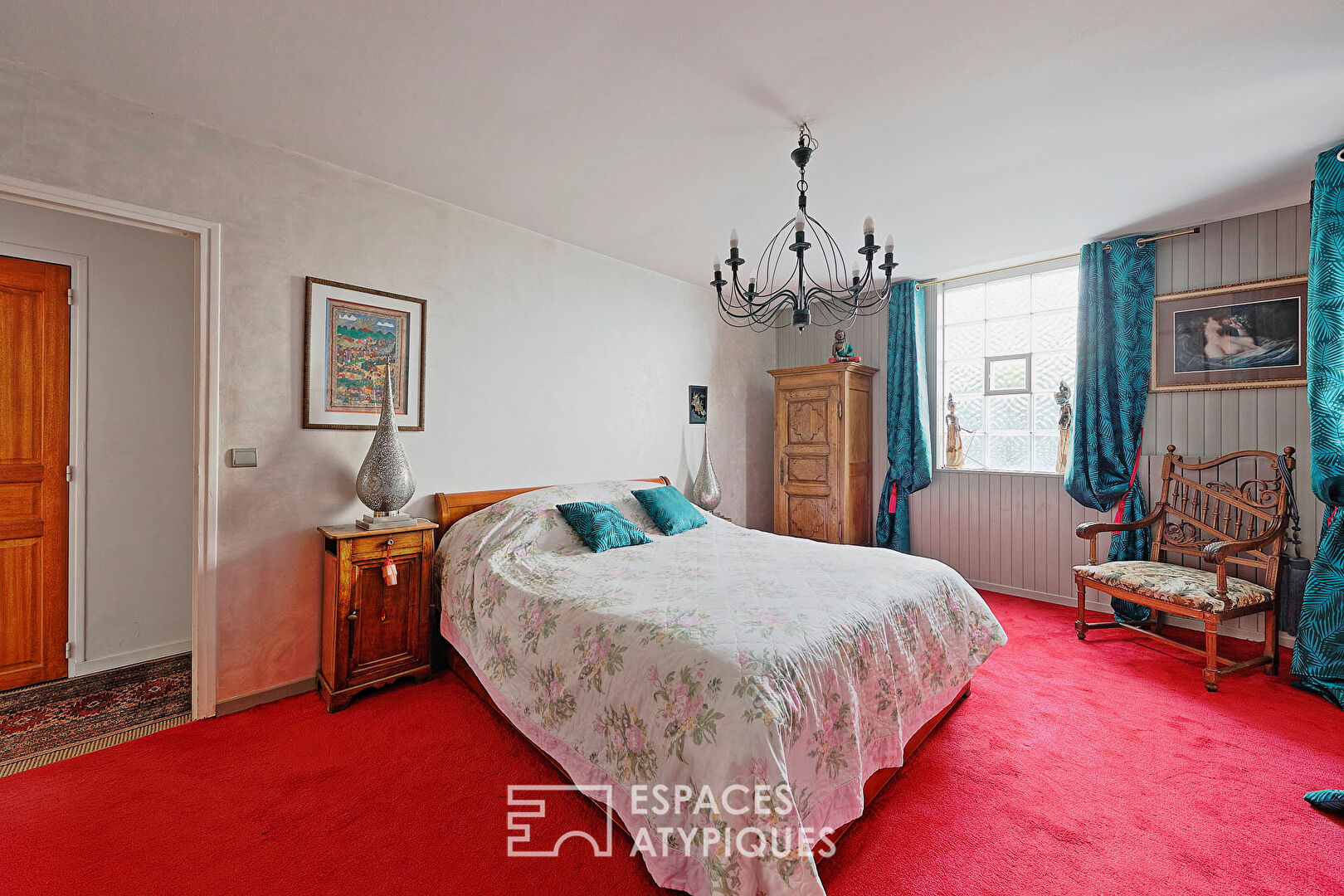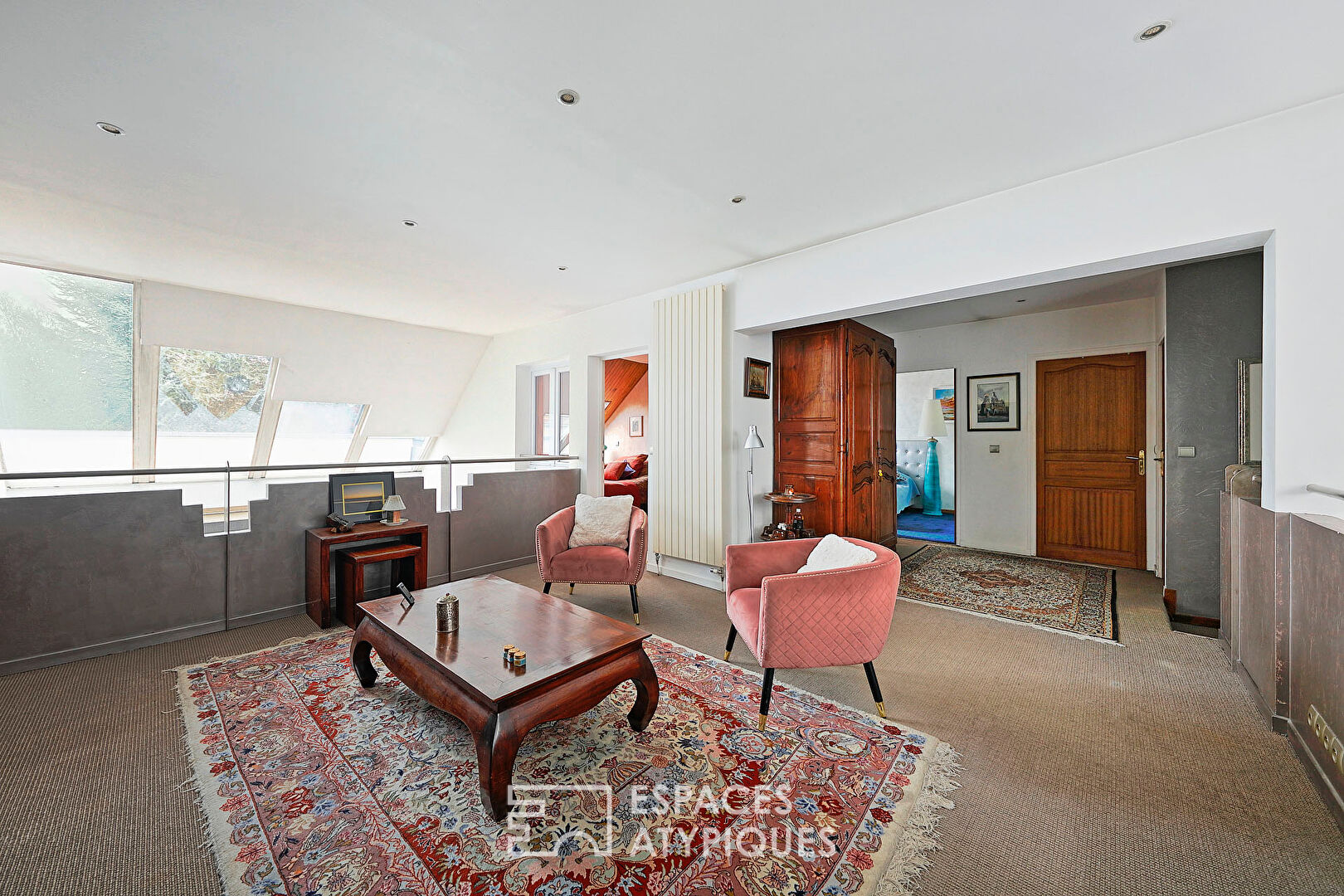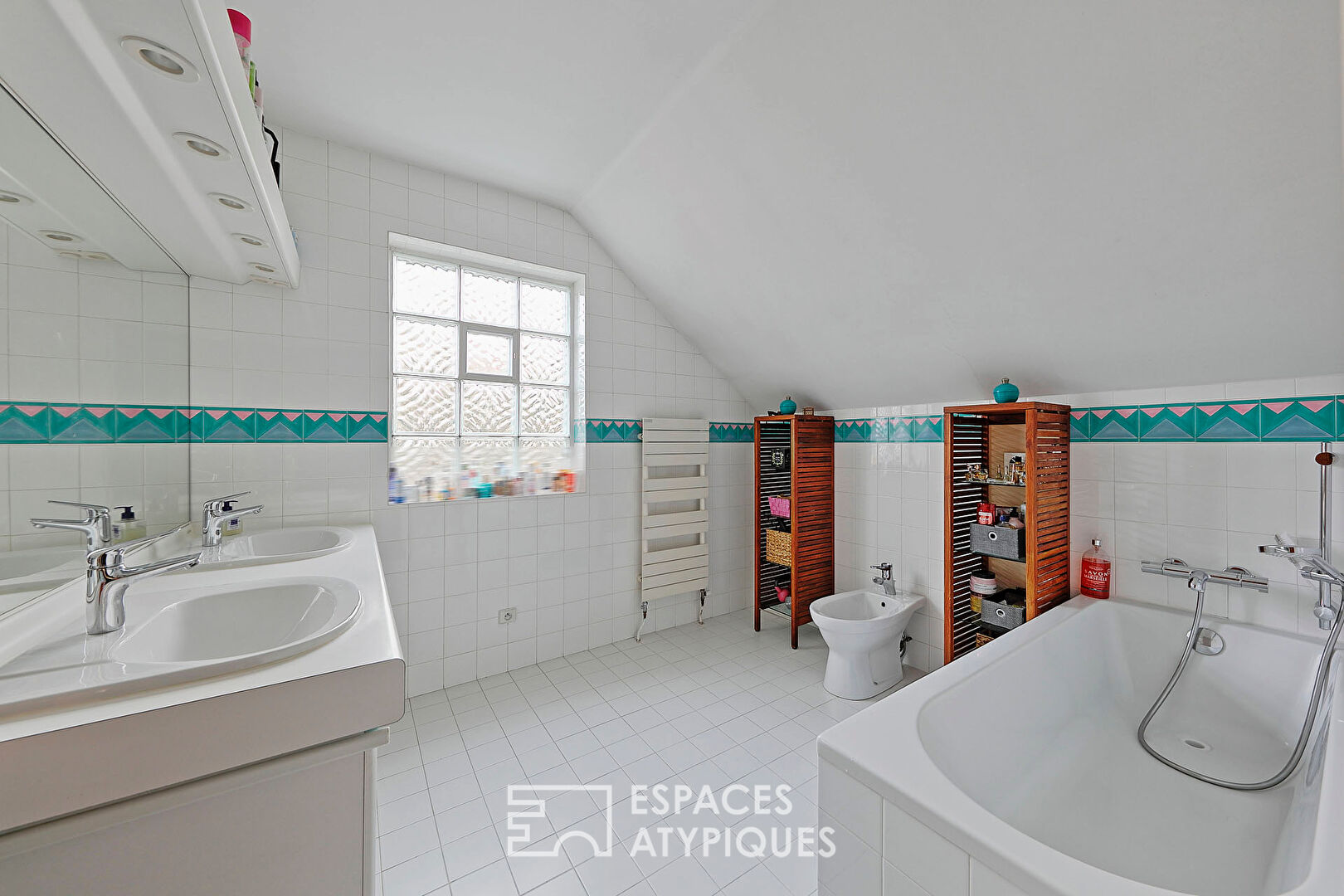 EN EXCLUSIVITE Au coeur de Meaux, dans le quartier des écoles et à proximité immédiate du centre historique, cette maison d'architecte aux lignes résolument contemporaines déploie 265m² sur un terrain intimiste agréablement paysagé, dans une allée sécurisée par un portail. Érigée dans un ancien hangar réhabilité dans les années 90, elle offre de très généreux volumes, une belle hauteur sous plafond et une luminosité permanente grâce à ses nombreux puits de lumière, incrustation de pavés de verres dans les murs et larges baies vitrées. La vie de plain-pied est possible, et les espaces extérieurs, terrasses et jardin clos prolongent naturellement la maison. Le rez-de-chaussée accueille une entrée avec cabinet de toilette et sanitaires indépendants. Sur la droite, une cuisine dinatoire contemporaine entièrement équipée bénéficie d'une large baie vitrée ouvrant sur la terrasse. Une grande buanderie et un cellier complètent cet espace fonctionnel. Sur la gauche, une très vaste pièce de vie dont les légères différences de niveau délimitent avec harmonie les différents espaces : salle à manger, salon et bibliothèque autour d'une cheminée suspendue, bureau. Deux chambres, chacune avec salle de bain privative, complètent ce niveau, dont une avec accès direct au jardin. L'étage présente une mezzanine spacieuse ouverte sur la pièce de vie, deux chambres supplémentaires avec dressings se partagent une salle de bain et des sanitaires indépendants. Une chambre parentale, avec salle d'eau attenante en mosaïque anthracite, complète ce niveau. Le jardin clos, soigneusement paysagé, offre une atmosphère confidentielle, protégée des regards et du bruit, rare en coeur de ville. Les massifs et essences variées y évoluent au rythme des saisons. Deux places devant le portail permettent le stationnement et un box proche de la maison complète les prestations. Commerces, écoles et transports sont accessibles à pied, facilitant le quotidien. Cette maison d'architecte, chaleureuse et singulière, séduira par son caractère atypique et la qualité de ses volumes et fera le bonheur d'une famille en quête d'une vie urbaine sans ses inconvénients. Classe énergie : C / Classe climat : C Montant des dépenses annuelles d'énergie pour un usage standard établi à partir des prix de l'énergie indexés sur les années 2021, 2022,2023 (abonnement compris) entre 2610 euros et 3590 euros par an. Contact : Elvire de la MARTINIERE - 06 03 05 05 96 RSAC : 800 930 232 MEAUX Elvire DE LA MARTINIERE (EI) Agent Commercial - Numéro RSAC : 800 930 232 - MEAUX.