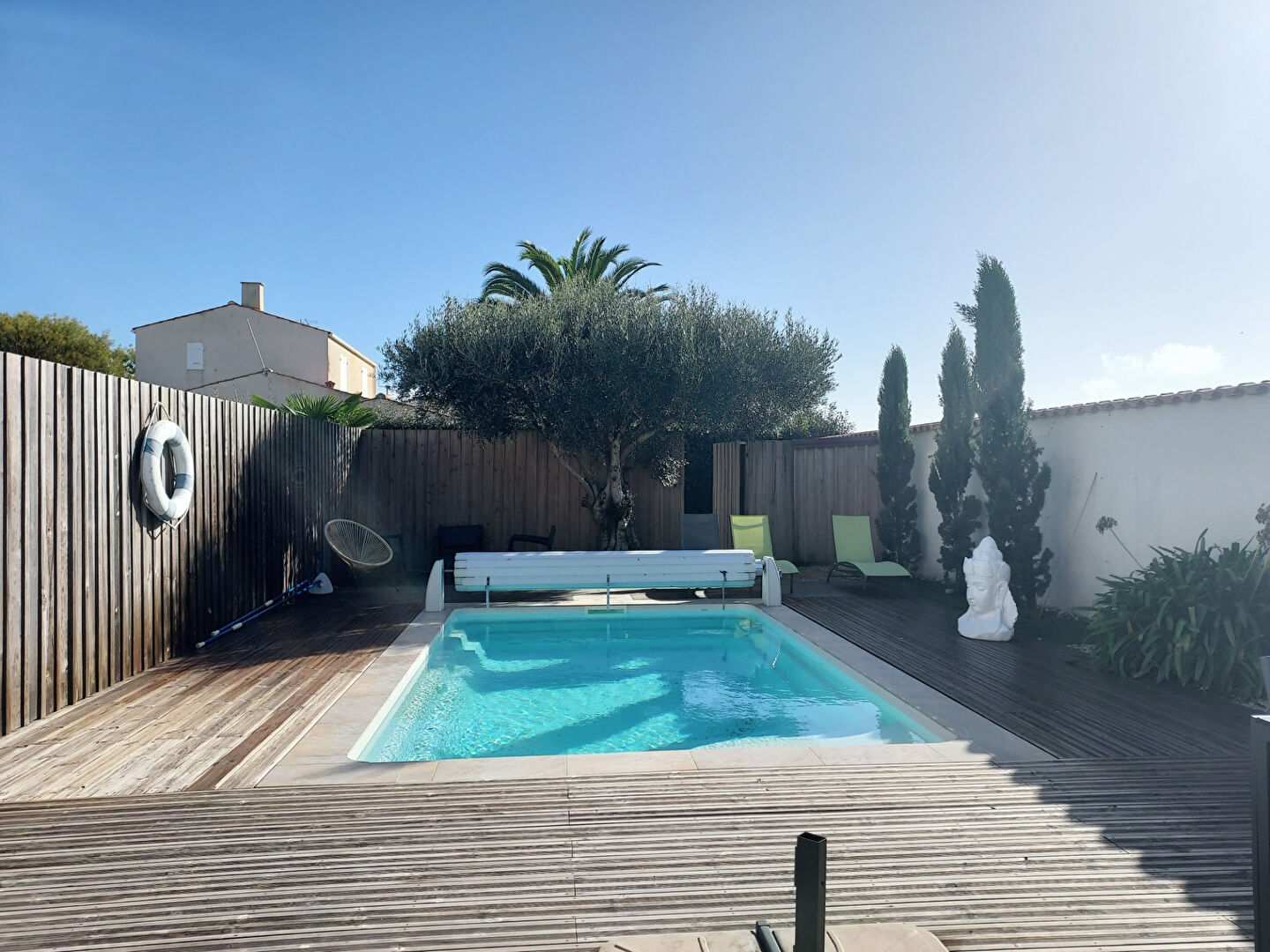 Sur un terrain clos et paysager de 1 158 m², commerces et services à pied, MAISON D'ARCHITECTE d'environ 179 m² habitables avec piscine enterrée sécurisée et chauffée, comprenant un hall d'entrée, un salon/séjour avec cheminée d'environ 55 m², une cuisine équipée ouverte de 16 m², une arrière cuisine de 11,60 m², un dégagement desservant une chambre parentale de 18 m² avec dressing, une salle de bains/douche et WC, une seconde chambre avec placards de 11,60 m² avec une salle d'eau/WC, une chambre de 9 m², des WC séparés avec lave-mains - A l'étage, une mezzanine d'environ 20 m², une coursive et une quatrième chambre avec placard de 12,40 m² avec salle d'eau/WC - Un balcon de 15 m² avec vue dégagée - Un garage de 32 m² - Une cave climatisée - MAISON ANNEXE indépendante d'environ 74 m² habitables avec piscine enterrée, sécurisée et chauffée comprenant un séjour avec cuisine équipée, un dégagement desservant deux chambres avec salle d'eau et WC séparés - Exposition sud - Port de plaisance à 1,3 km - Belles prestations (3.77 % honoraires TTC à la charge de l'acquéreur.)
