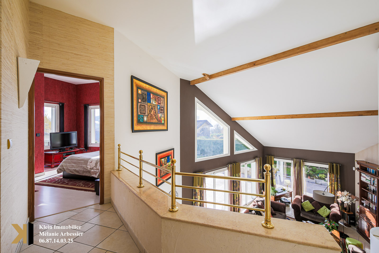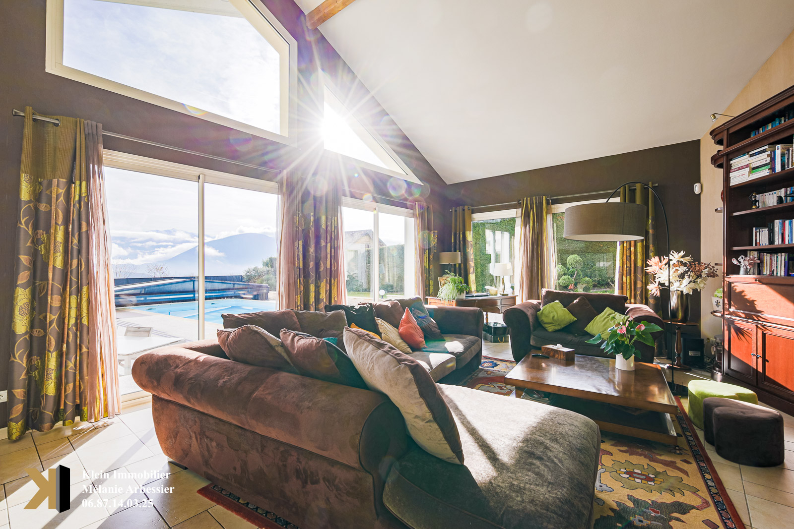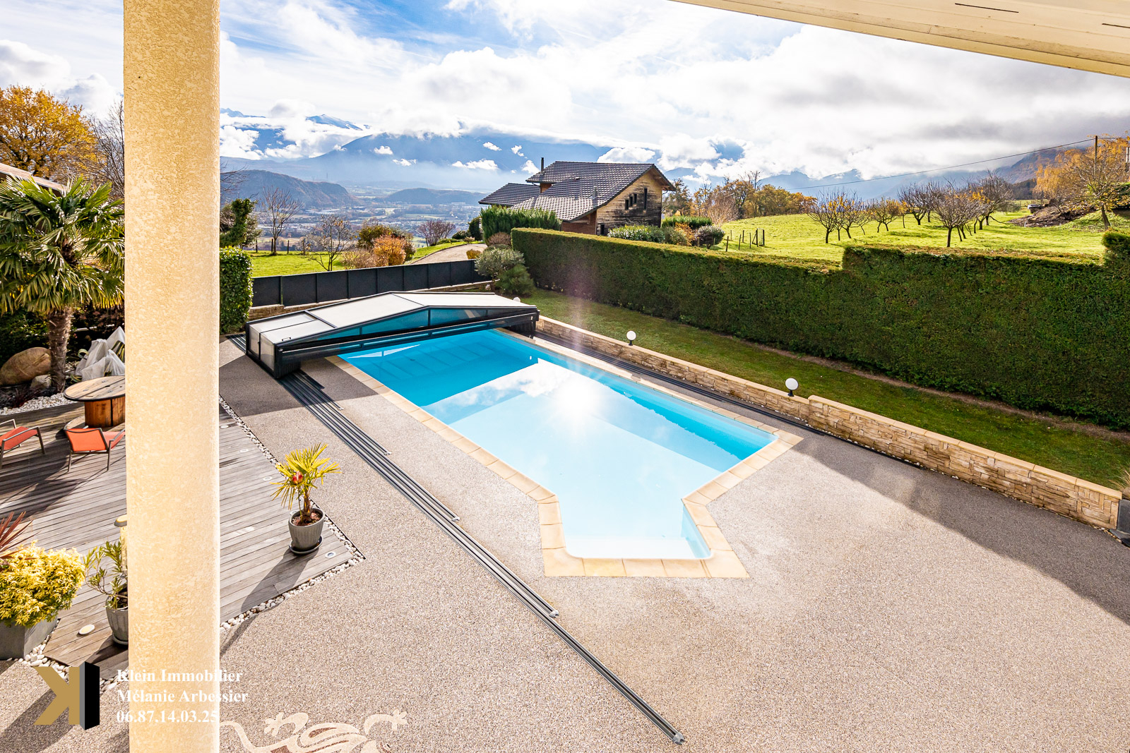 MAISON D'ARCHITECTE D'EXCEPTION A CLAIX Le cabinet Klein vous propose cette superbe maison d'architecte construite en 1999, située sur les hauteurs de Claix, dans un environnement paisible en pleine nature. Cette propriété unique offre une vue sur les montagnes environnantes, tout en étant idéalement placée à seulement cinq minutes du village et de toutes les commodités. D'une surface habitable de 168 m², cette maison lumineuse et spacieuse se compose de cinq pièces. Le coeur de la maison est un vaste séjour doté d'un plafond cathédrale impressionnant de 7,30 mètres de hauteur et d'une superbe cheminée qui apportent une sensation d'espace et d'élégance. Les grandes baies vitrées inondent la pièce de lumière naturelle tout en offrant une vue dégagée sur l'extérieur. La cuisine, récemment rénovée et équipée par Mobalpa, allie design moderne et fonctionnalité. Les espaces nuit comprennent trois belles chambres, dont deux suites parentales à l'étage, chacune avec leur propre salle de bains. Une troisième salle de bains complète également les installations pour un confort optimal. A l'extérieur, le terrain de 1 101 m² est aménagé pour profiter pleinement de chaque saison. Une piscine avec abri est entourée d'une grande terrasse en résine, idéale pour se détendre ou recevoir vos proches. Un pool house complète cet espace. La maison dispose également d'un garage double de 32,5 m² et de plusieurs places de parking extérieures, permettant de stationner en toute facilité. Cette propriété bénéficie d'équipements de qualité, comme une cheminée à insert rétractable. Les fenêtres sont équipées de double vitrage et de volets roulants électriques, garantissant confort thermique et isolation. Le chauffage est assuré par une chaudière au fioul WEISHAUPT, installée en 2000, et la maison est également équipée de la climatisation pour les chaudes journées d'été. DPE : D Infos toiture : Entretenue et nettoyée en 2023 Planche de rive en aluminium Contactez-moi dès aujourd'hui pour plus d'informations ou pour organiser une visite : Mélanie Arbessier O6 87 14 03 25 m.arbessier@klein-immobilier.com Mélanie ARBESSIER (EI) Agent Commercial - Numéro RSAC : - .